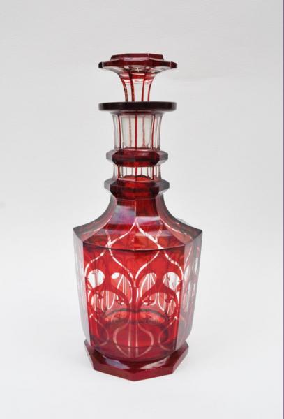 karafa se zátkou, fazetově broušené sklo s červenou lazurou, stylizovaný neogotický dekor, Čechy, kolem roku 1880, bez poškození; výška se zátkou 25 cm