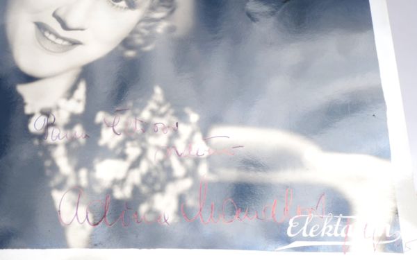 dobová fotografie herečky Adiny Mandlové s věnováním, reklamní ateliérová fotografie filmové a produkční společnosti Elektafilm, Protektorát Čechy a Morava, rok 1940, rozměry 30 x 24 cm; sběratelsky zajímavé