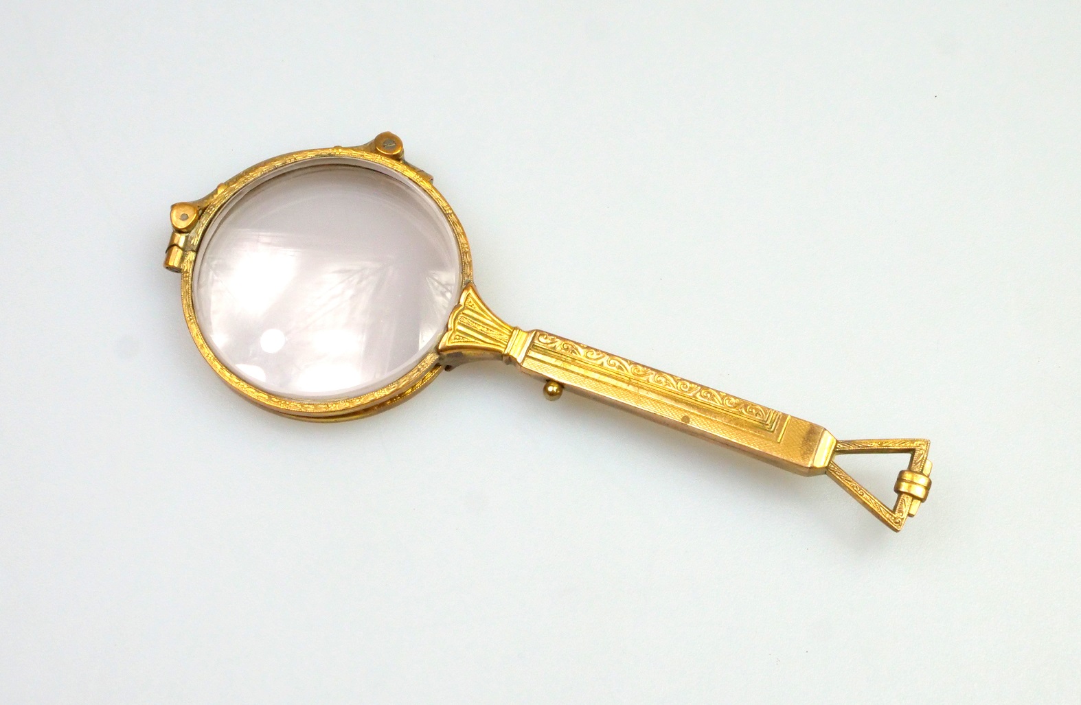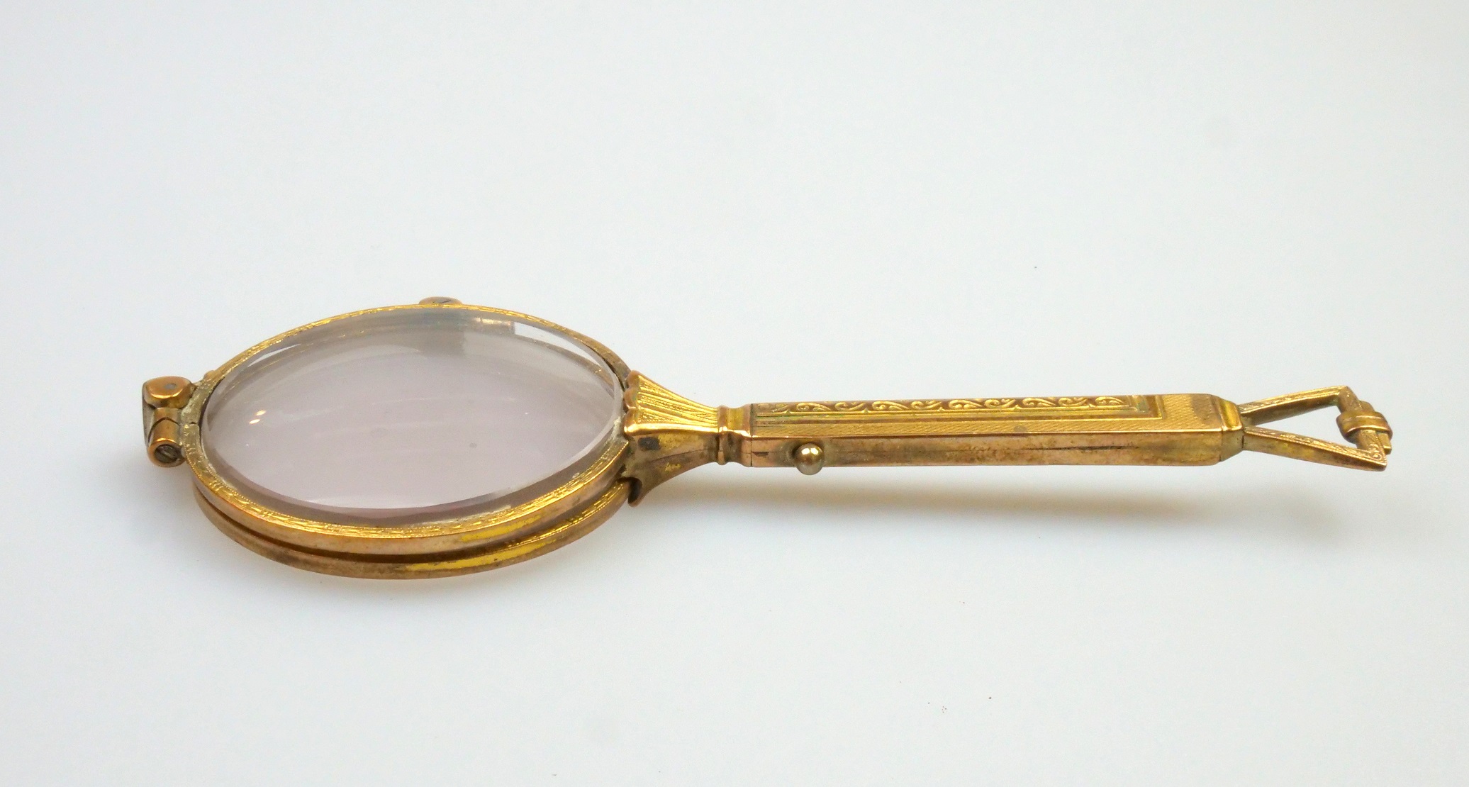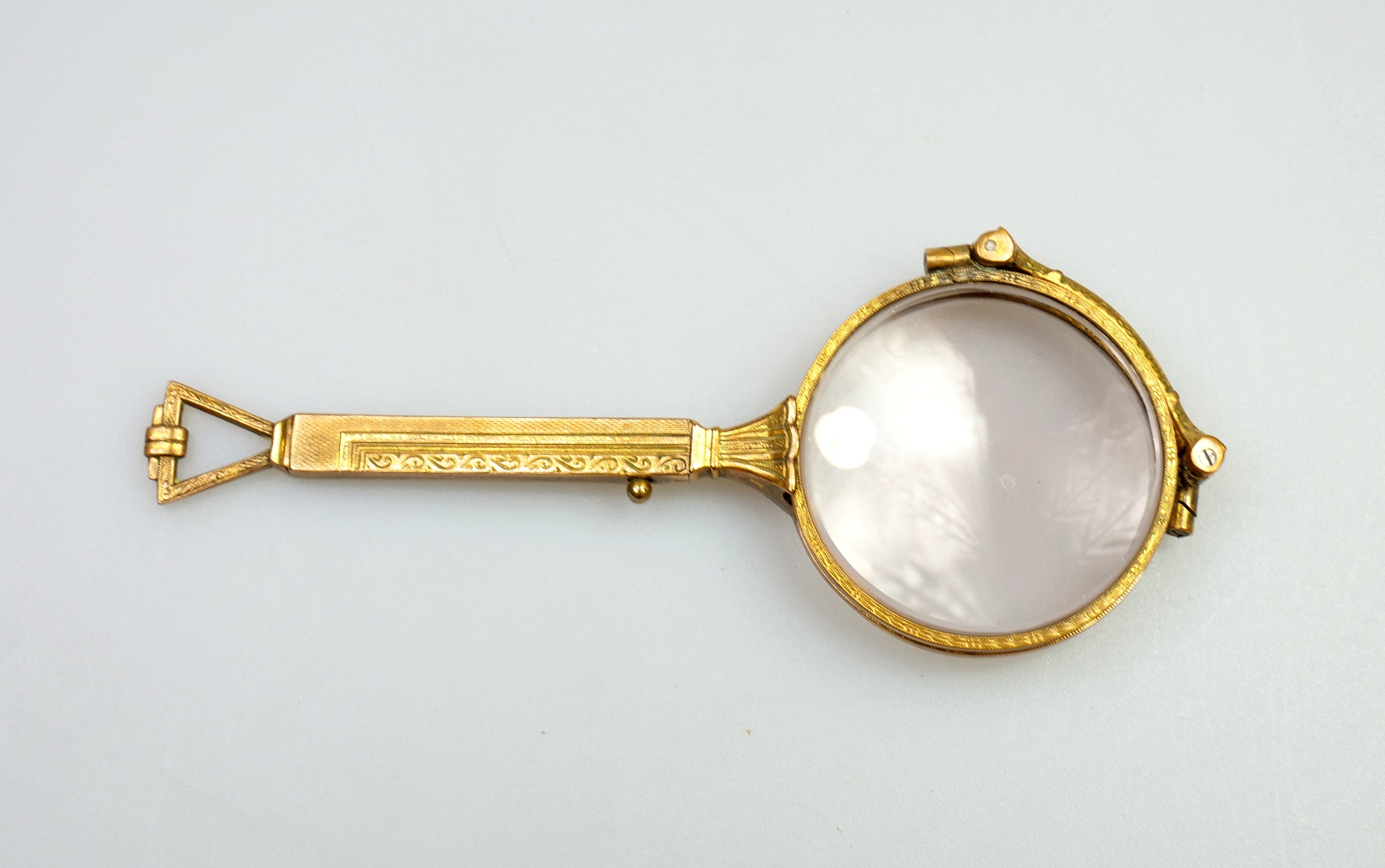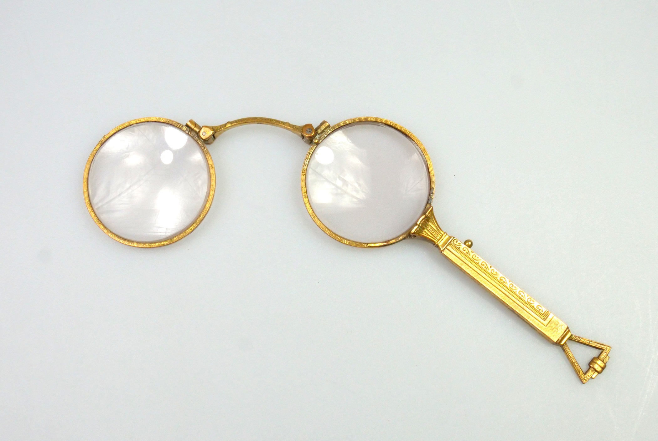 art deco lorňon ze zlaceného obecného kovu, funkční mechanismus, nepoškozená dioptrická skla, délka s rukojetí 11 cm, průměr očnic 4 cm, střední Evropa, kolem r. 1925