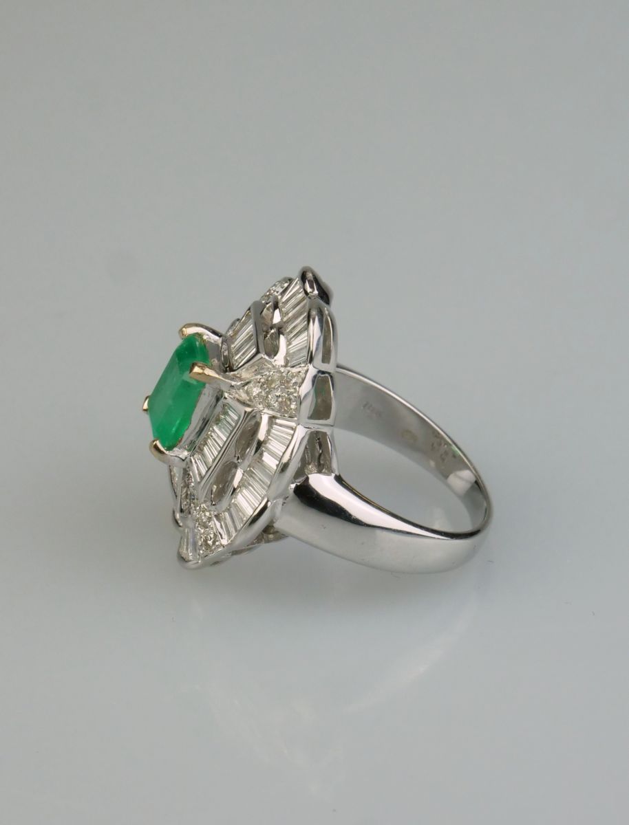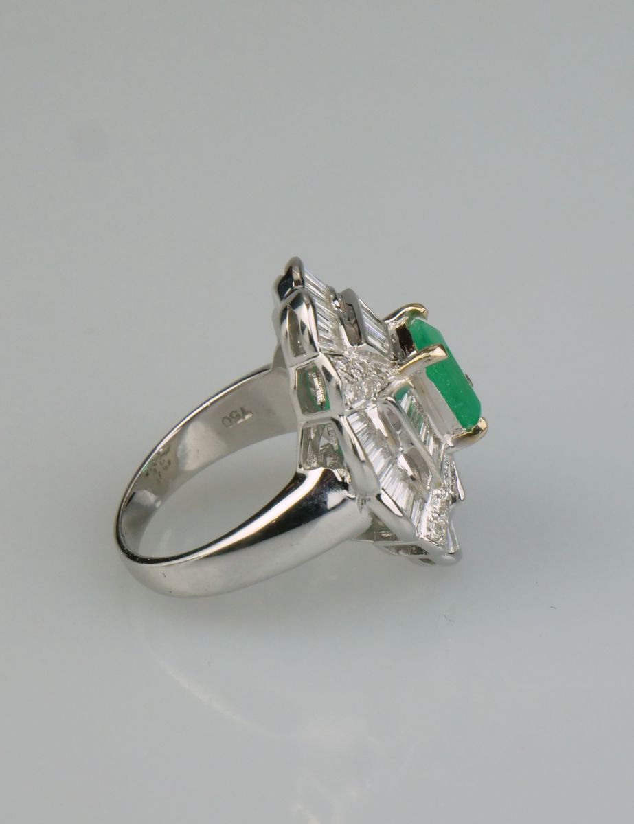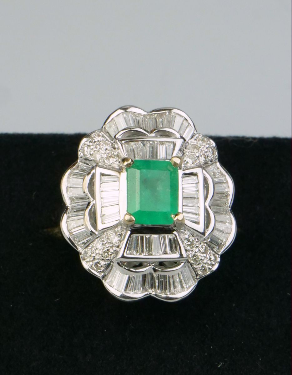 dámský zlatý prsten s kvalitním smaragdem o hmotnosti 1,7 ct a diamanty brusu briliant a bageta o hmotnosti 1,60 ct, Au btto 11,18g/750/000, západní Evropa, kolem r. 1990; velikost prstenu 54; znalecký posudek