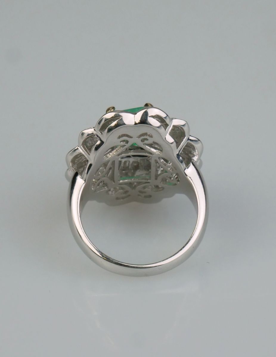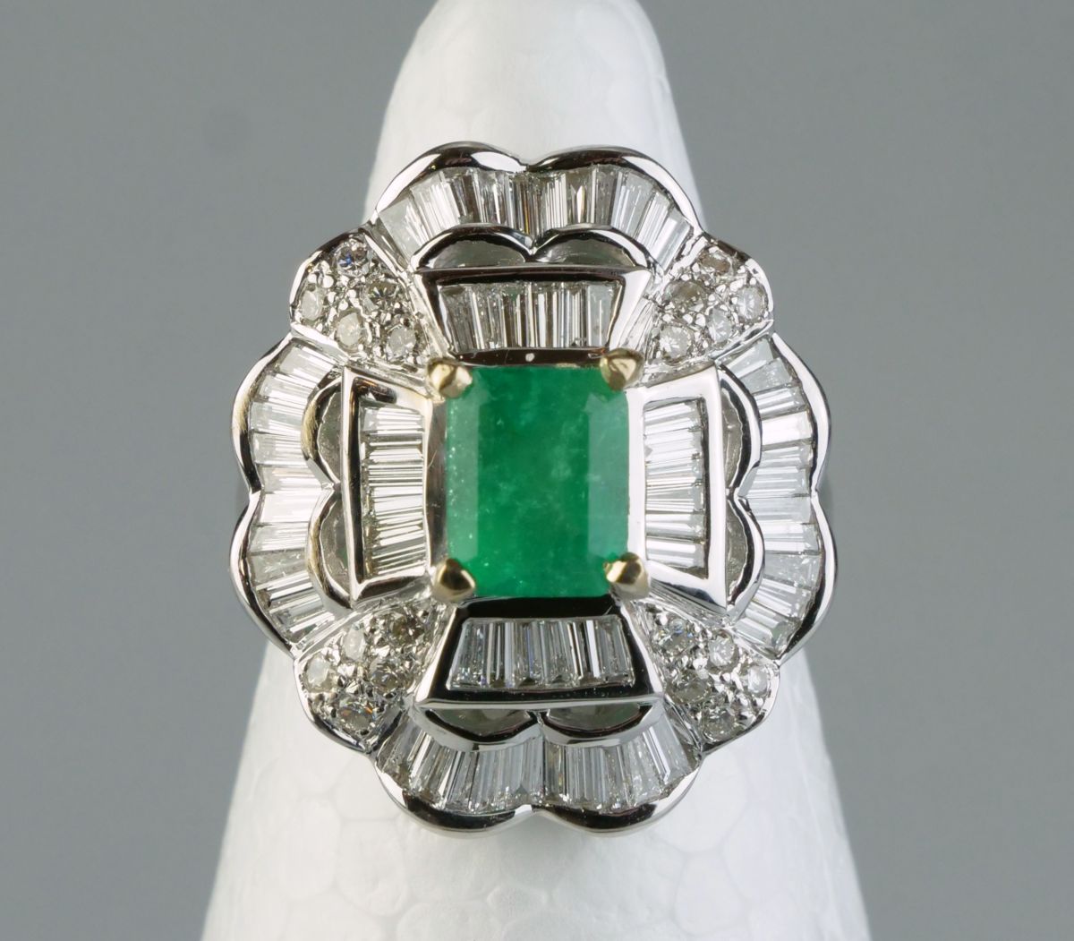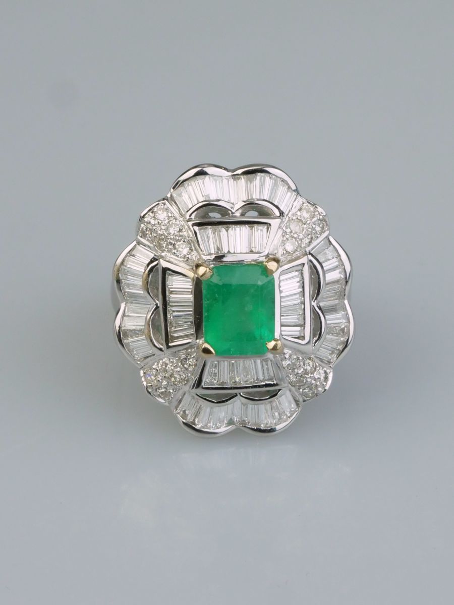 dámský zlatý prsten s kvalitním smaragdem o hmotnosti 1,7 ct a diamanty brusu briliant a bageta o hmotnosti 1,60 ct, Au btto 11,18g/750/000, západní Evropa, kolem r. 1990; velikost prstenu 54; znalecký posudek