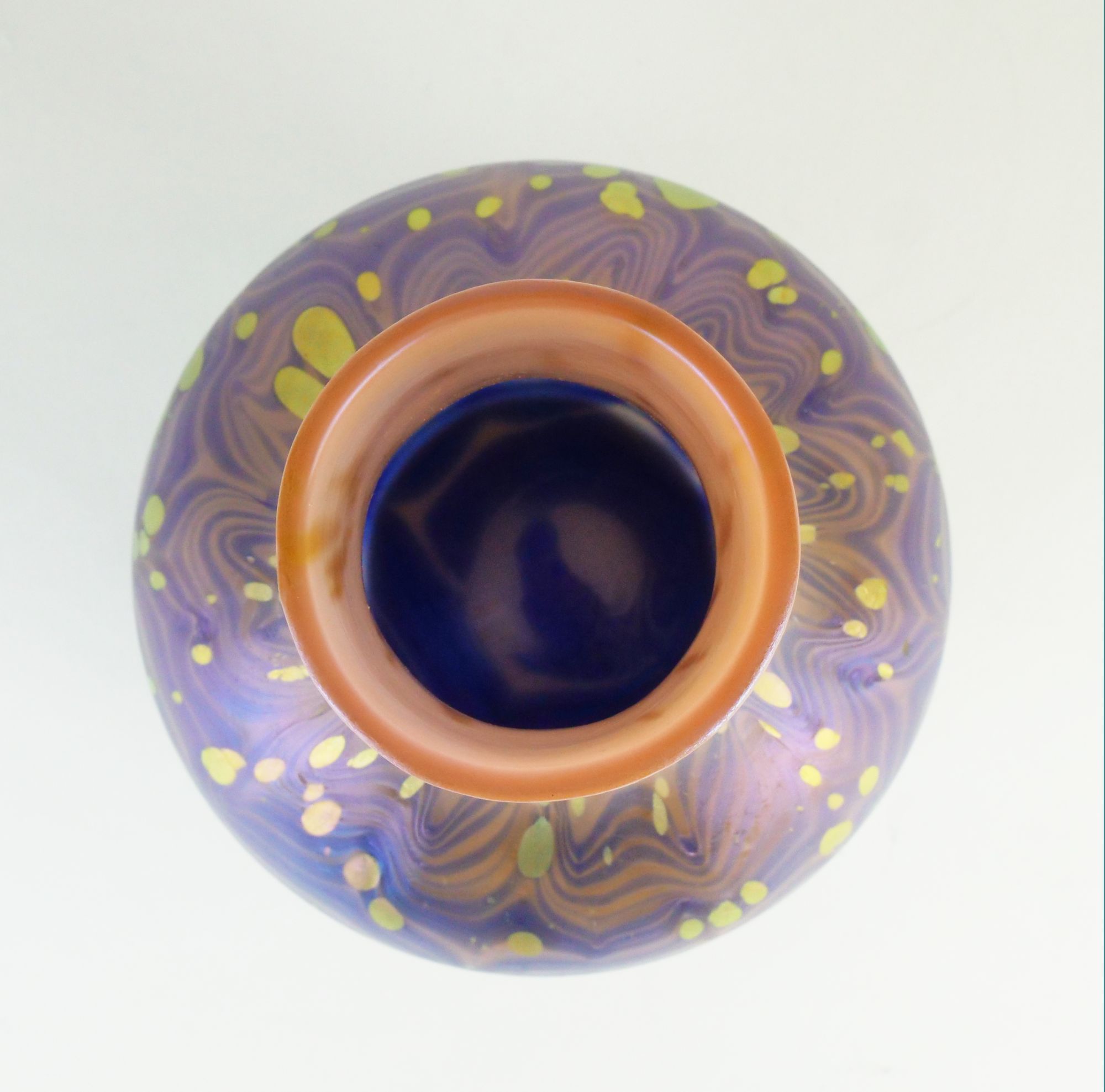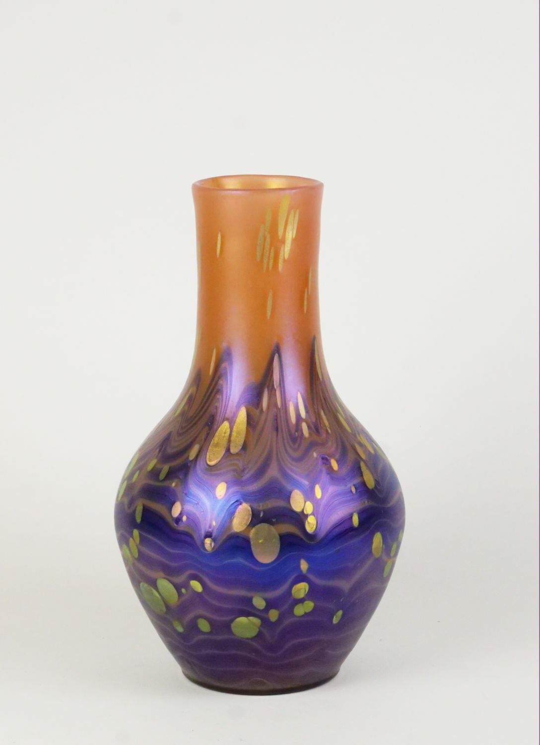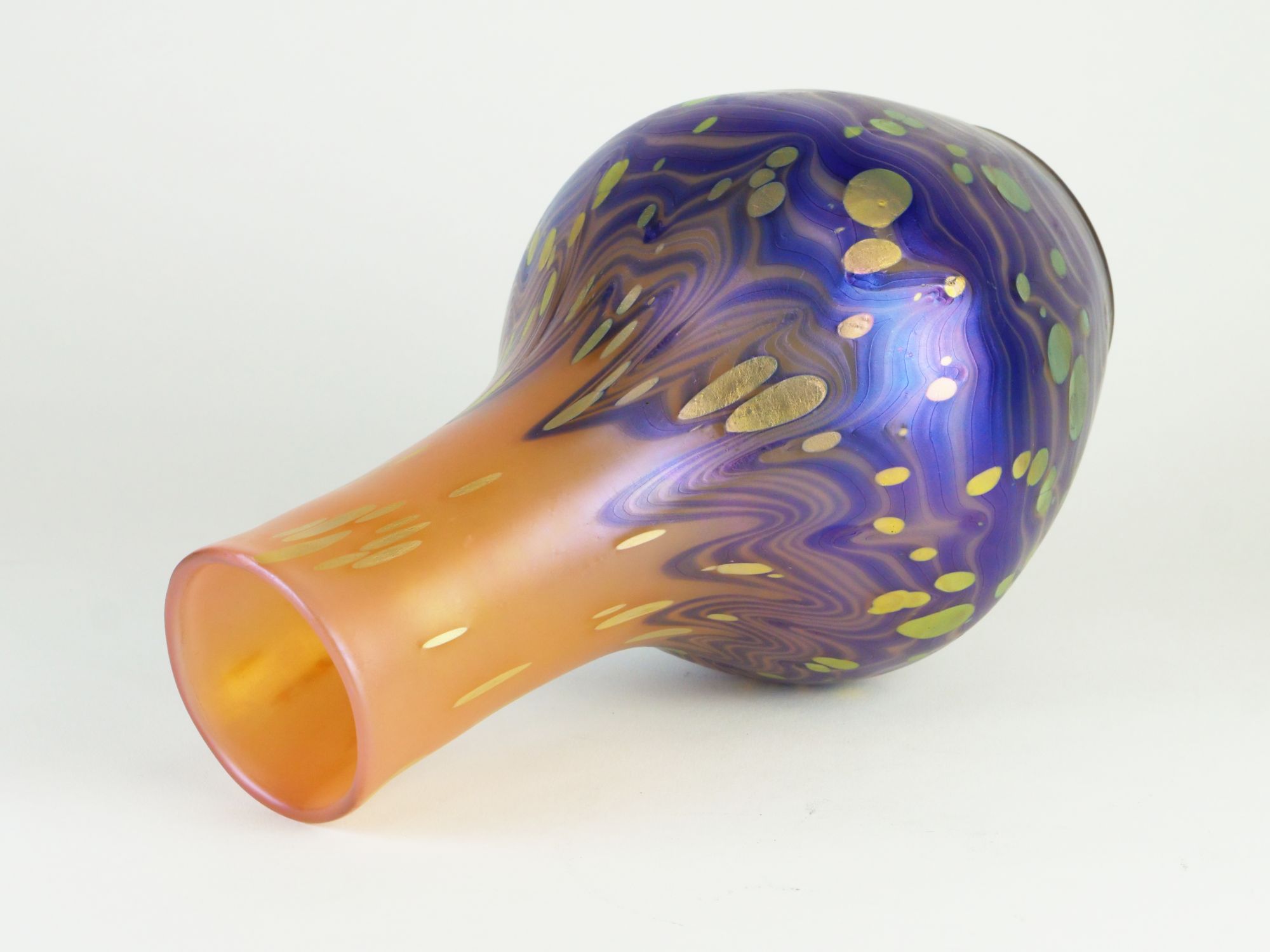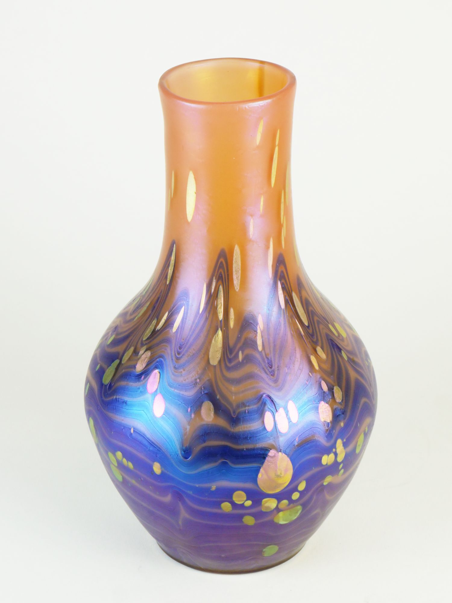 secesní váza šumavské sklárny Loetz z Klášterského Mlýna, efektní dekor New-red Cytisus, Rakousko-Uhersko (Čechy), kolem roku 1905; výška 25,5 cm; sběratelsky zajímavé
