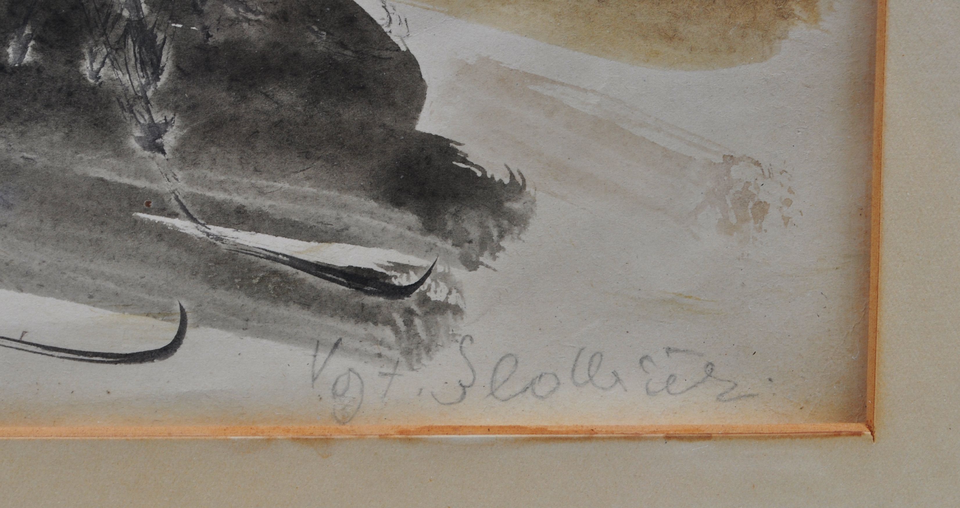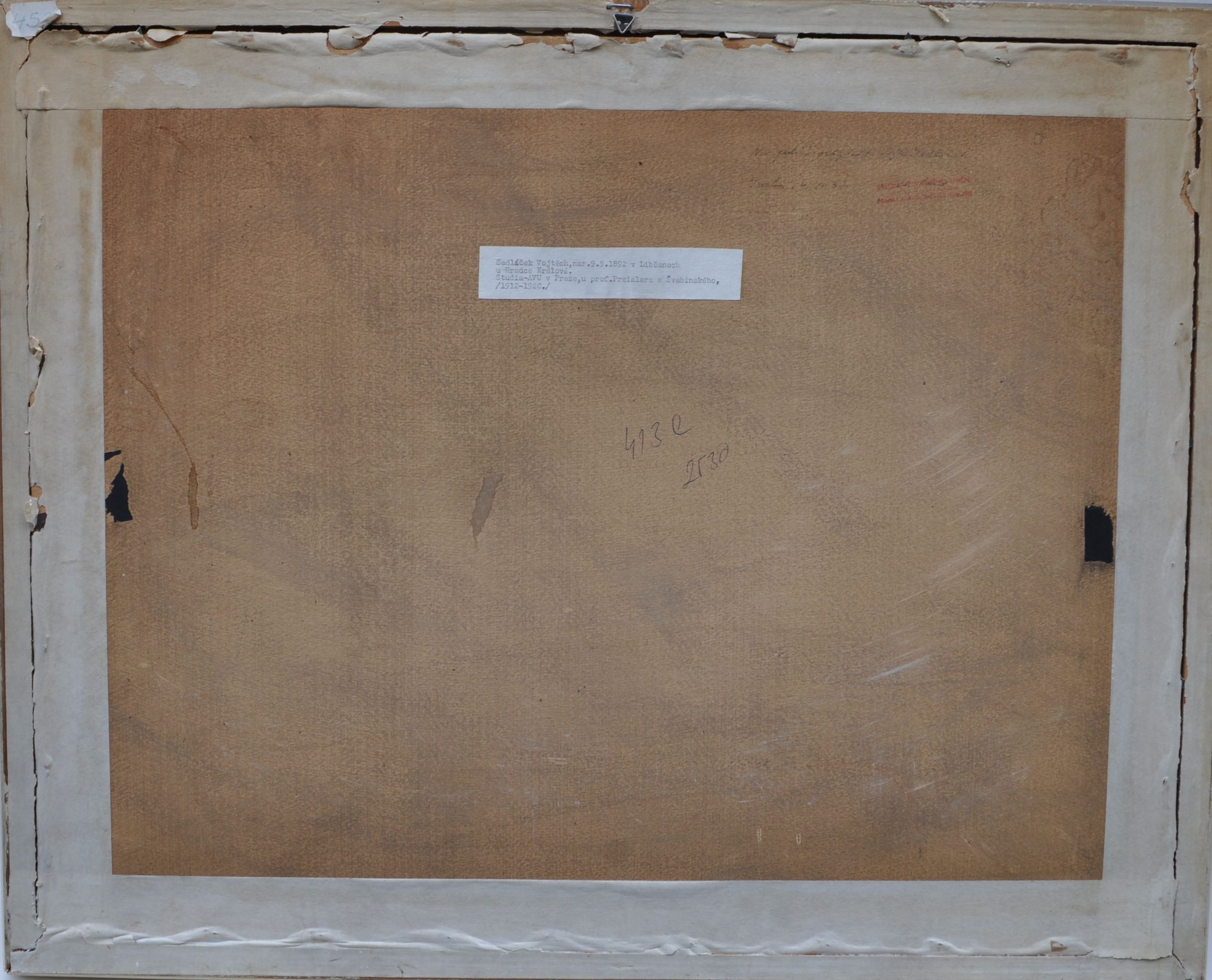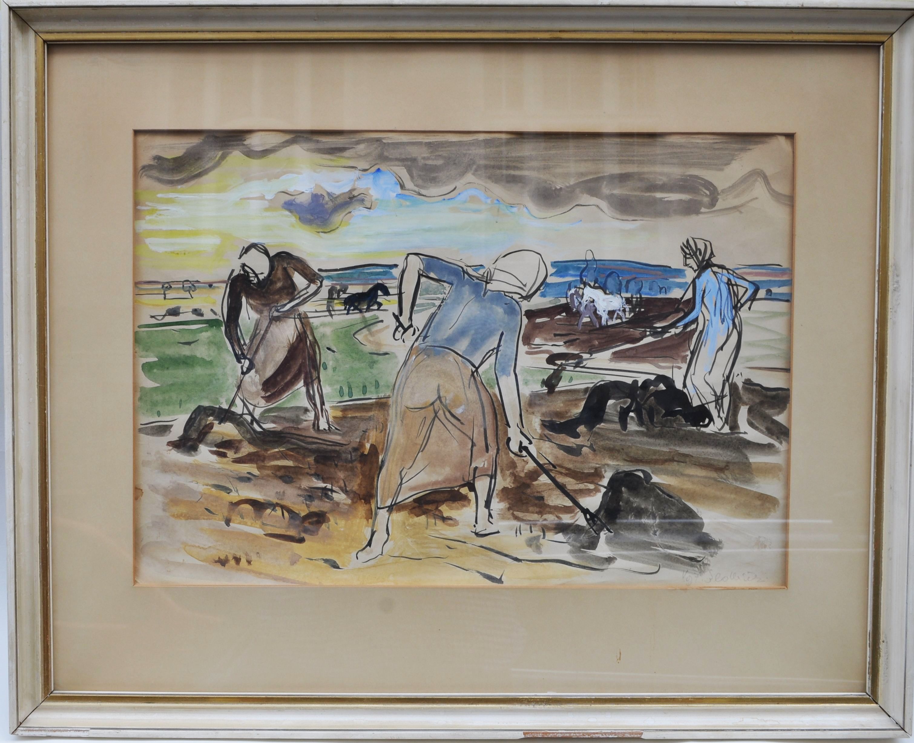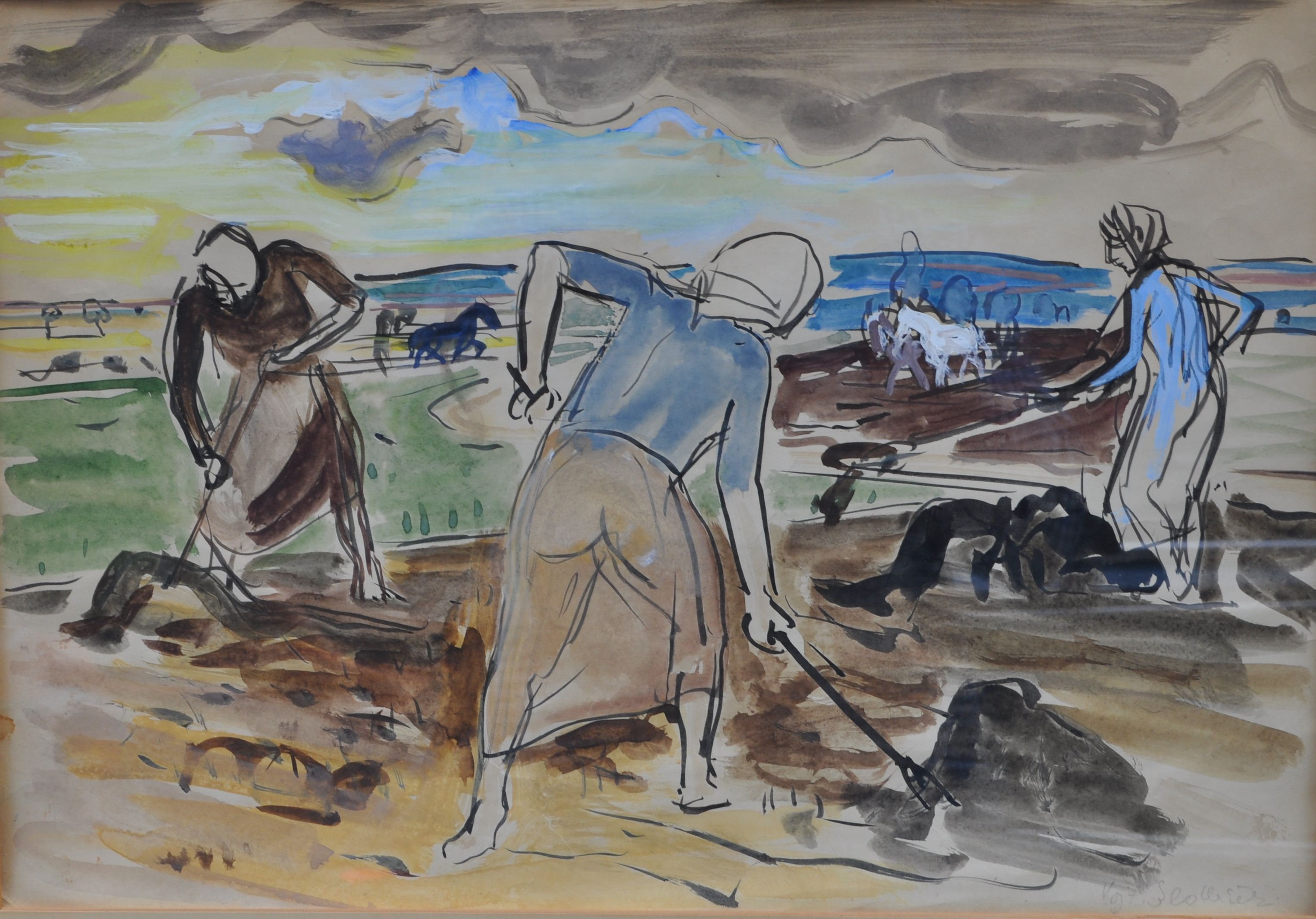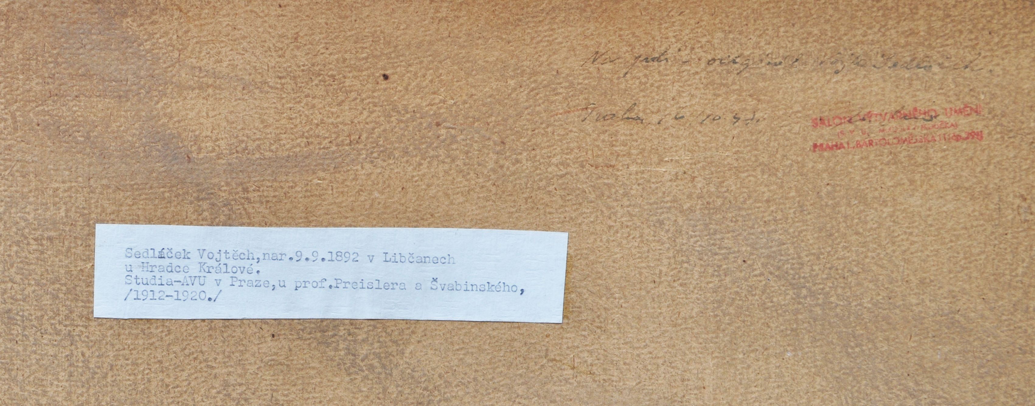 typická práce malíře Vojtěcha Sedláčka (1892 - 1973, národní umělec) z roku 1947, kombinovaná technika na papíře (tuš, akvarel, kvaš), vnitřní rozměr v paspartě 35x51 cm, vnější rozměr rámu 57x71 cm; na zadní straně vedle ručně psané poznámky o autenticitě razítko pražského Salonu výtvarného umění; zajímavý detail - dvě ženské postavy mají zjevně průsvitné sukně...