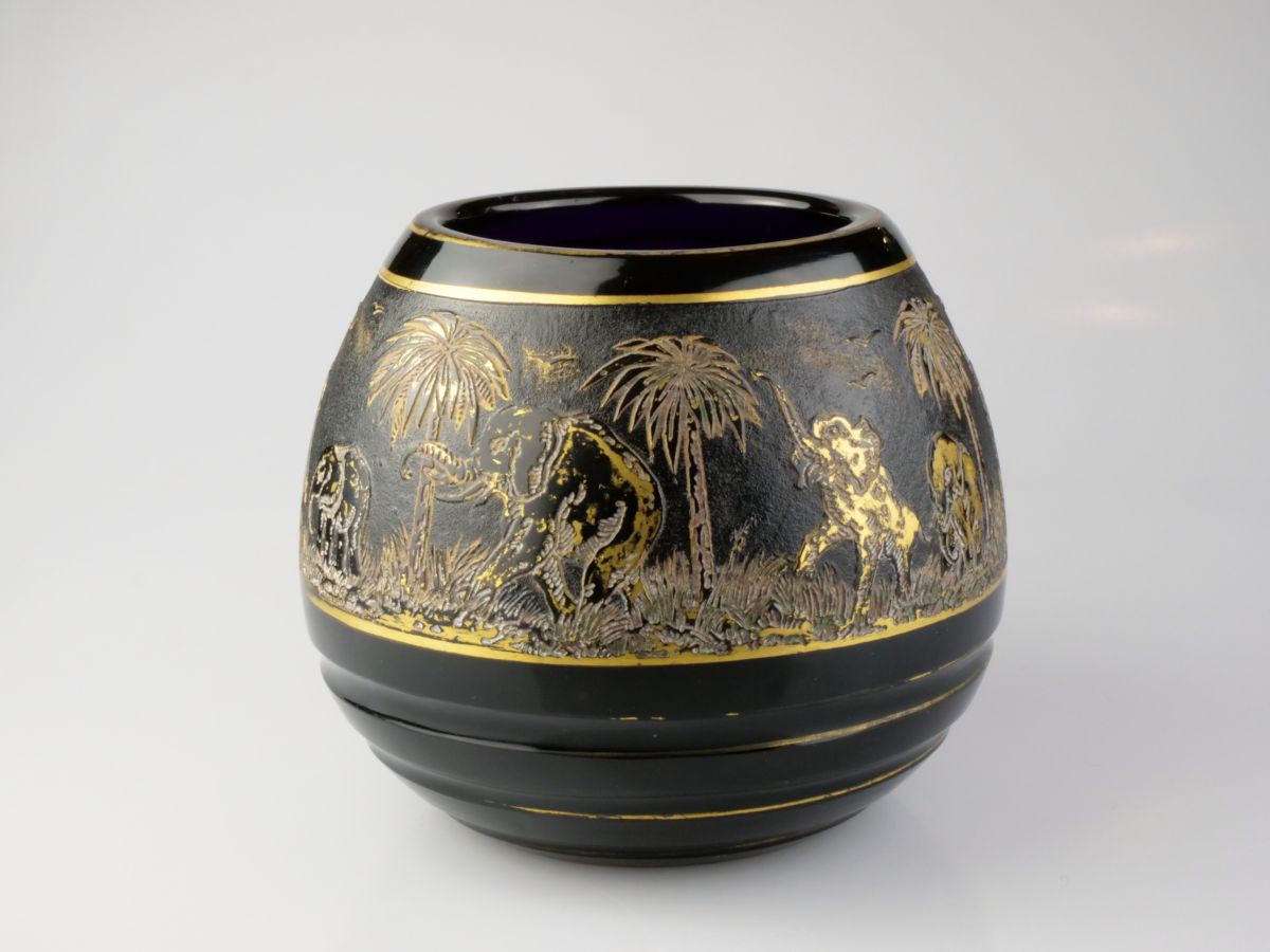 váza z tmavě ametystového skla s dekorem Animor (oroplastika se slony), sklárna Moser, Karlovy Vary, kolem r. 1926, značeno na dně i v oroplastice; průměr 14 cm, výška 12,5 cm