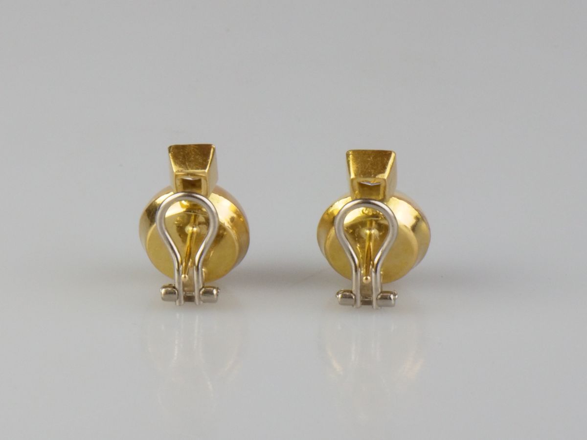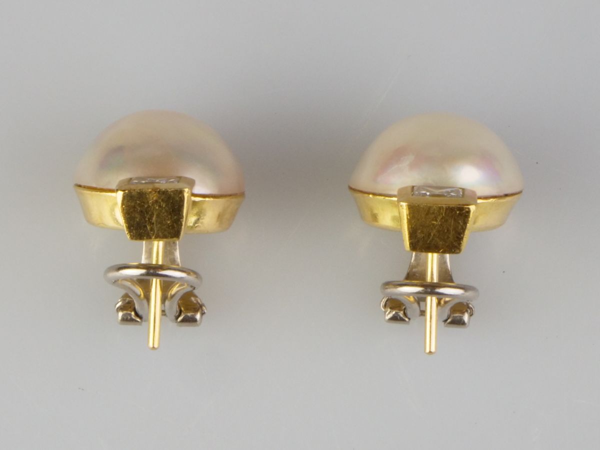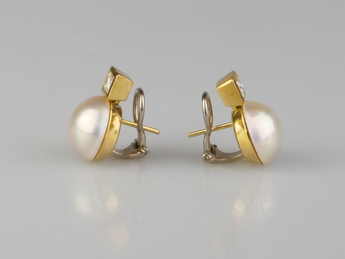 zlaté náušnice s kultivovanými perlami a diamanty, Au btto 12,29 g/750/1000, dva diamanty brusu princess o celkové hmotnosti asi 0,97 ct, barva J-K, čistota VS1, dvě kulaté půlperly velmi dobré kvality, západní Evropa, kolem r. 1990; atest Puncovního úřadu, znalecký posudek; rozměry 20,5 x 14 x 19 mm