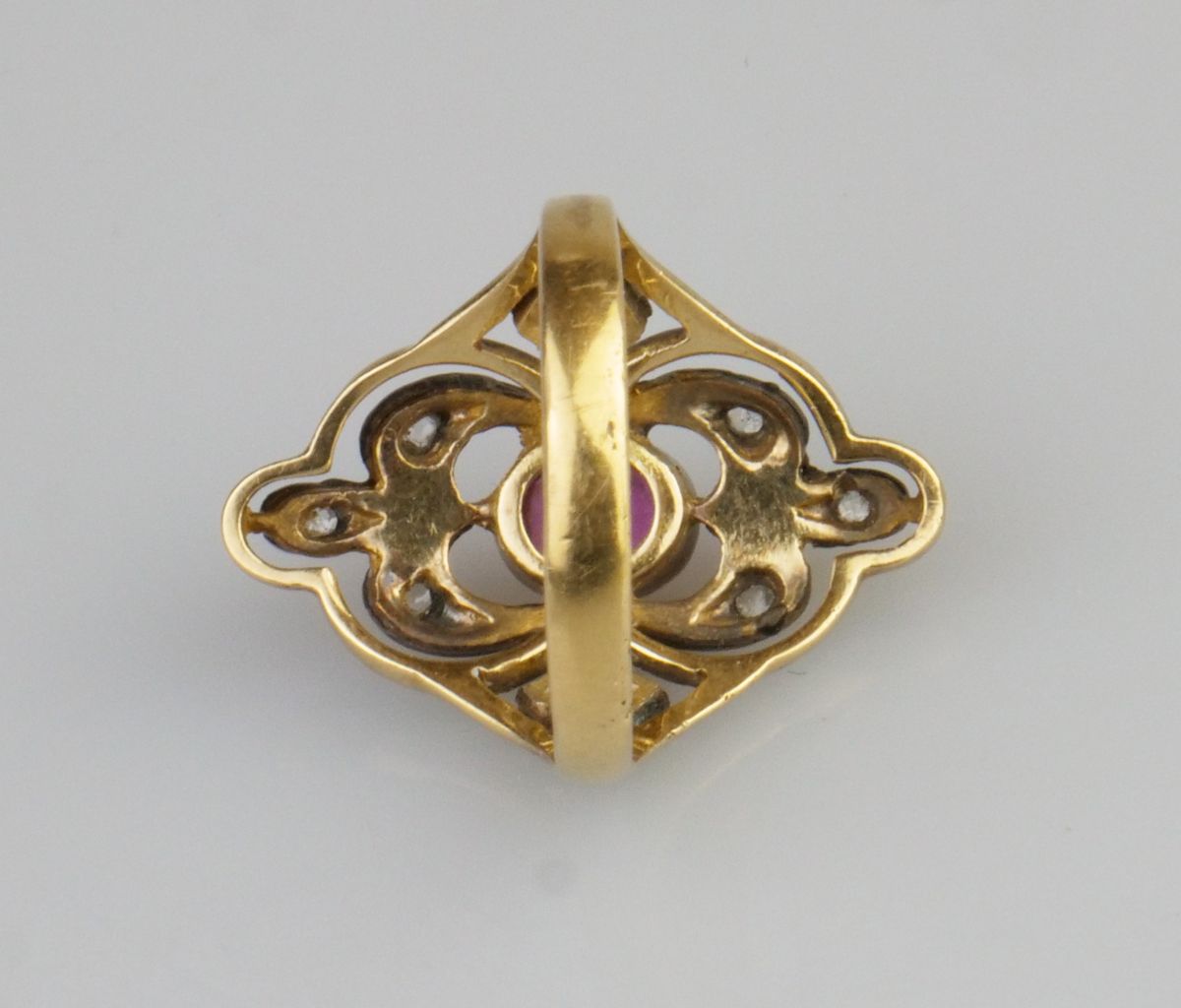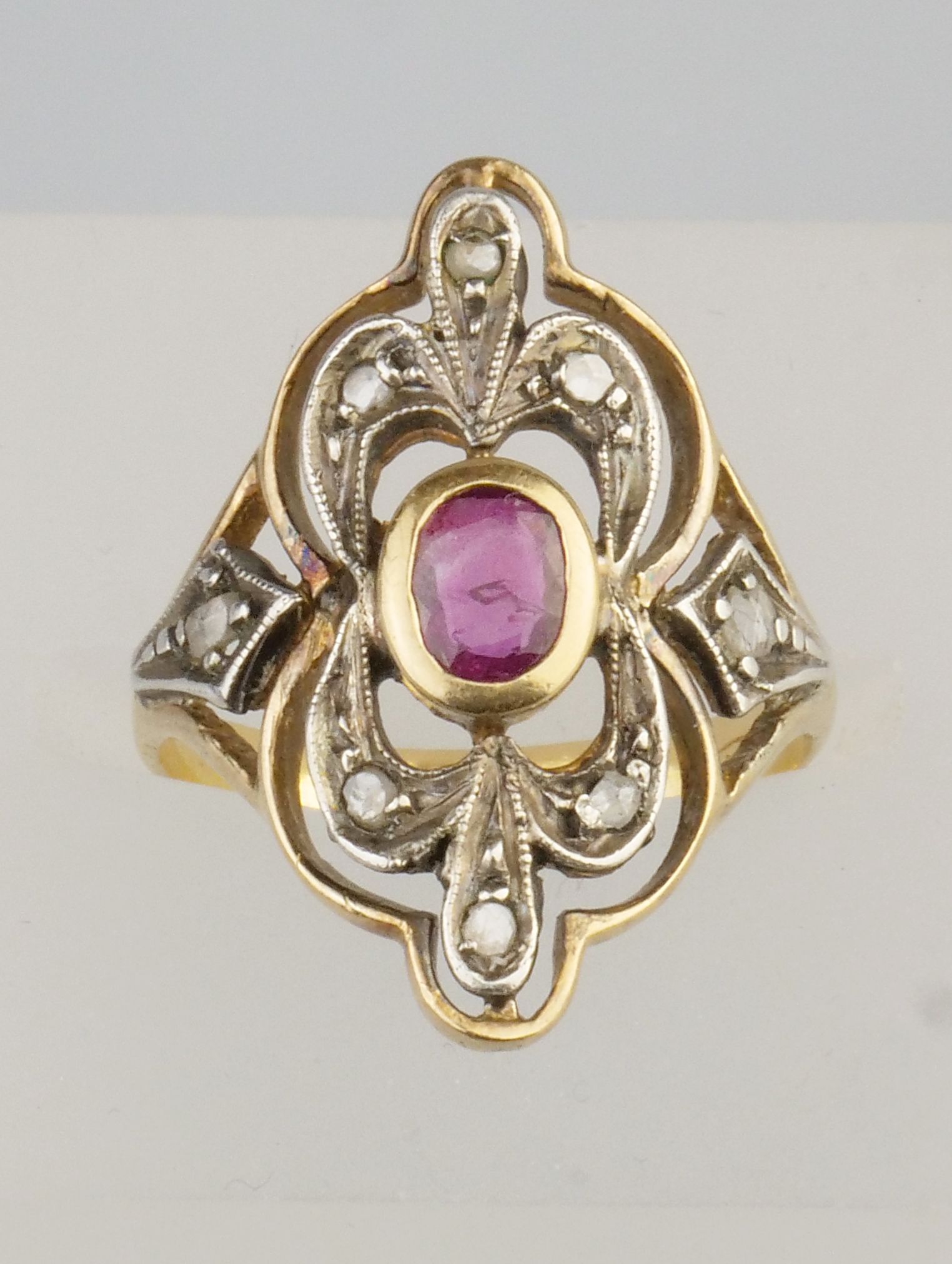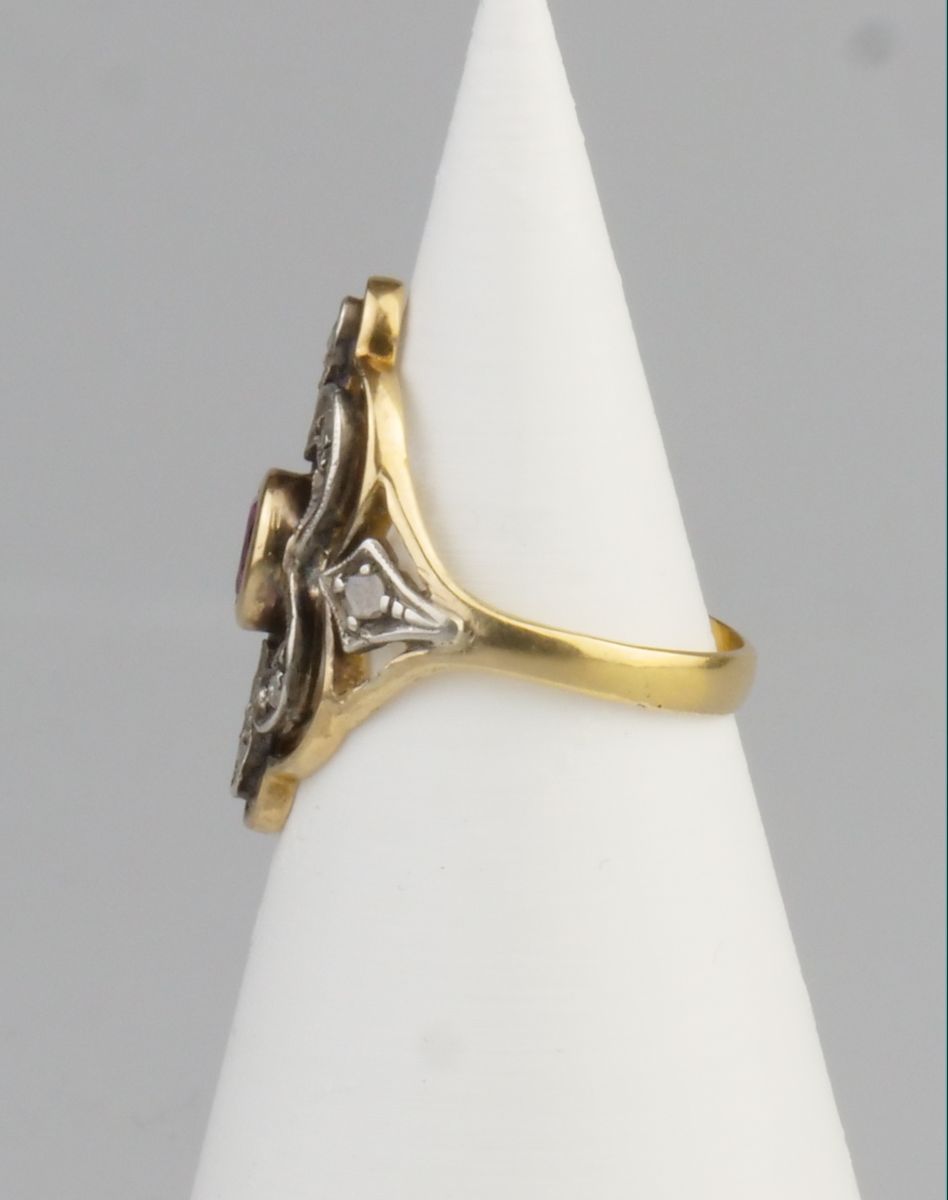 zlatý prsten s přírodním rubínem a diamantovými routami ve vintage stylu, Au+Ag btto 5,21 g/750+800/1000, routy fasované ve stříbře, Itálie, kolem r. 1960, pozdější české puncovní značky pro zlato a stříbro, rozměry hlavy 2,4 x 2 cm; velikost prstenu 55