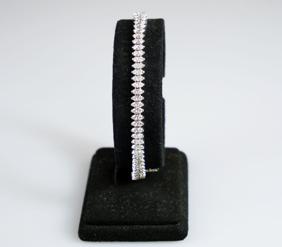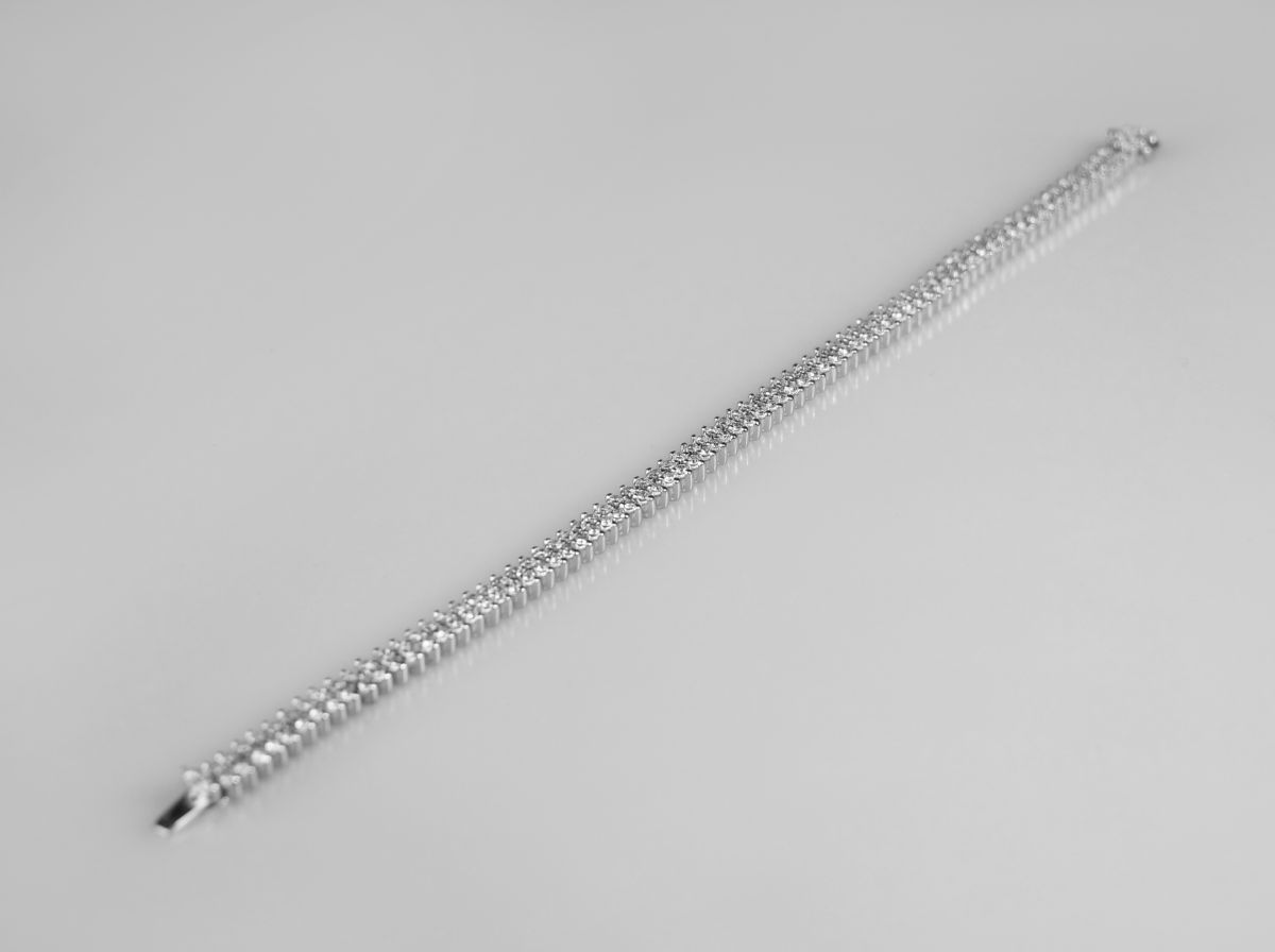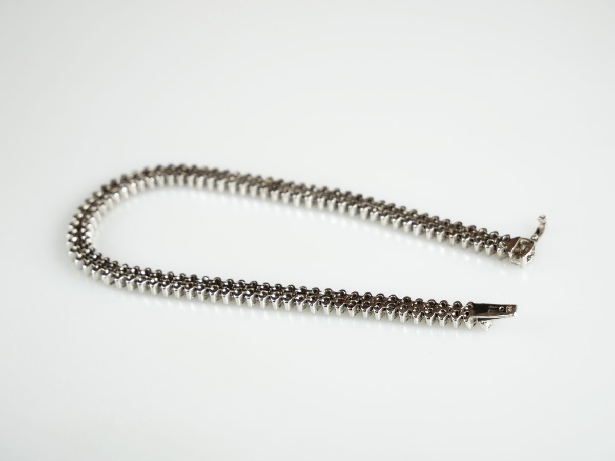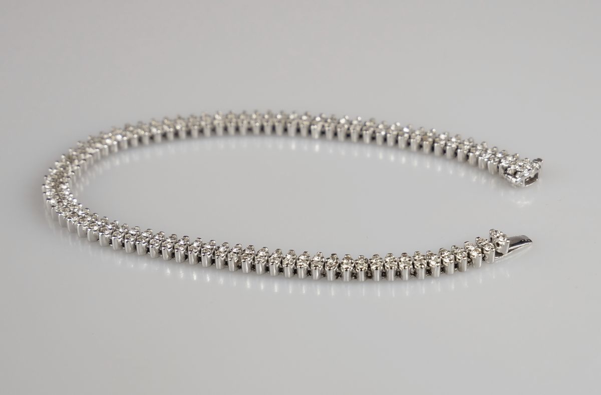 ”tenisový” dvouřadý náramek z bílého zlata se 162 diamanty briliantového brusu o celkové hmotnosti přibližně 5 ct, Au btto 21,61 g/750/1000, západní Evropa, kolem r. 1990; pozdější český punc (kohout), šířka 0,5 cm, délka 20 cm