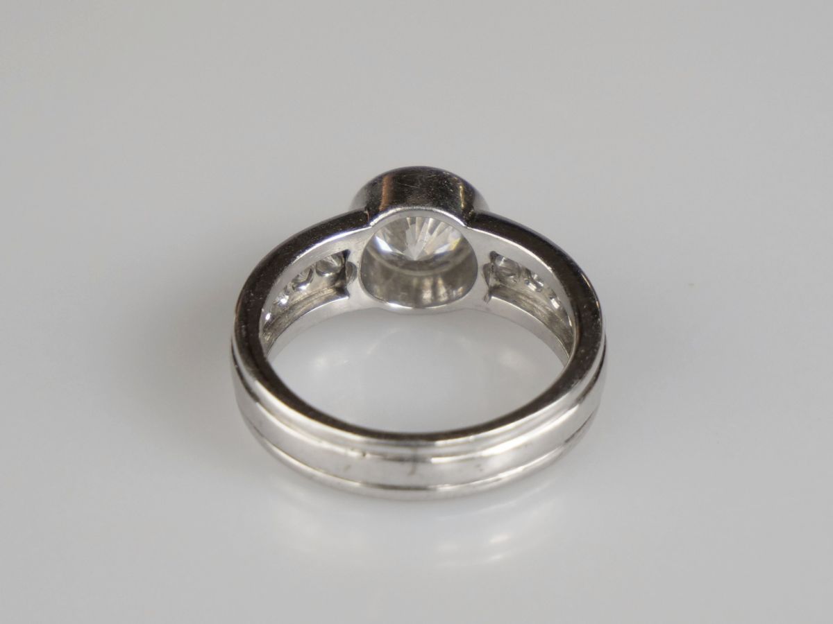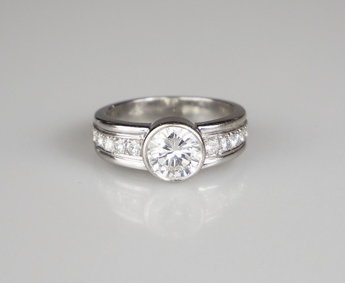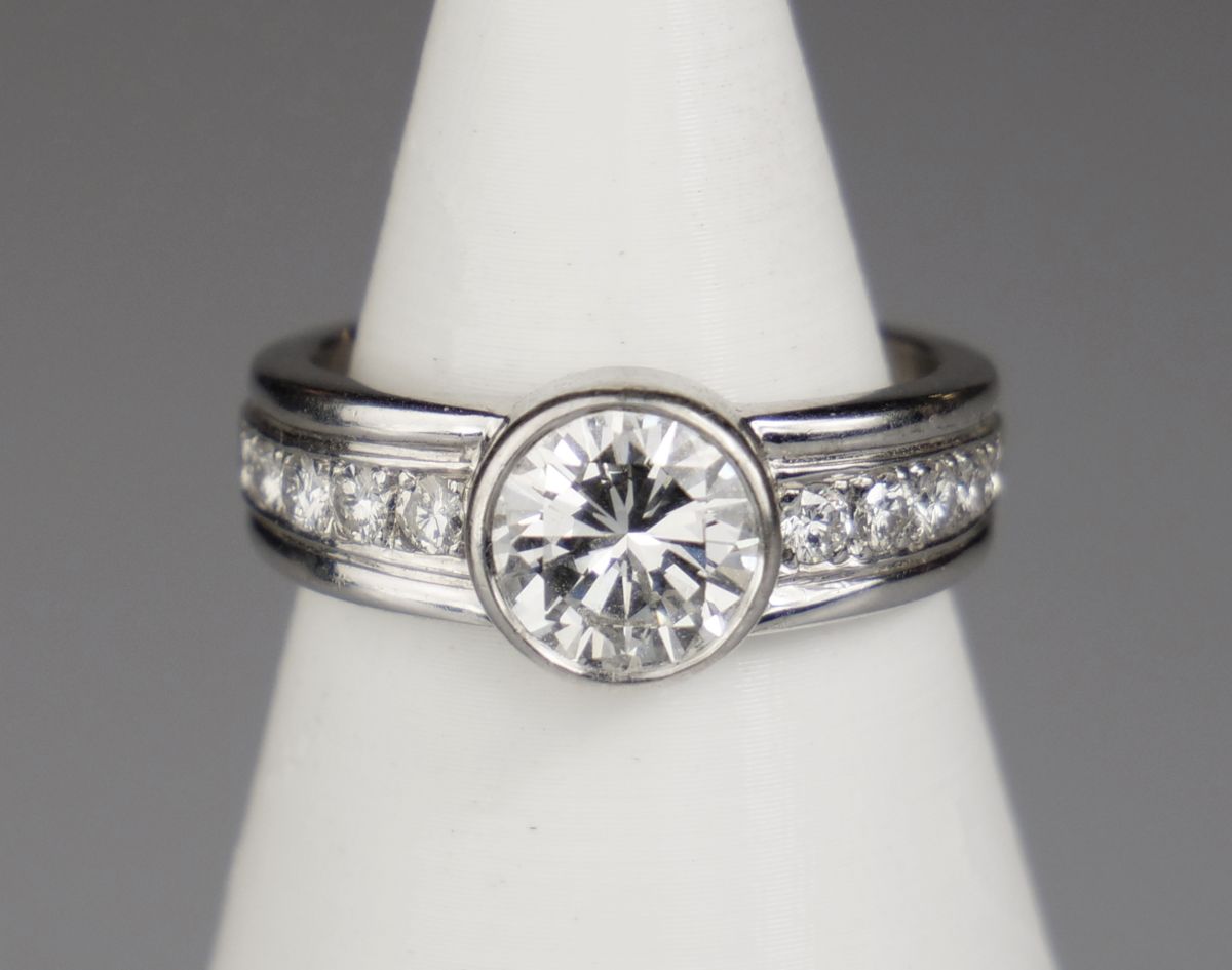 zlatý prsten s diamanty, centrální diamant briliantového brusu o hmotnosti cca 1,61 ct, vzácná bíla barva F-G, čistota VS1, vynikající symetrie brusu, dále na prstenu 10 malých diamantů briliantového brusu o hmotnosti 0,35 ct, Au 7,42 g/750/1000, Západní Evropa, kolem roku 2000; osvědčení Puncovního úřadu, znalecký posudek; velikost prstenu 56