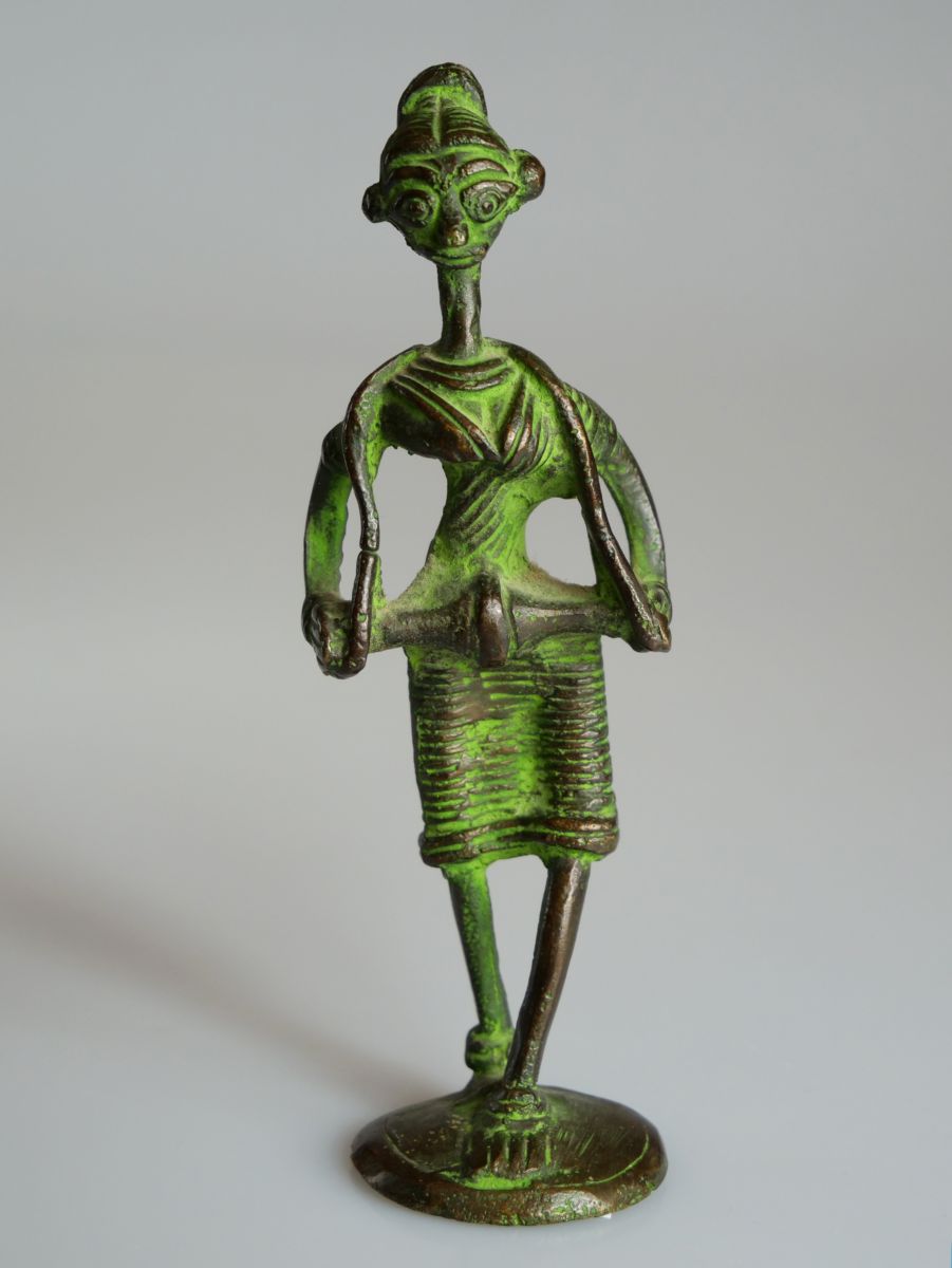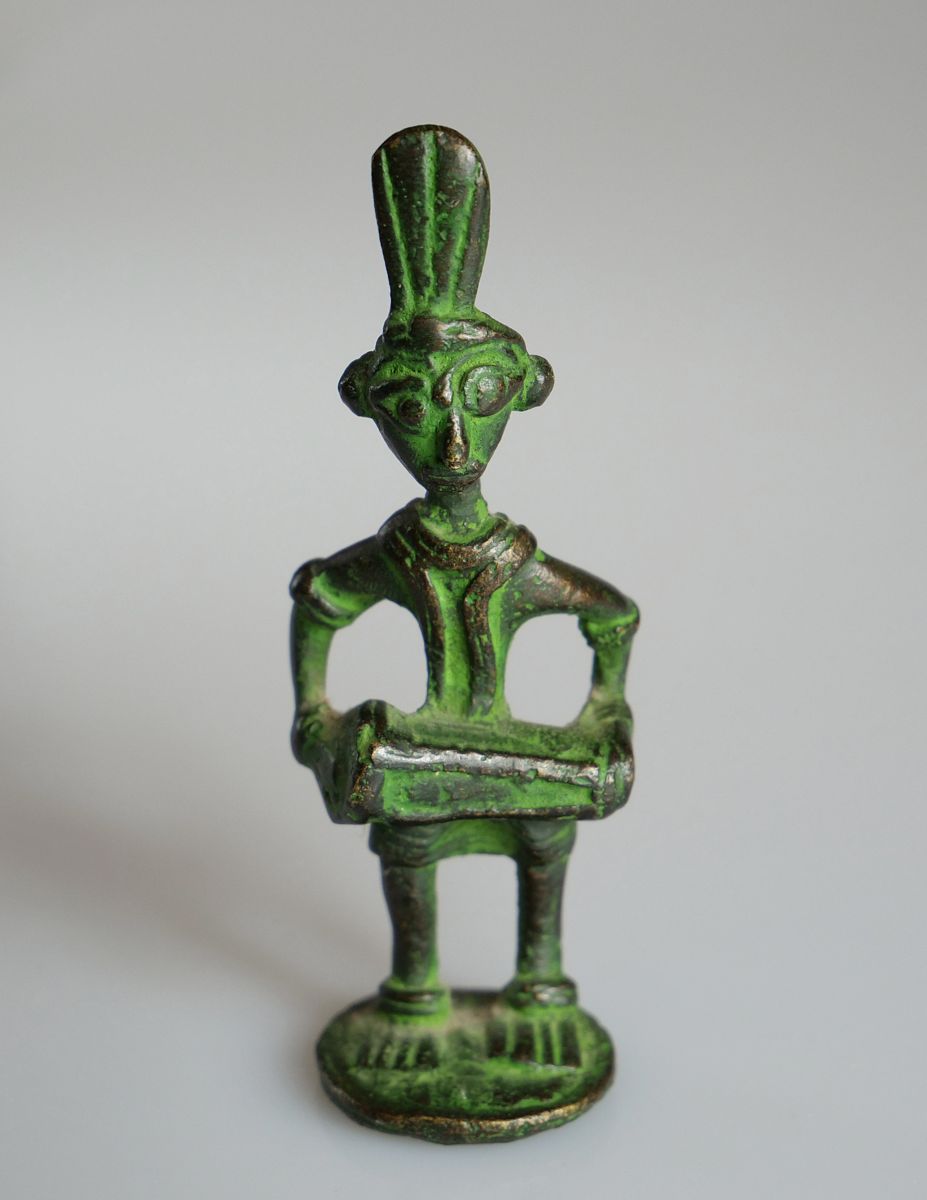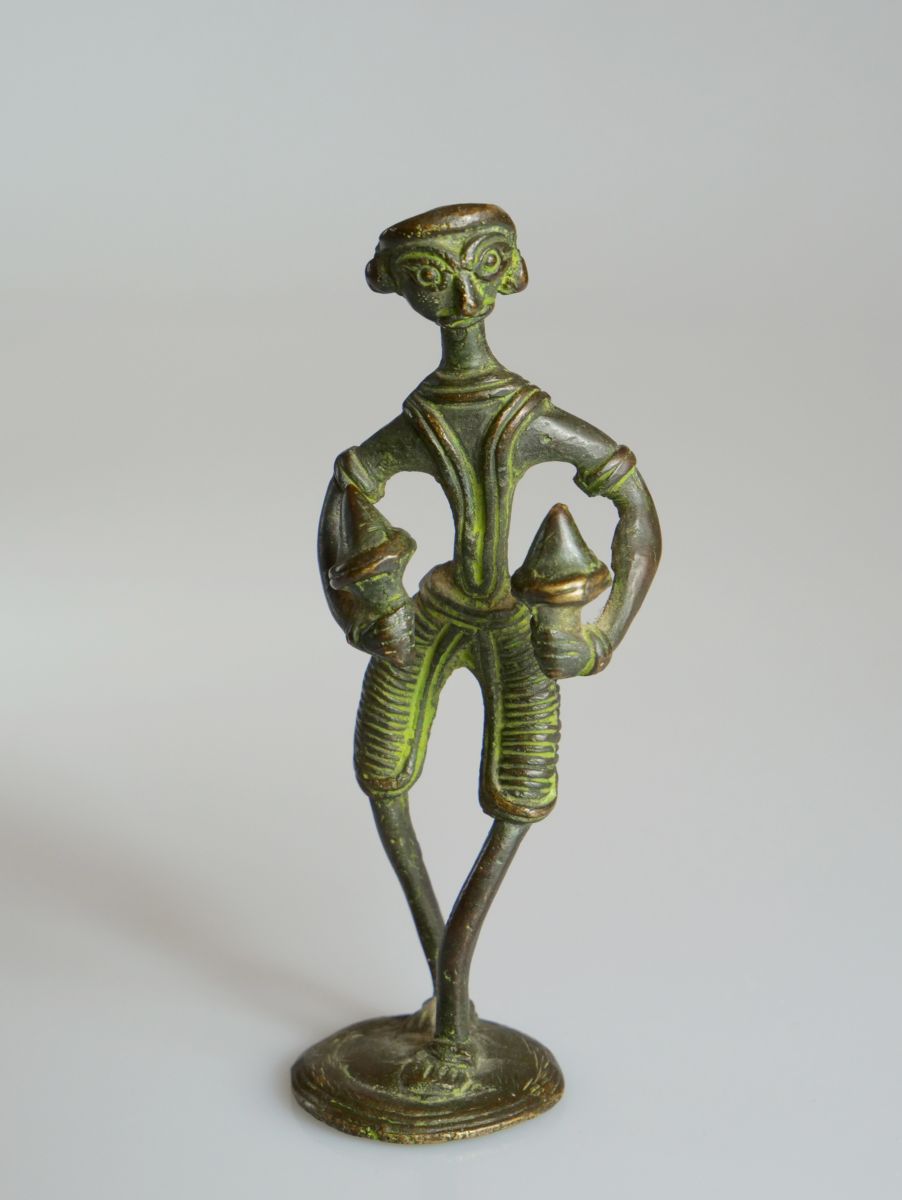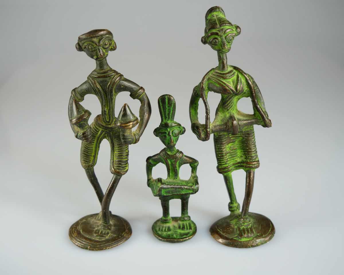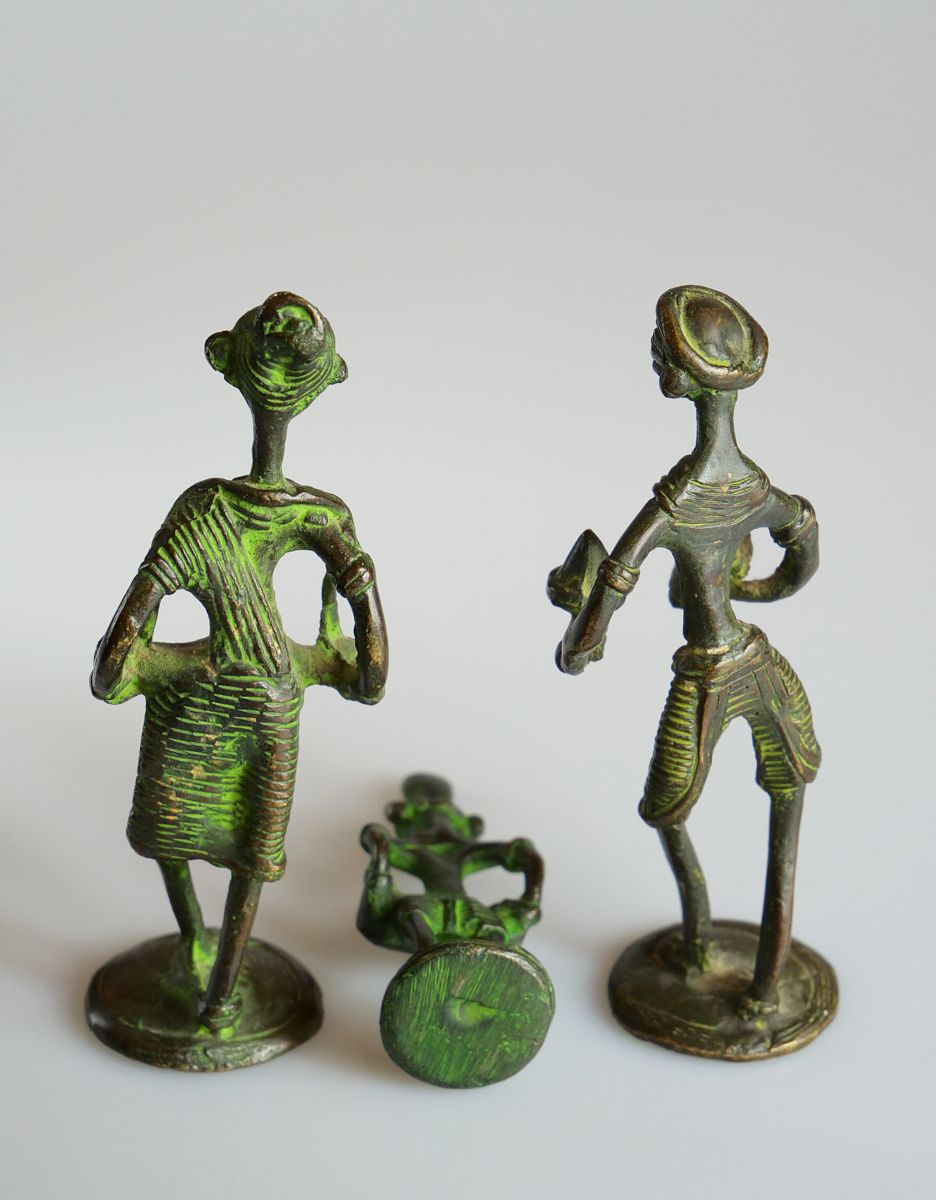 bronzové sošky místních hudebníků odlité tradiční technikou ztraceného vosku, Indie - indický stát Uríša, kolem r. 1900, konzultováno v Náprstkově muzeu; výška figurek 13,5 cm, 13 cm, 9 cm