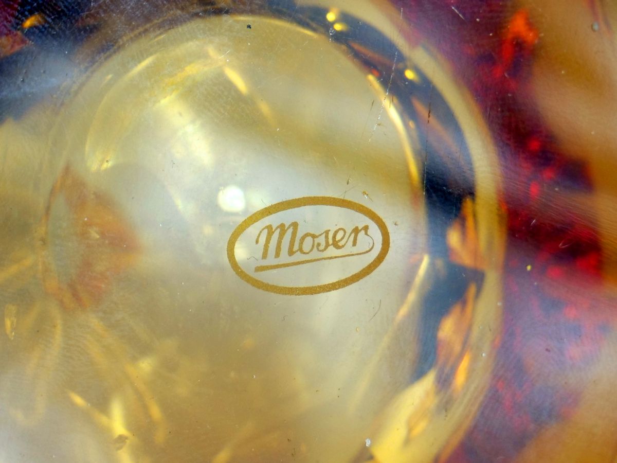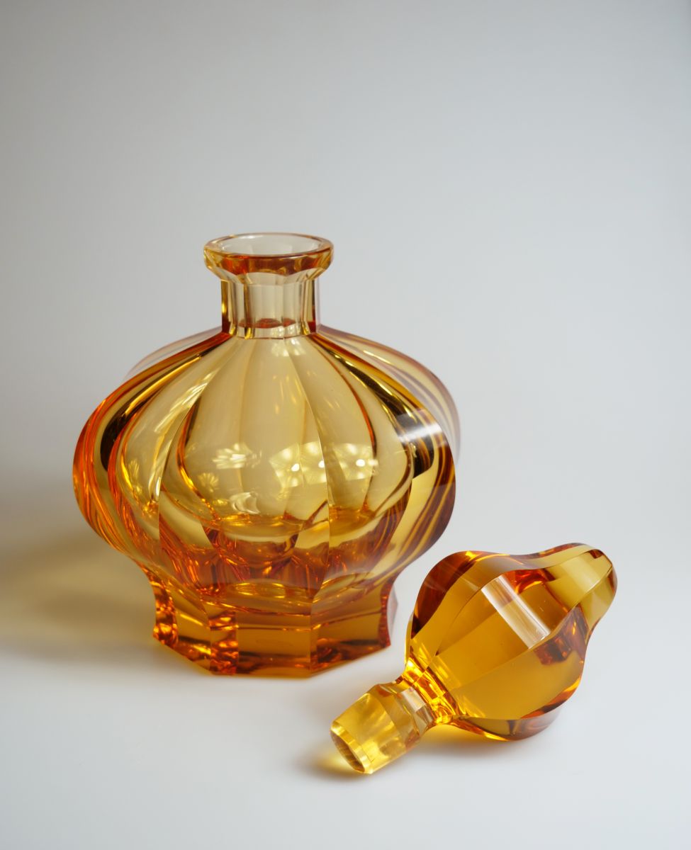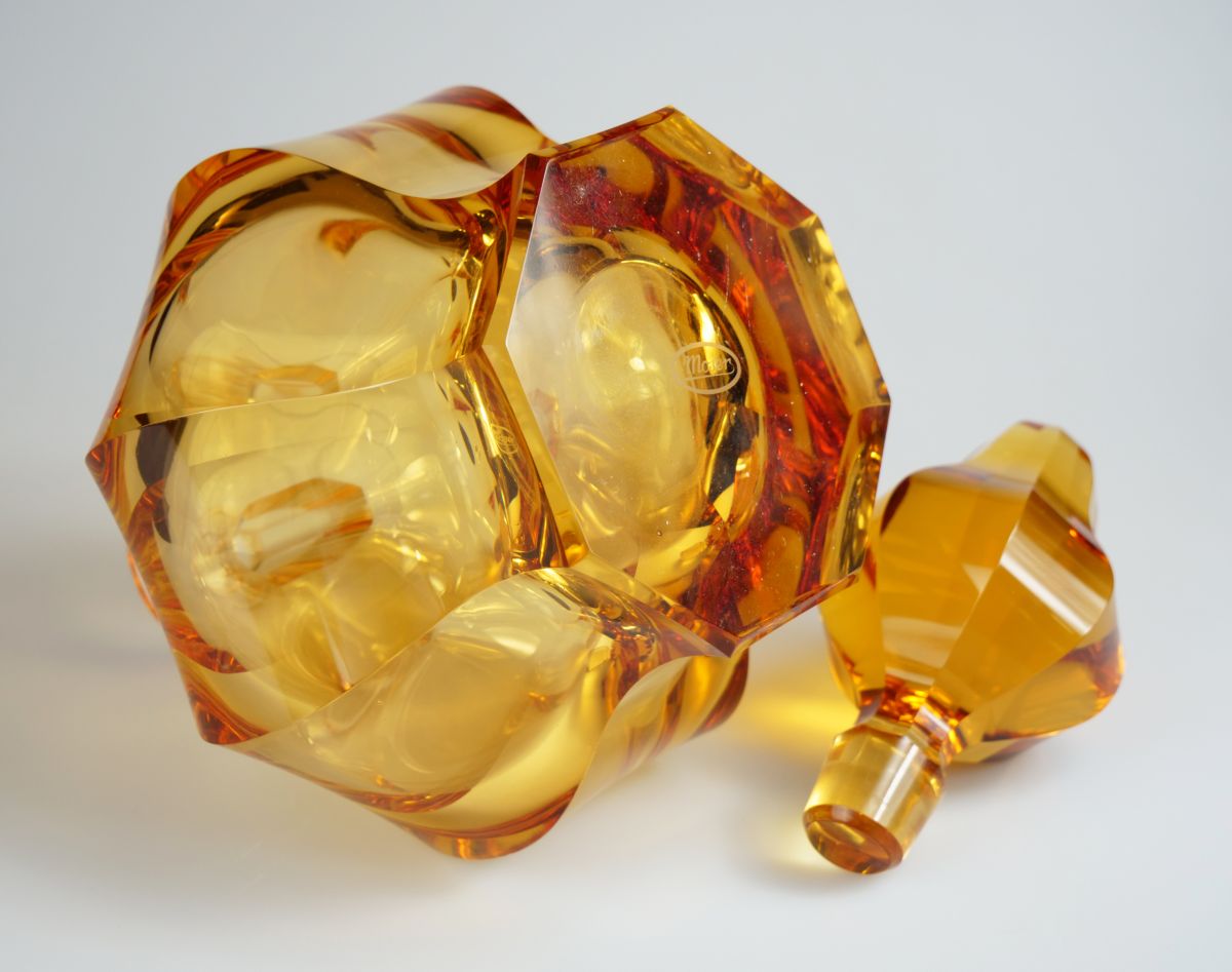 robustní osmistěnná karafa ze silnostěnného skla medově jantarové barvy, precizní brus všech stěn a masivní zátky, karlovarská sklárna Moser, kolem r. 2005, značeno; výška 25 cm, průměr 15 cm