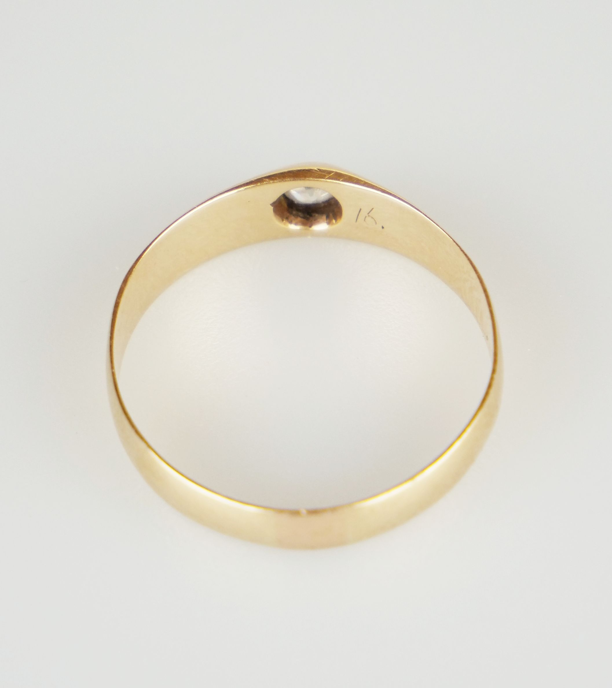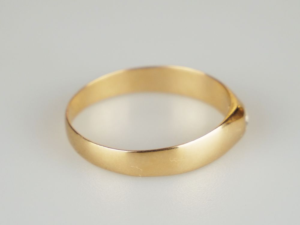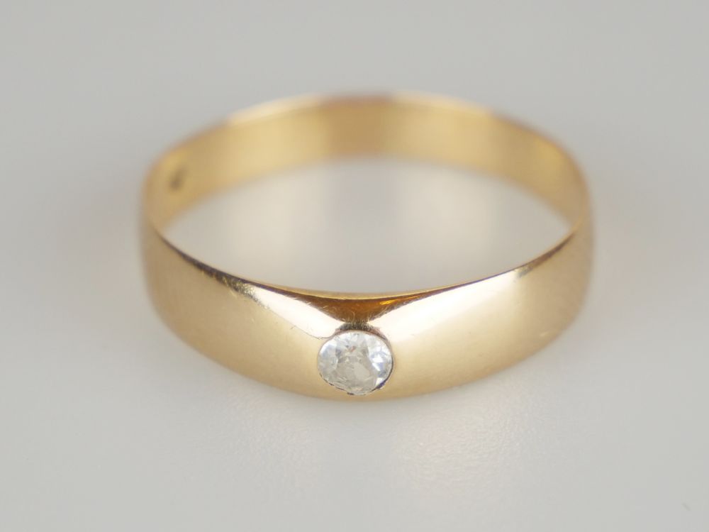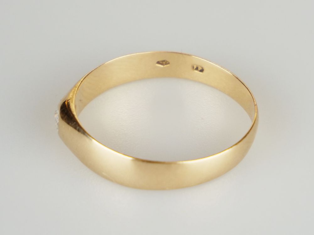 jednoduchý zlatý prsten s diamantem briliantového brusu o hmotnosti 0,1 ct, Au 2,71 g/580/1000, Rakousko-Uhersko, Čechy, kolem r. 1915, dobový punc se značkou pražského puncovního úřadu (liška); velikost prstenu 65