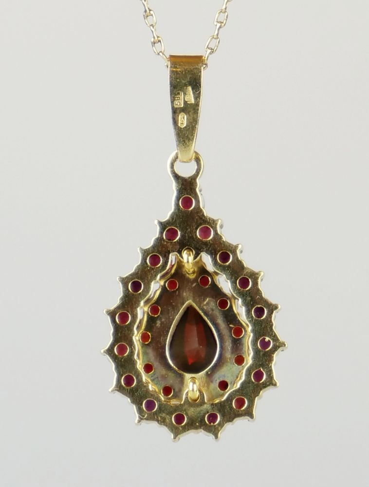 zlatý přívěsek s českými granáty, Au 4,81 g/585/1000, Čechy, kolem r. 1995, český punc (labuť), velikost 3,2 x 1,6 cm
