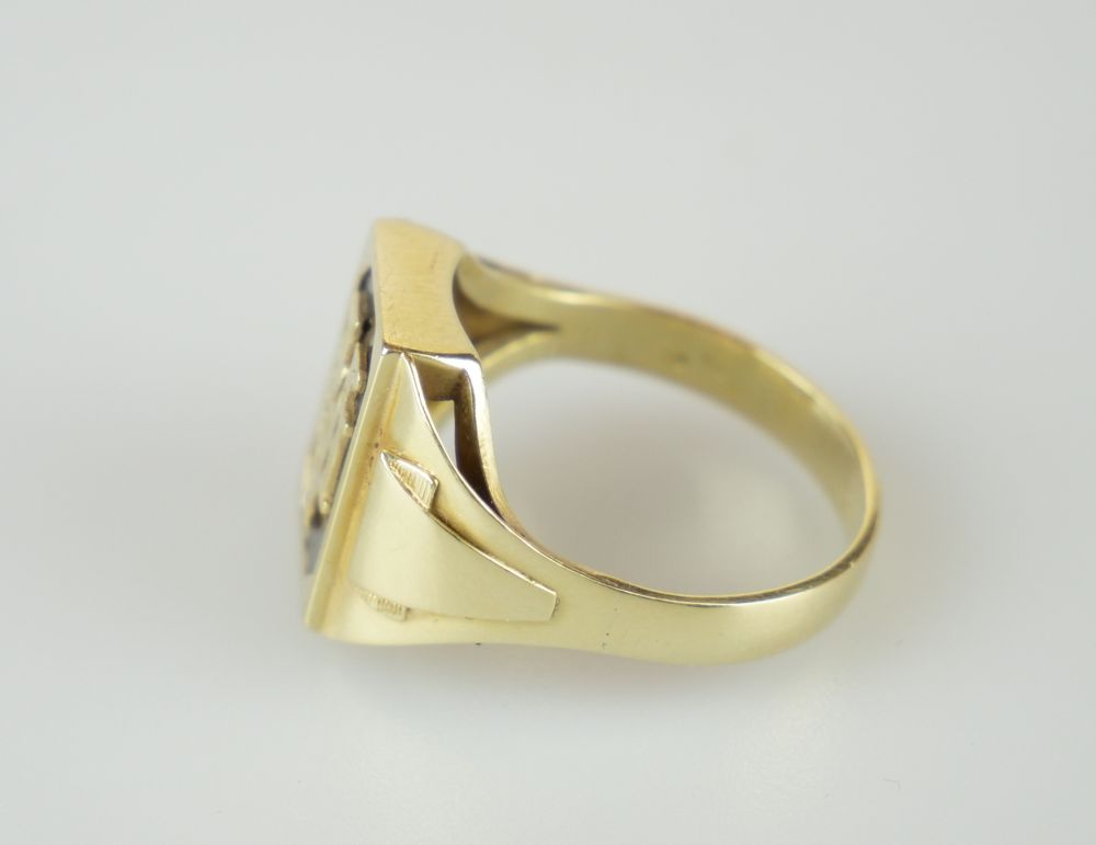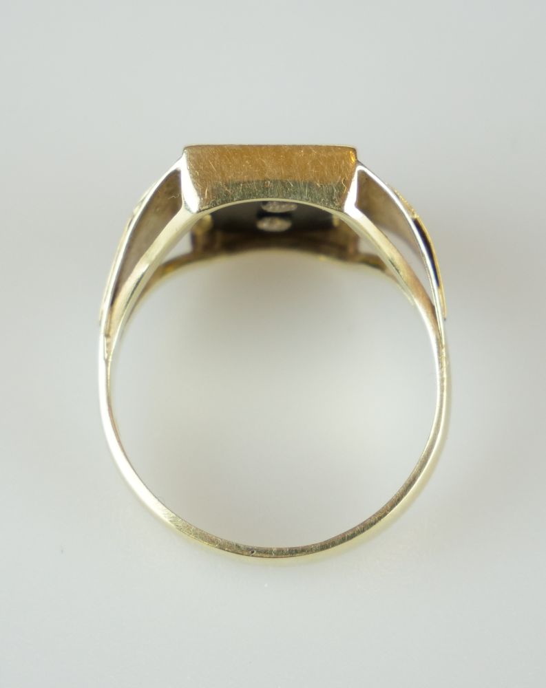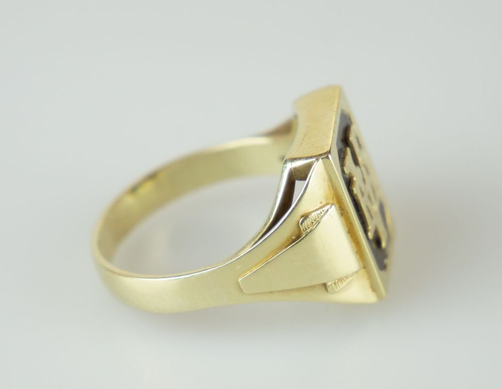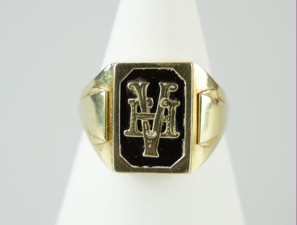 zlatý prsten s tmavým karneolem a monogramem VH, Au 7,5 g/585/1000, Čechy, kolem r. 1995, český punc (labuť), rozměr hlavy 2,1 x 1,6 cm, velikost prstenu 65