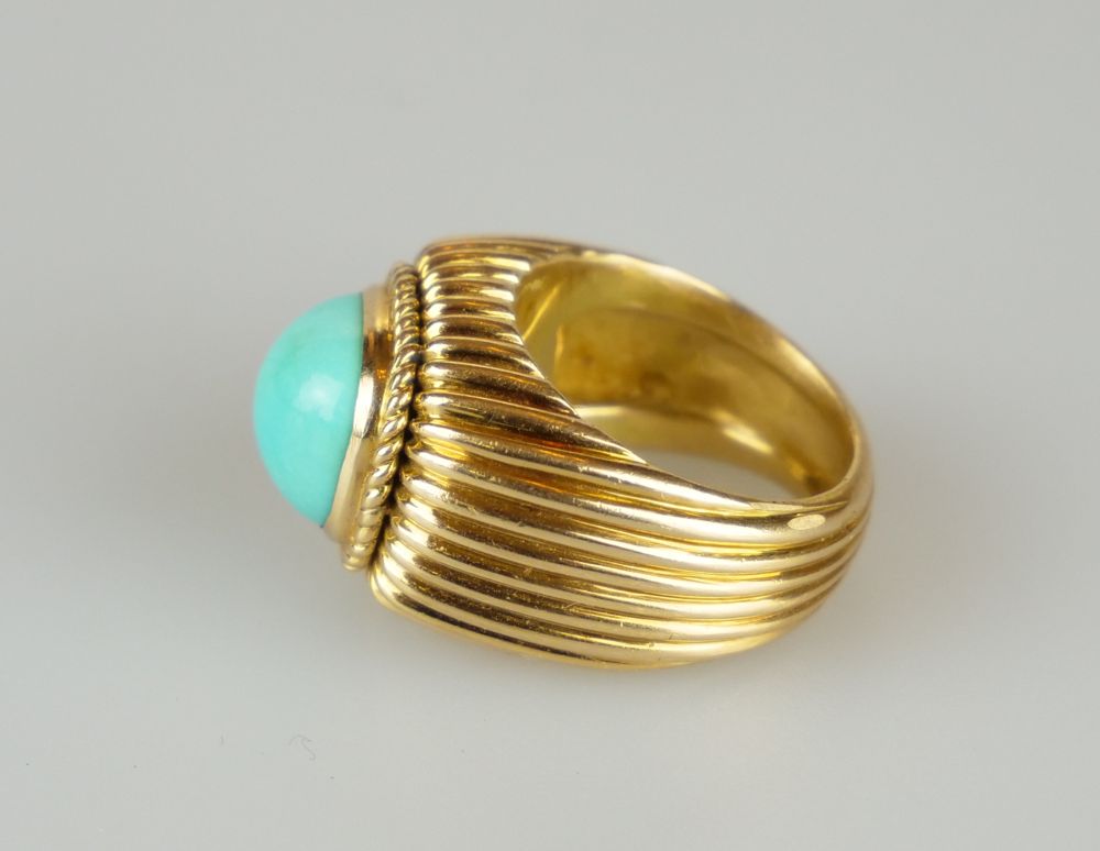 zlatý masivní prsten s tyrkysovým kabošonem, provedla slavná pařížská klenotnická dílna Marchak, Au 15,48 g/750/1000, Francie, kolem r. 1960, značeno - signováno; atest Puncovního úřadu; velikost prstenu 49; značku, resp. firmu založil koncem 19. století Joseph Marchak a záhy ji svými šperky celosvětově proslavil, rodina Marchaků uprchla koncem první světové války z Ukrajiny do Paříže a velmi úspěšně dále podnikala v oboru špičkového šperkařství až do 80. let 20. století, kdy byla firma prodaná značce Daum