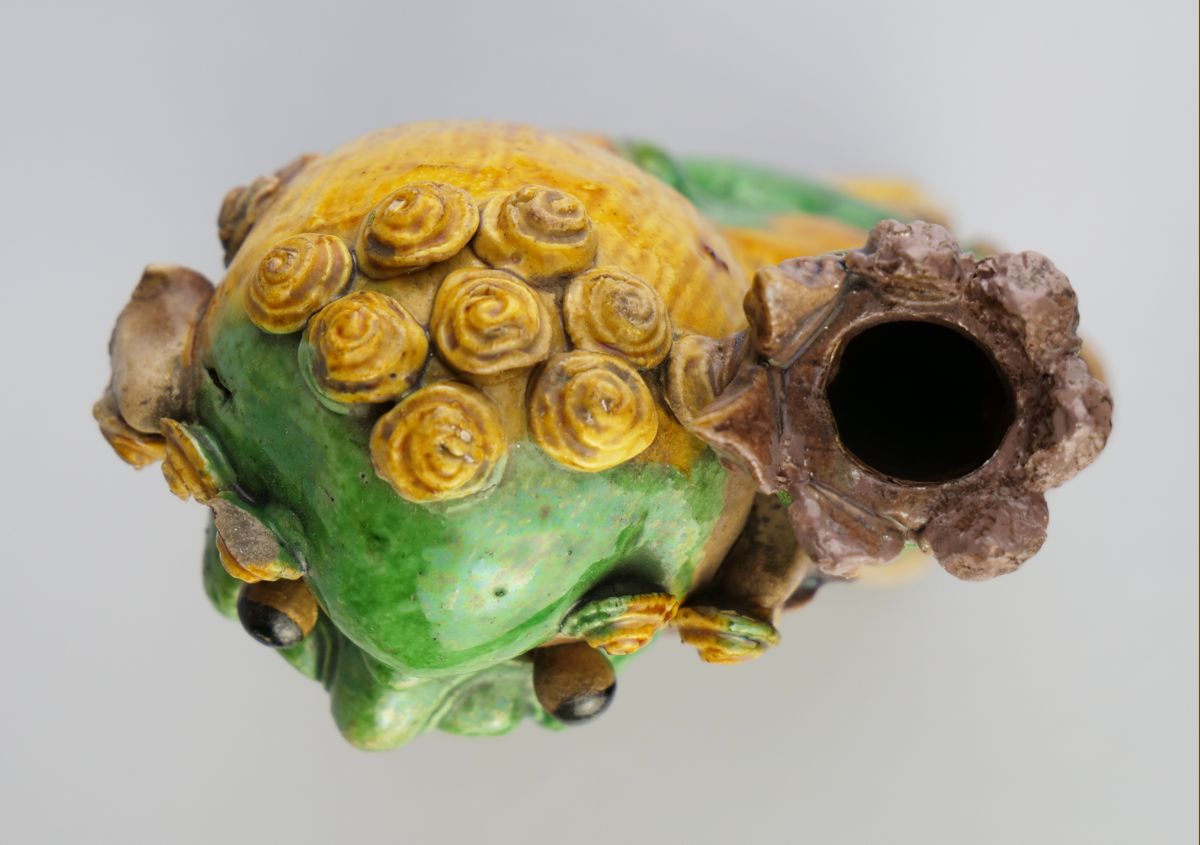 roztomilá buddhistická soška palácového lva z tvrdé barevně glazované póroviny, glazury ve stylu famille verte, Čína, období Kangxi (1622 - 1722), pohyblivé oči, využíváno jako vykuřovadlo, ve velmi dobrém stavu (nepatrné poškození); výška 19 cm, šířka 9 cm, hloubka 5 cm; sběratelsky zajímavé