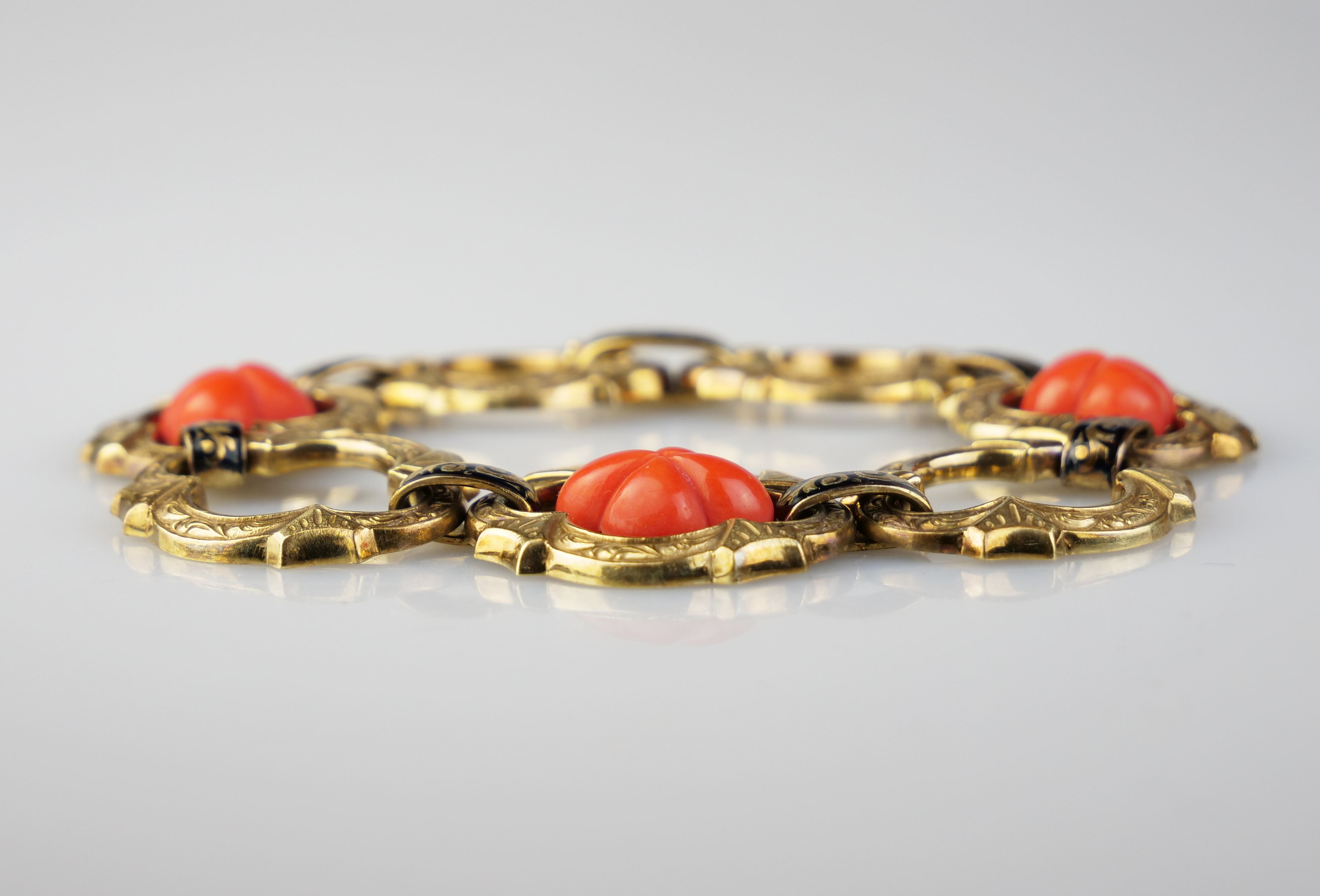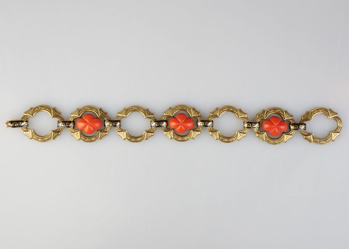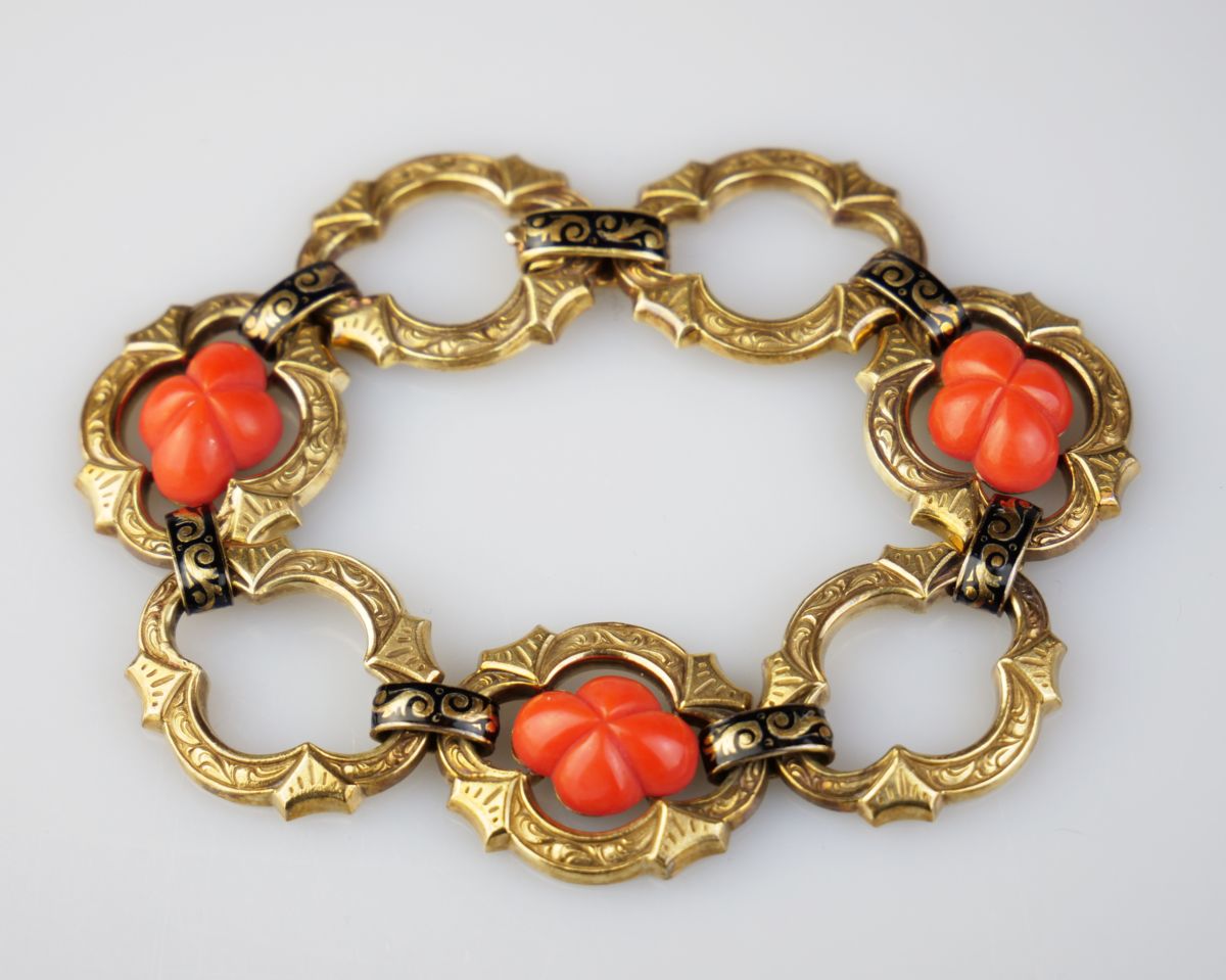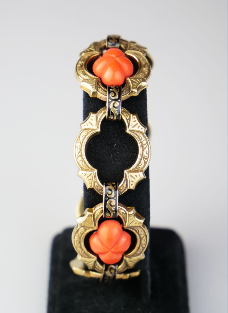 zlatý článkový náramek s netradičně řezanými velkými mořskými korály a černým emailem, Au 30,38 g/585/1000, západní Evropa, kolem r. 1930, dobový dovozový punc do ČSR; délka 19,5 cm, šířka 2,2 cm