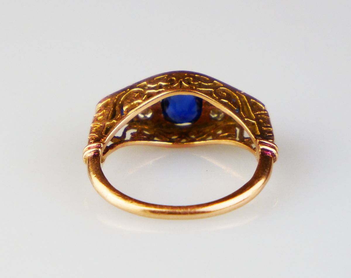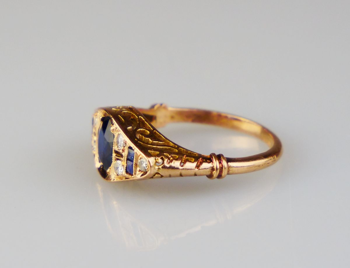 zlatý prsten s přírodními safíry a diamanty jednoduchého briliantového brusu o hmotnosti cca 0,12 ct, Au btto 2,81 g/500/1000, hlava prstenu lodičkového tvaru ozdobně prořezávaná, západní Evropa, kolem r 1935, atest Puncovního úřadu; rozměr hlavy 2 x 0,9 cm, velikost prstenu 53,5