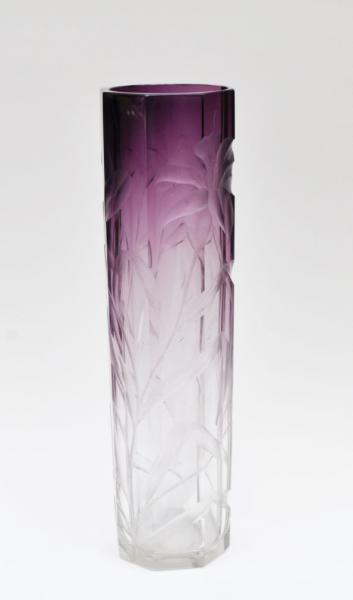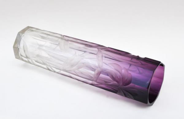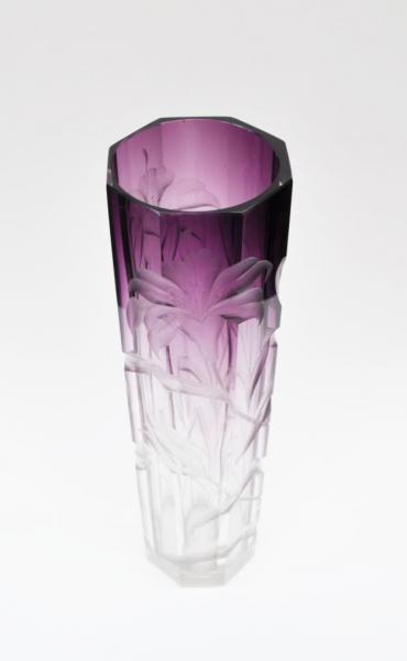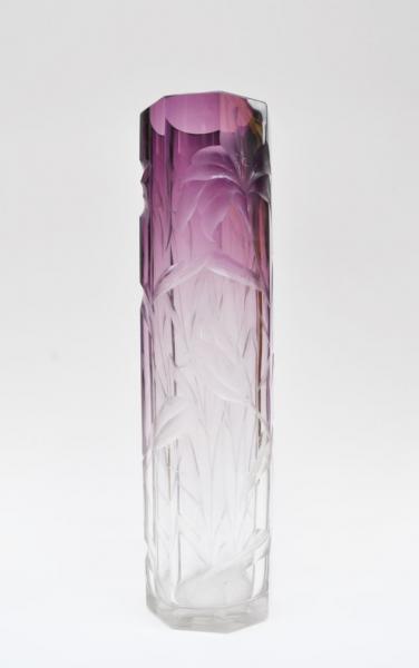 efektní vysoká váza z bezbarvého skla, uvnitř nahoře fialově sbíhaného, hranolový oktagonální brus, přes hrany hluboce řezaný bohatý dekor lilií (”Eckentief-Gravur”), průměr 9 cm, výška 35 cm; sklárna Moser Karlsbad, kolem r. 1915; značeno dobovou leptanou značkou; sběratelsky zajímavý kus ze secesního sortimentu sklárny