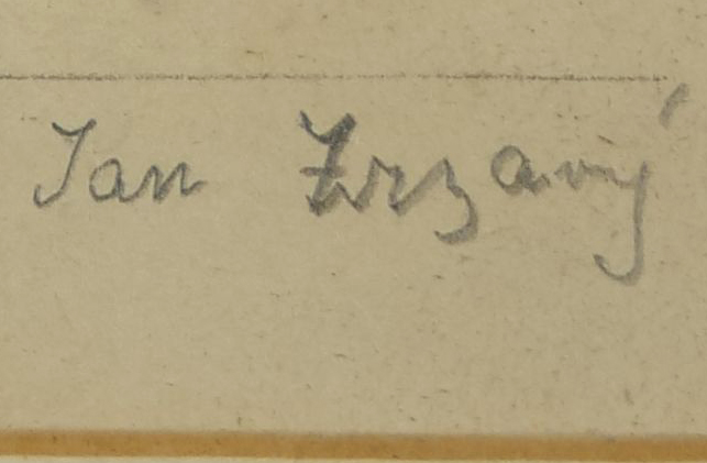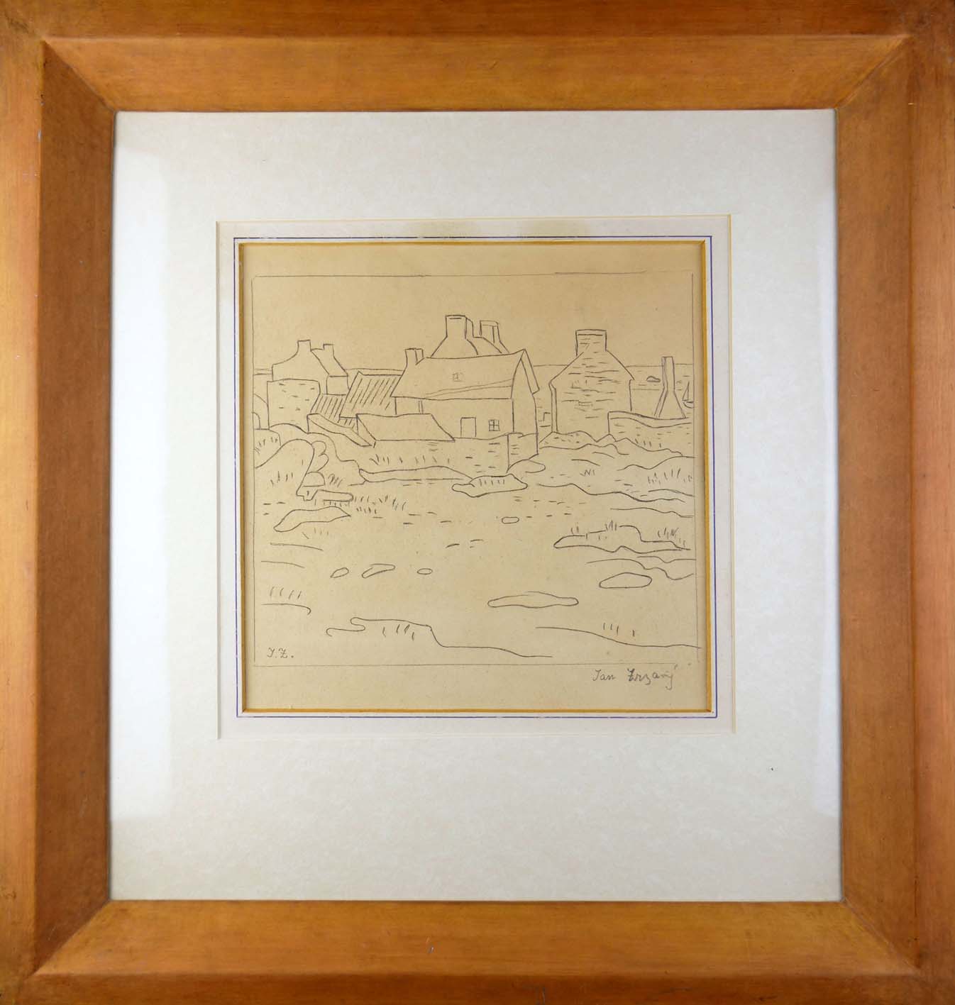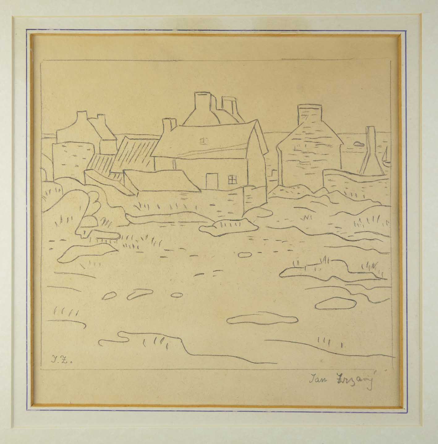 kresba tužkou na papíru, domky na pobřeží francouzského (bretaňského) ostrova Île de Sein, signováno, kresba vznikla v polovině 60. let 20. století; masivní jednoduchý dřevěný rám, lepenková pasparta, zaskleno, rozměr (ve výřezu pasparty) 19 x 19 cm, vnější rozměr s rámem 40 x 38 cm; znalecký posudek; Jan Zrzavý (1890-1977), významná postava českého výtvarného umění, avantgardní osobitý výtvarník, národní umělec
