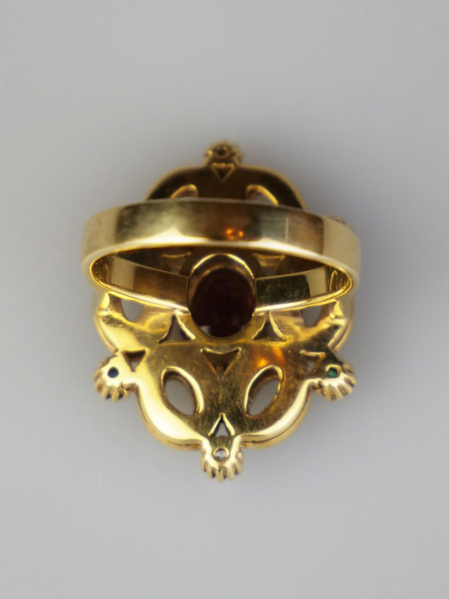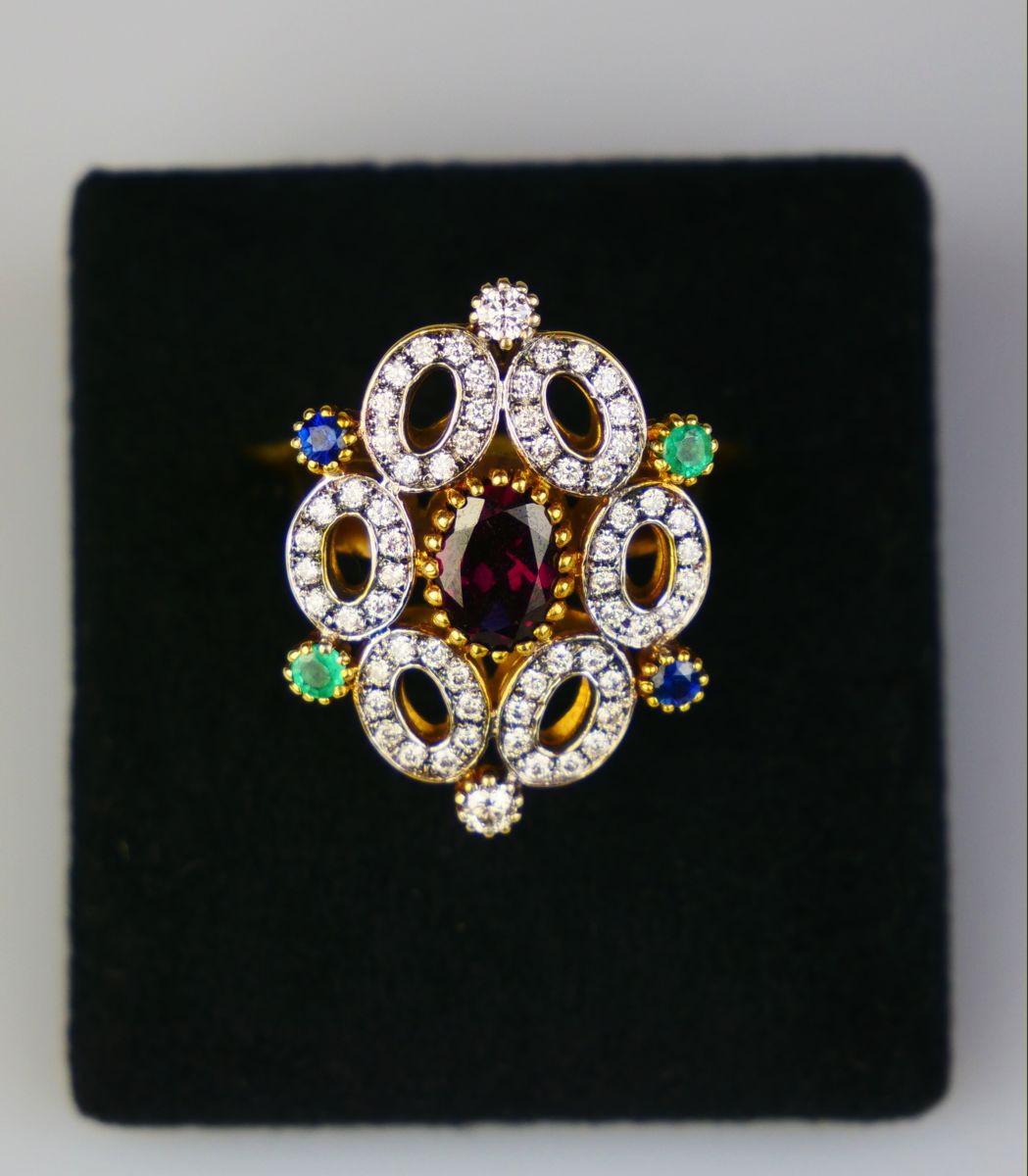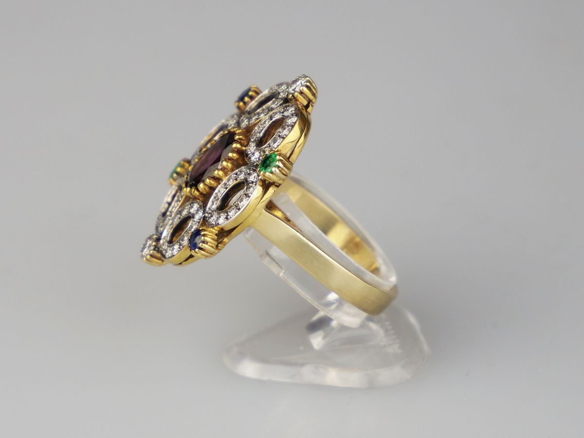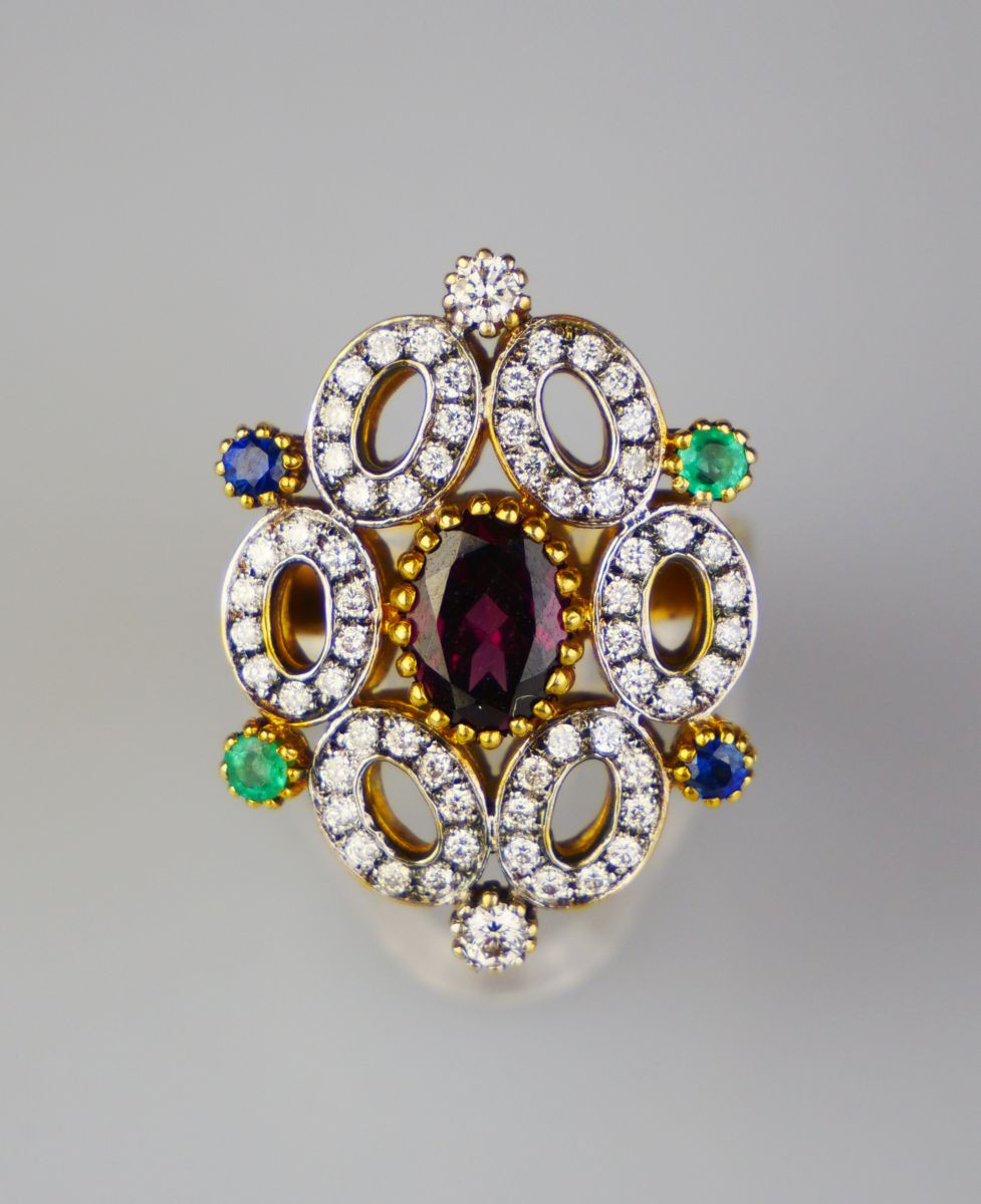zlatý prsten s diamanty, s centrálním rhodolitem, se smaragdy a se safíry, 62 ks diamantů briliantového brusu o celkové hmotnosti cca 1,25 ct, Au 7,47 g/585/1000, východní Evropa, kolem r. 1995, pozdější český punc (labuť); velikost hlavy 2 x 2,6 cm, velikost prstenu 57