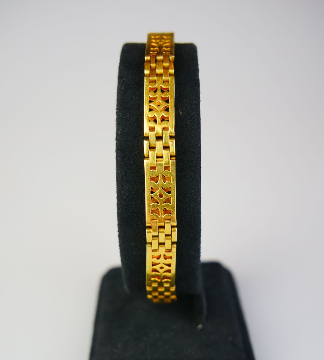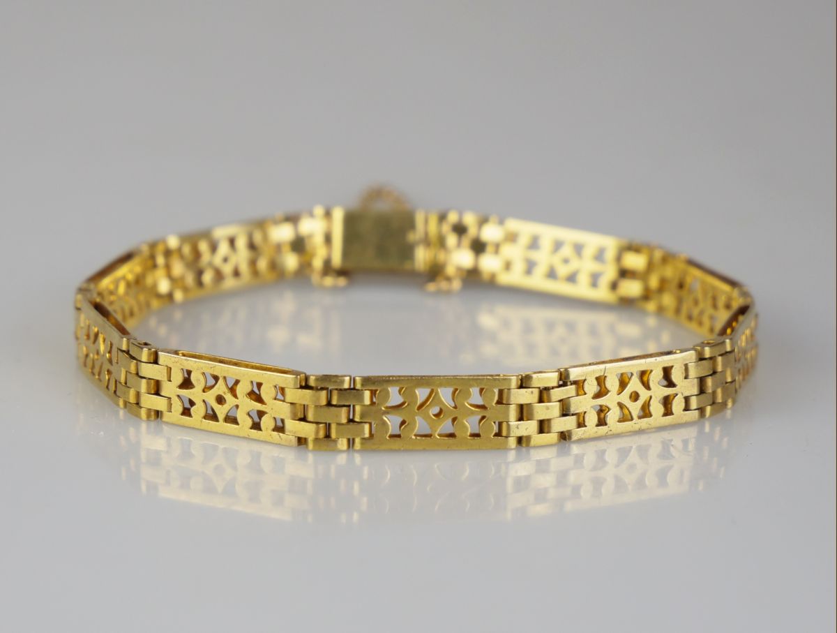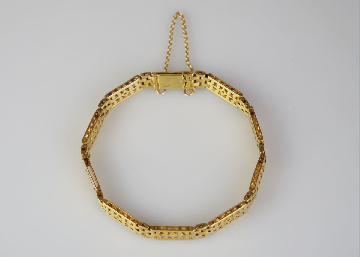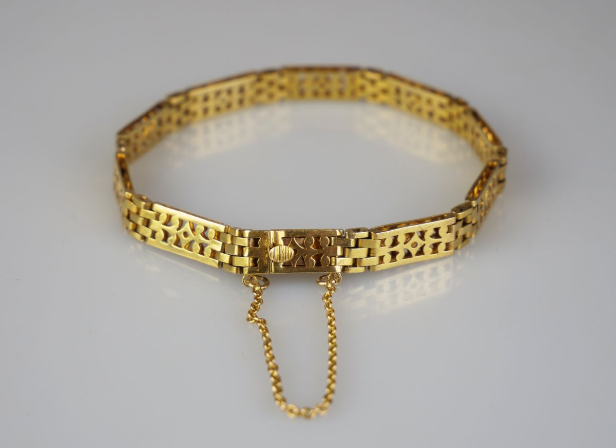 zlatý secesní článkový náramek, Au 14,51 g/585/1000, západní Evropa, kolem r. 1910, dobový dovozový punc do Rakousko-Uherska (AW) se značkou vídeňského Puncovního úřadu; šířka 0,6 cm, délka 19,5 cm