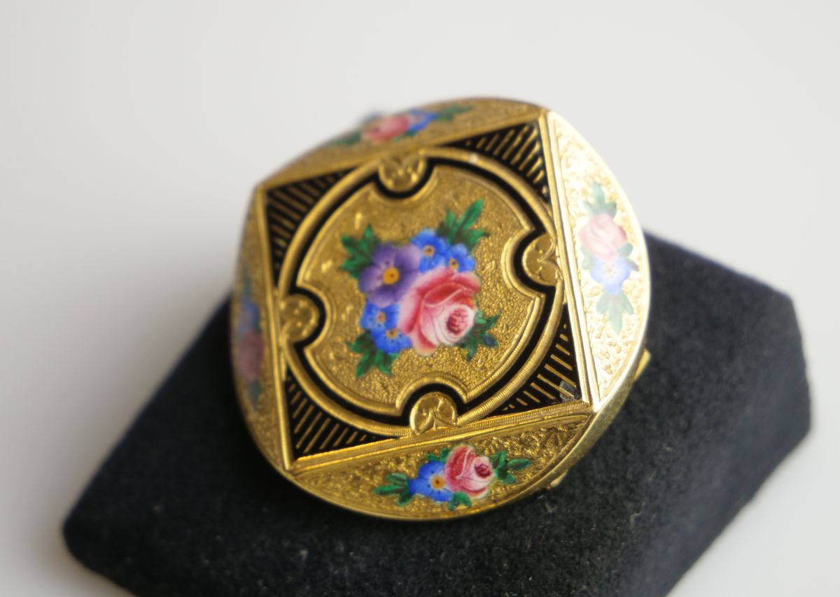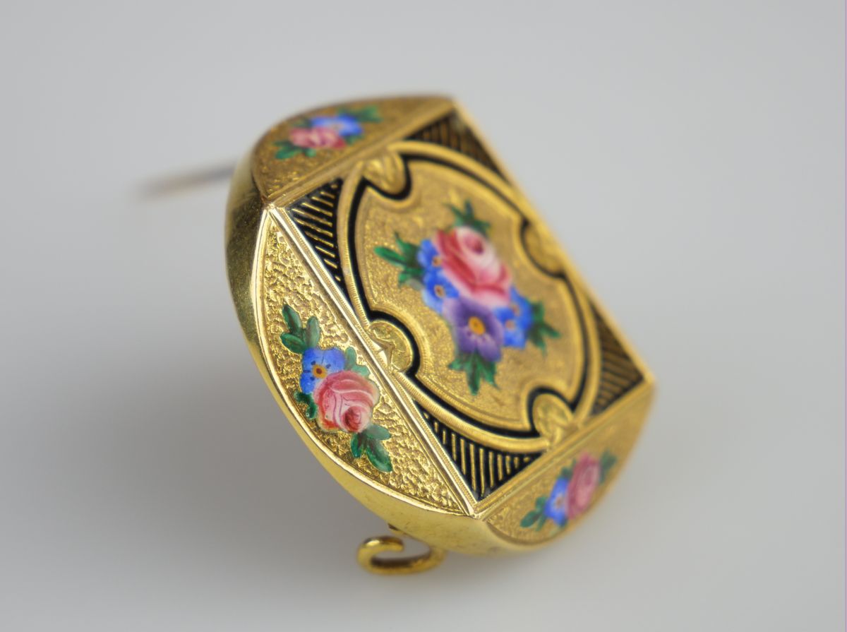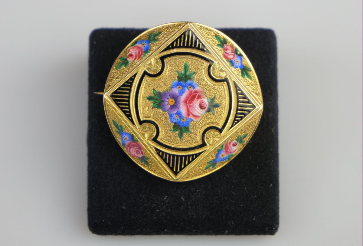 zlatá brož kruhového tvaru se středovým čtvercem a zkosenými okraji, zdobená barevnými emaily, květinový dekor je kombinovaný s černými linkami, gravírováním a pointilisticky cizelovanými plochami, Au 9,80 g750/1000, jehla z obecného kovu, západní Evropa, kolem r. 1880; atest Puncovního úřadu; rozměr 3,4 x 3,4 cm; pěkná netradiční práce