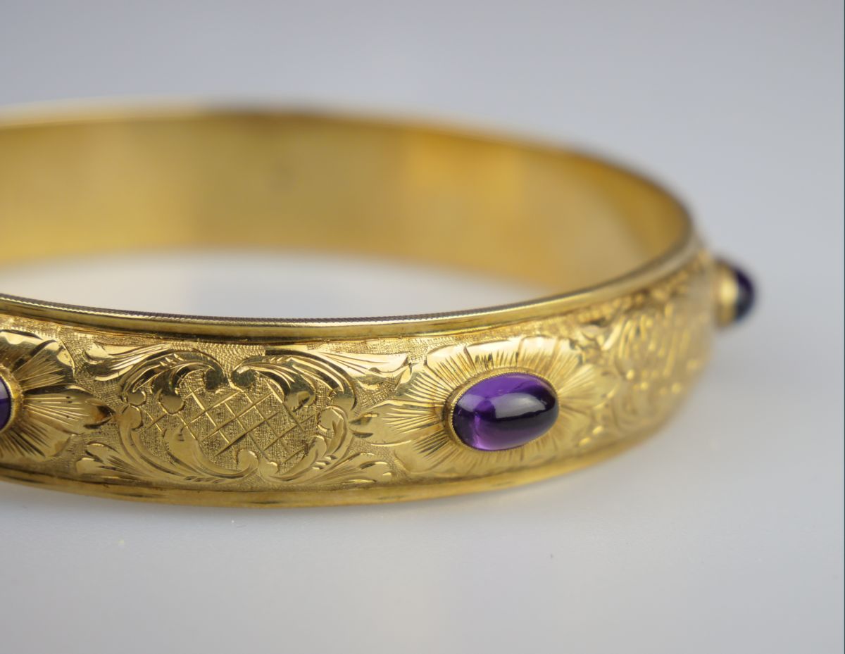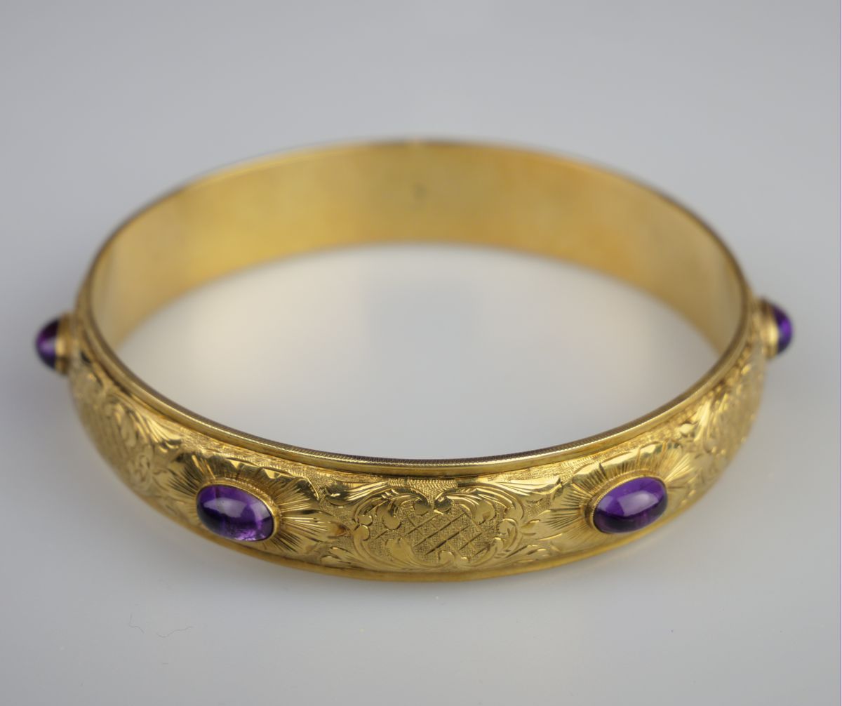 zlatý kruhový náramek s ametystovými muglemi, po celém obvodu zdobený gravírováním, Au btto 20,84 g/585/1000, československý meziválečný dovozový punc (lyra), západní Evropa, kolem r. 1935; obvod 21,5 cm