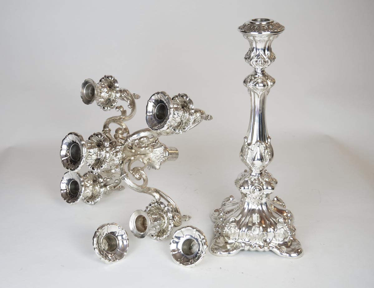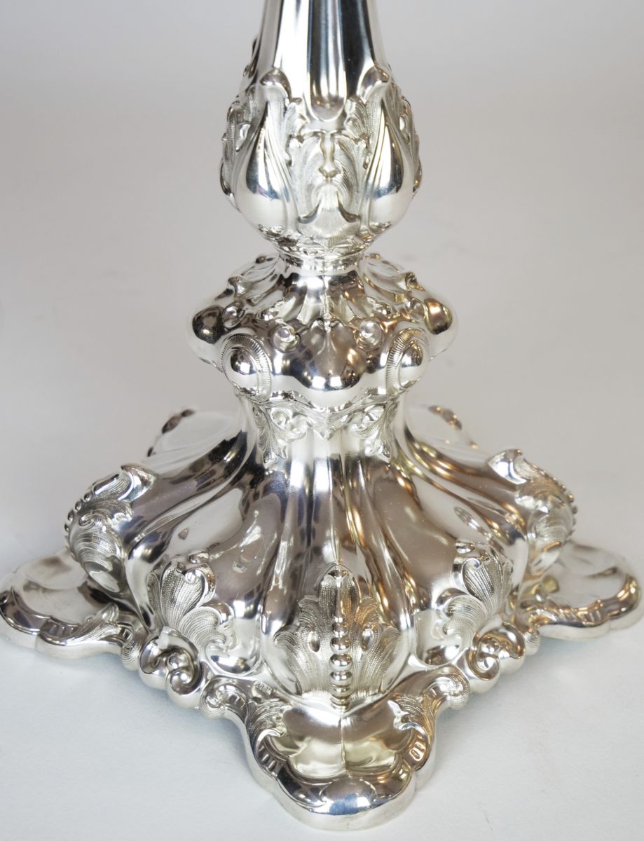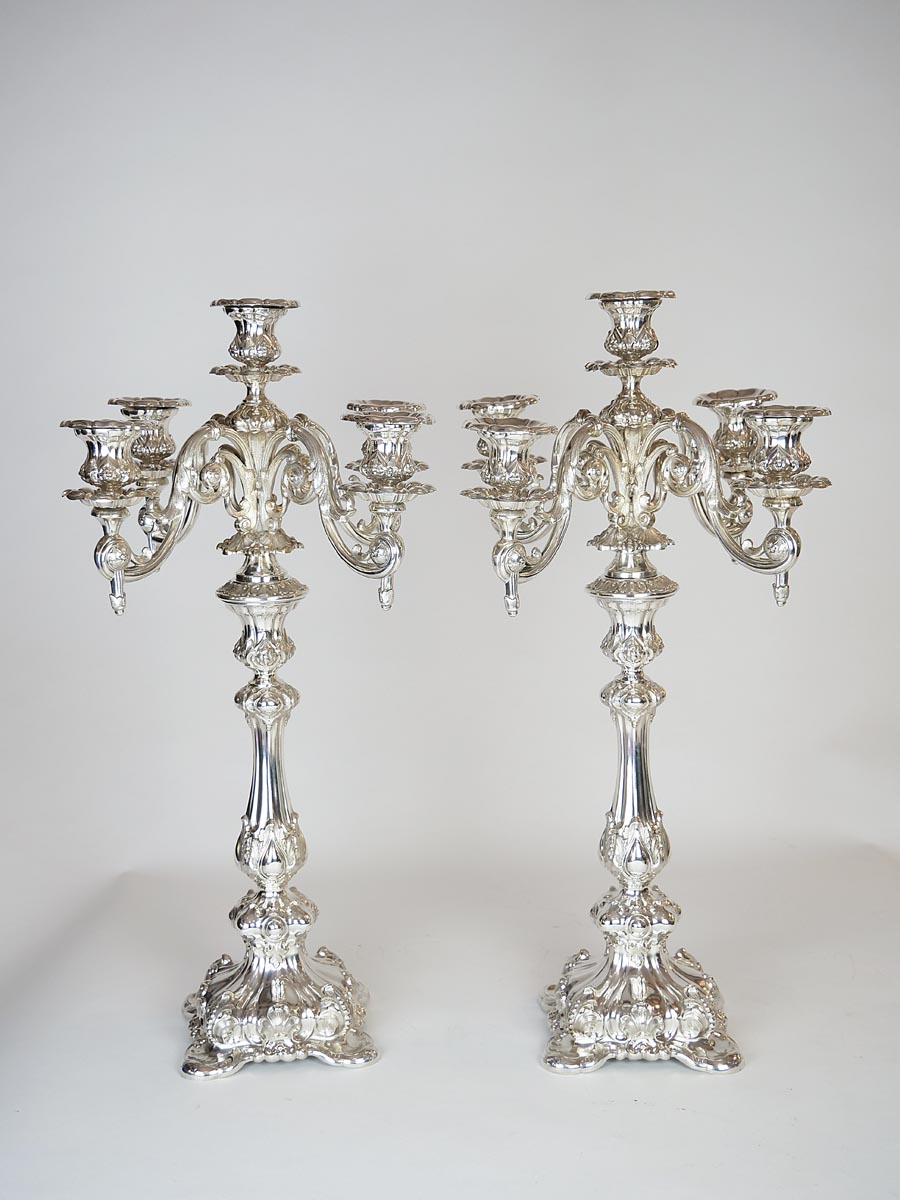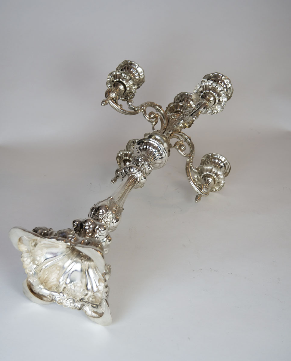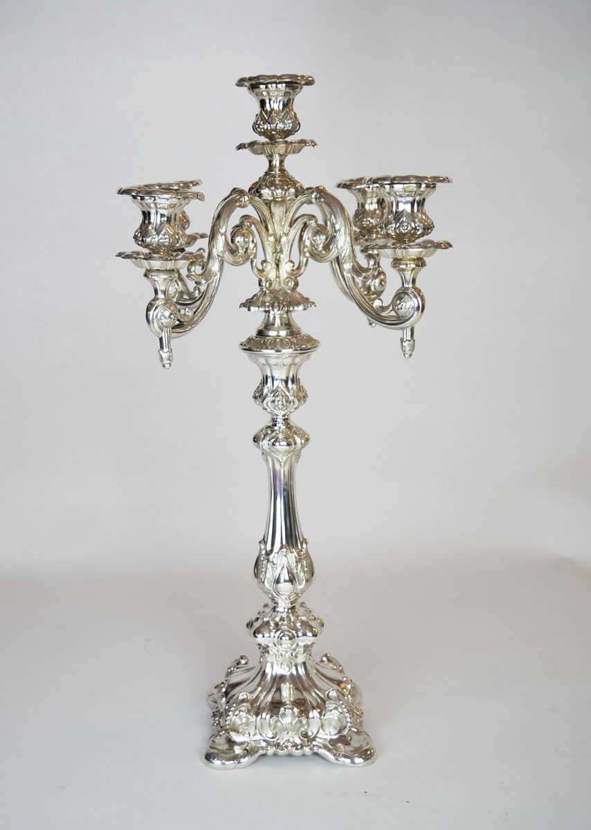 dvě vysoké stříbrné čtyřramenné žirandoly na 5 svíček, samotný kandelábr je možné použít na jednu svíci, Ag 2206,7 g/800/1000, západní Evropa, kolem r. 1870; výška 50 cm (!), průměr odnímatelné koruny 29 cm; atest Puncovního úřadu