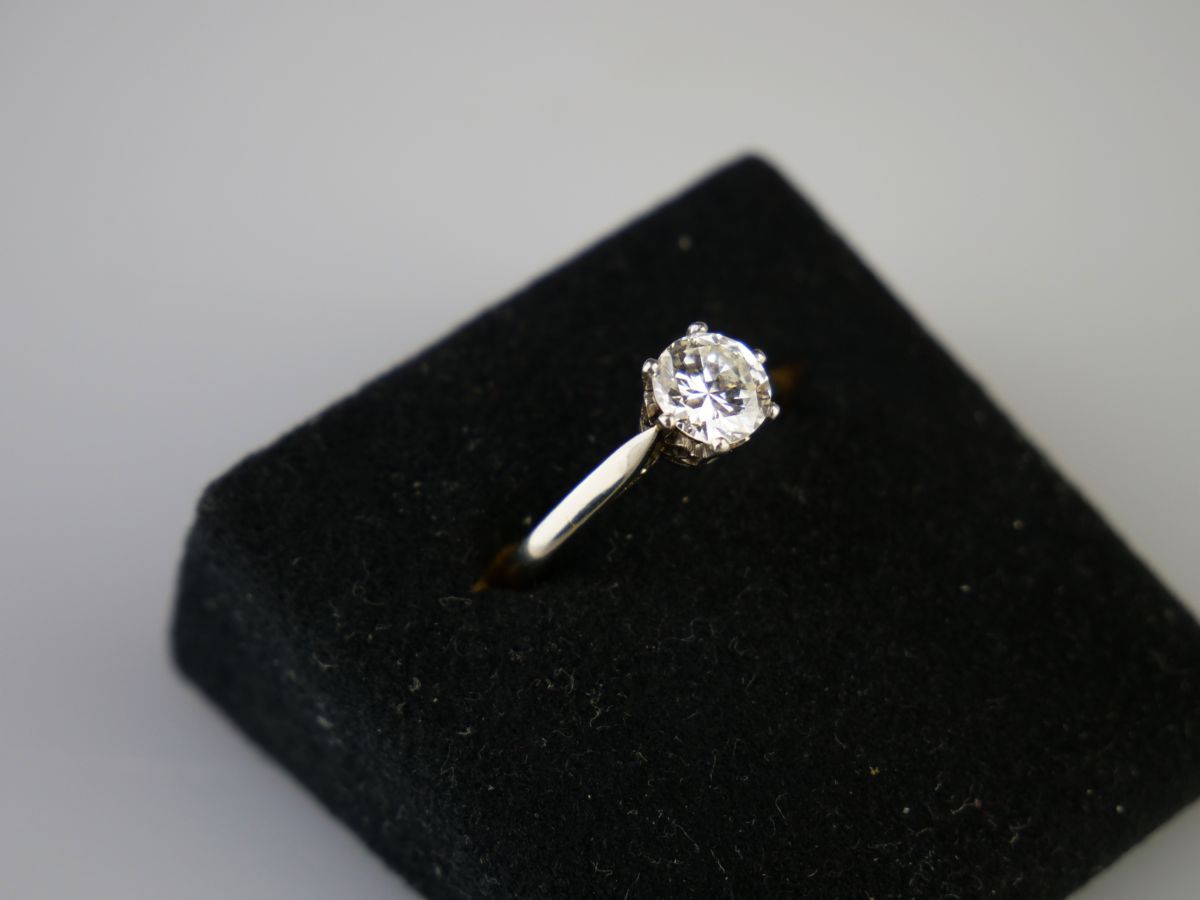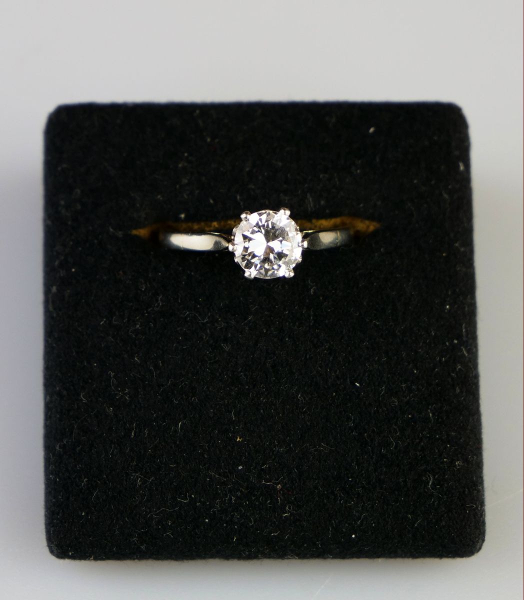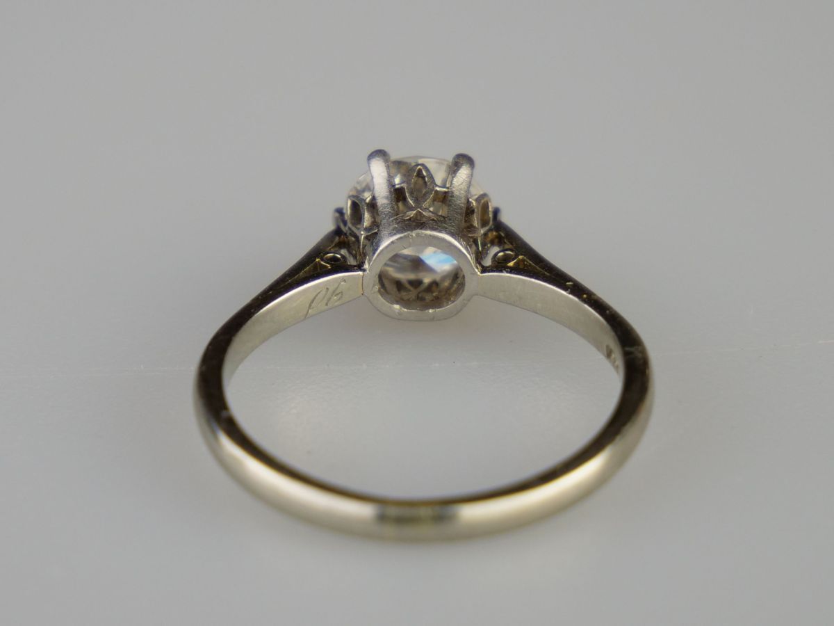 prsten z bílého zlata s kvalitním solitérním diamantem přechodového briliantového brusu o hmotnosti cca 0,90 ct, čistota VVS, vzácně bílá barva E-F-G, Au btto 2,66 g/585/000, precizně provedený ”krajkový” design korunky prstenu, Československo, kolem roku 1935, zhotovil významný pražský zlatník Karel Ebner, dobový státní punc (lvíček) a mistrovská značka; znalecký posudek; velikost prstenu 52