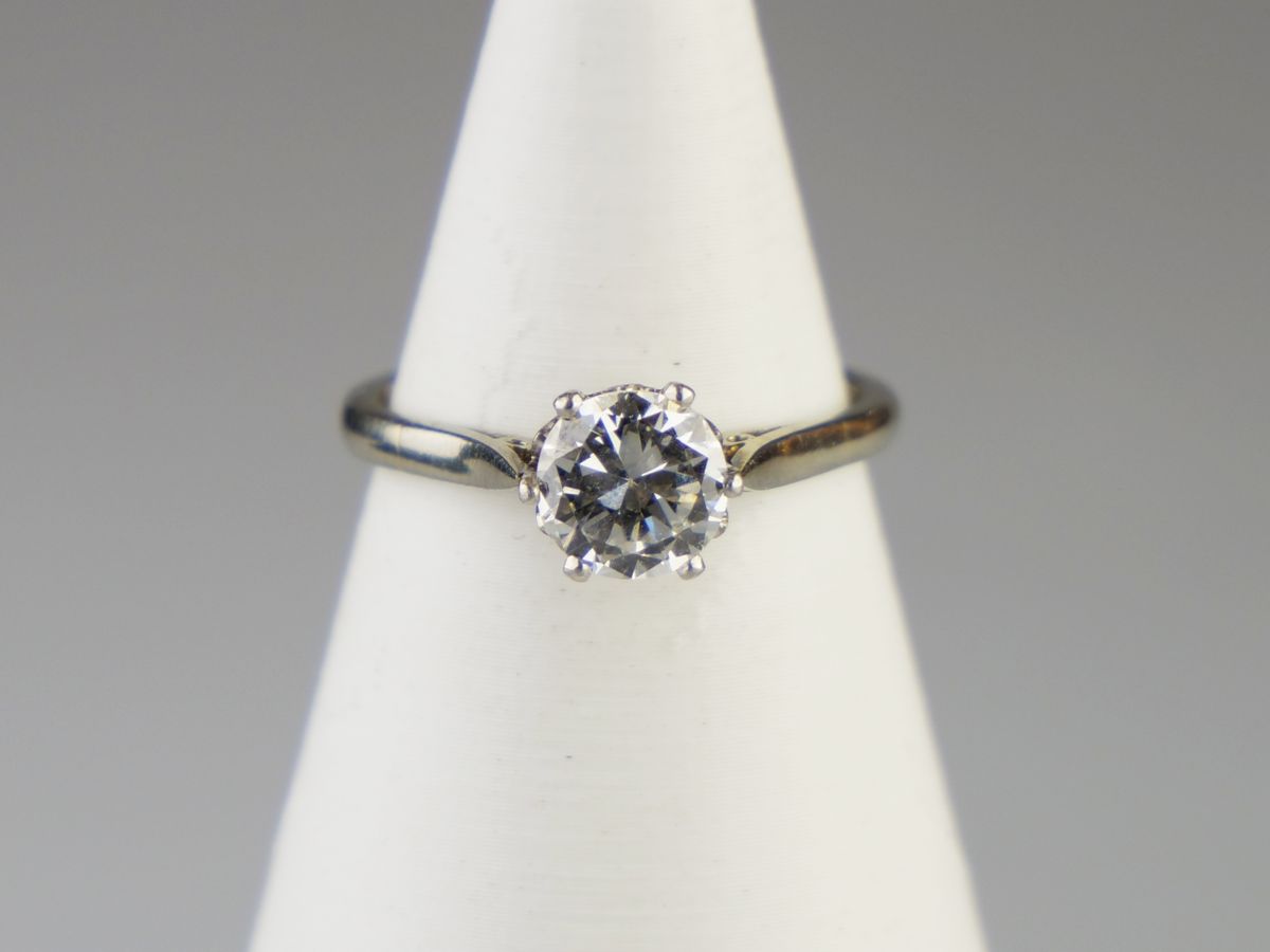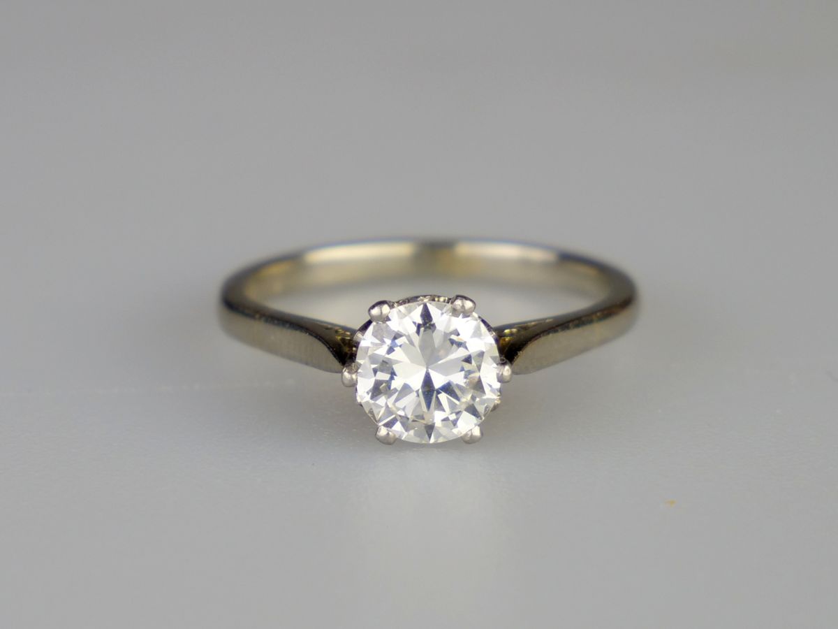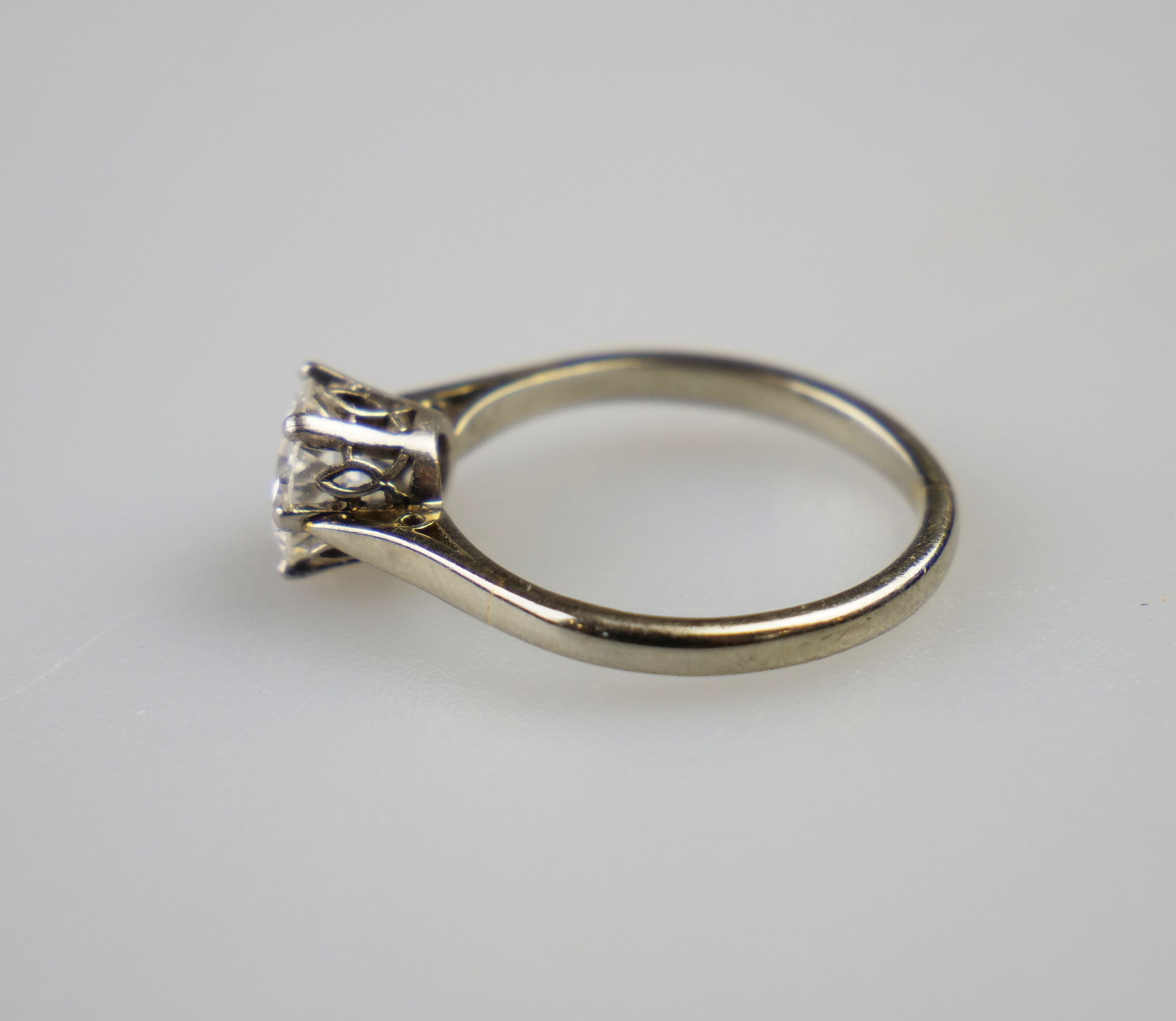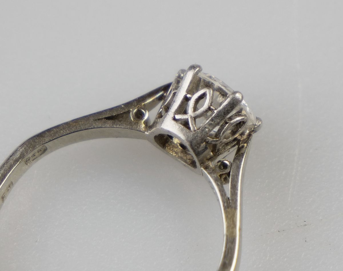 prsten z bílého zlata s kvalitním solitérním diamantem přechodového briliantového brusu o hmotnosti cca 0,90 ct, čistota VVS, vzácně bílá barva E-F-G, Au btto 2,66 g/585/000, precizně provedený ”krajkový” design korunky prstenu, Československo, kolem roku 1935, zhotovil významný pražský zlatník Karel Ebner, dobový státní punc (lvíček) a mistrovská značka; znalecký posudek; velikost prstenu 52
