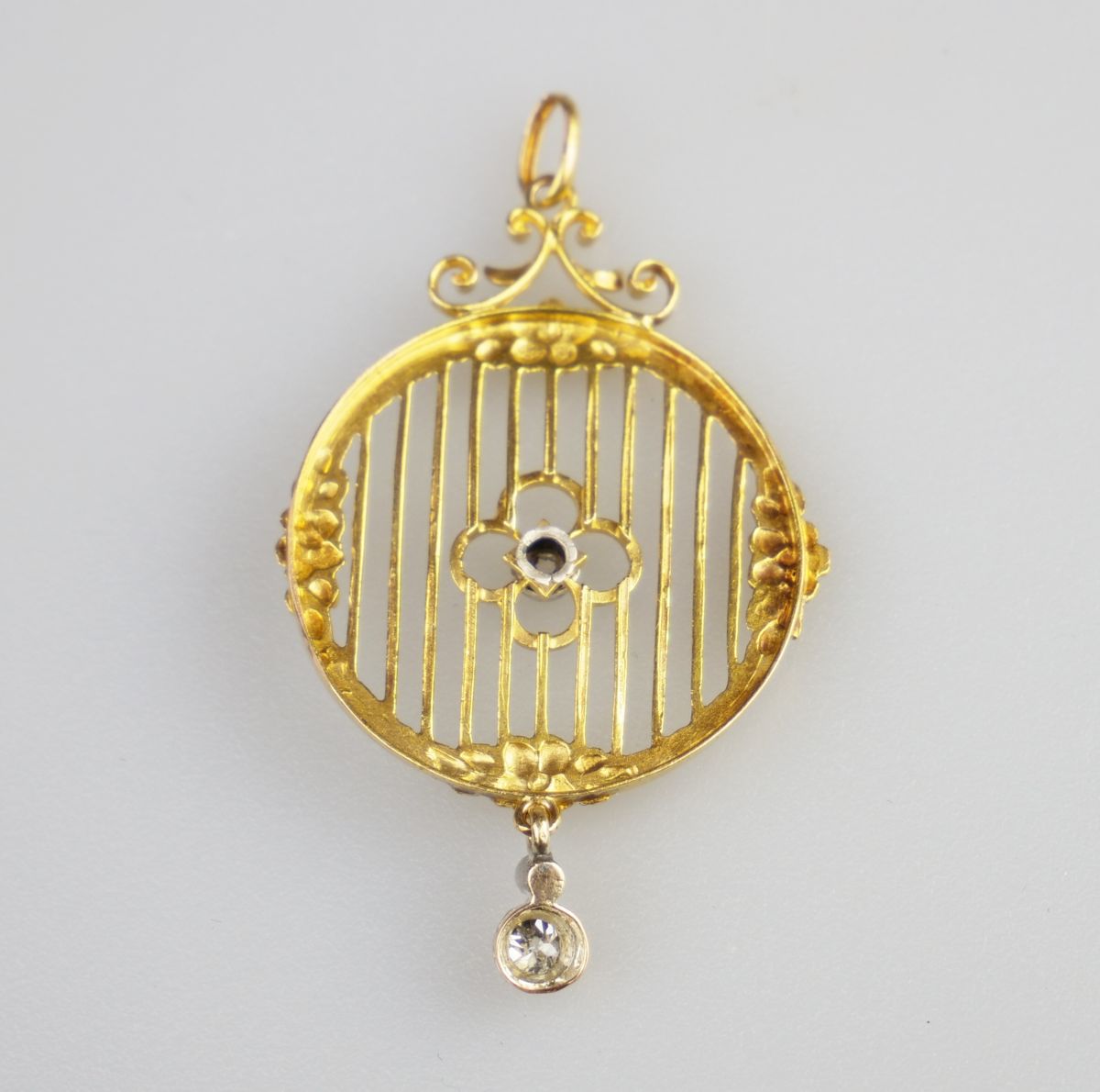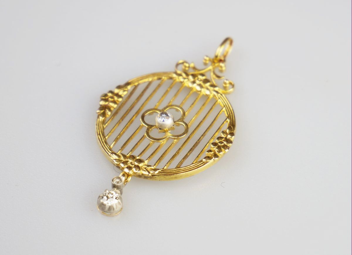 zlatý secesní přívěsek se 2 diamanty starého briliantového brusu o hmotnosti cca 0,15 ct a s 1 diamantovou routou, Au 3,35 g/580/1000, střední Evropa, kolem r. 1910; atest Puncovního úřadu, rozměr 4,8 x 2,8 cm