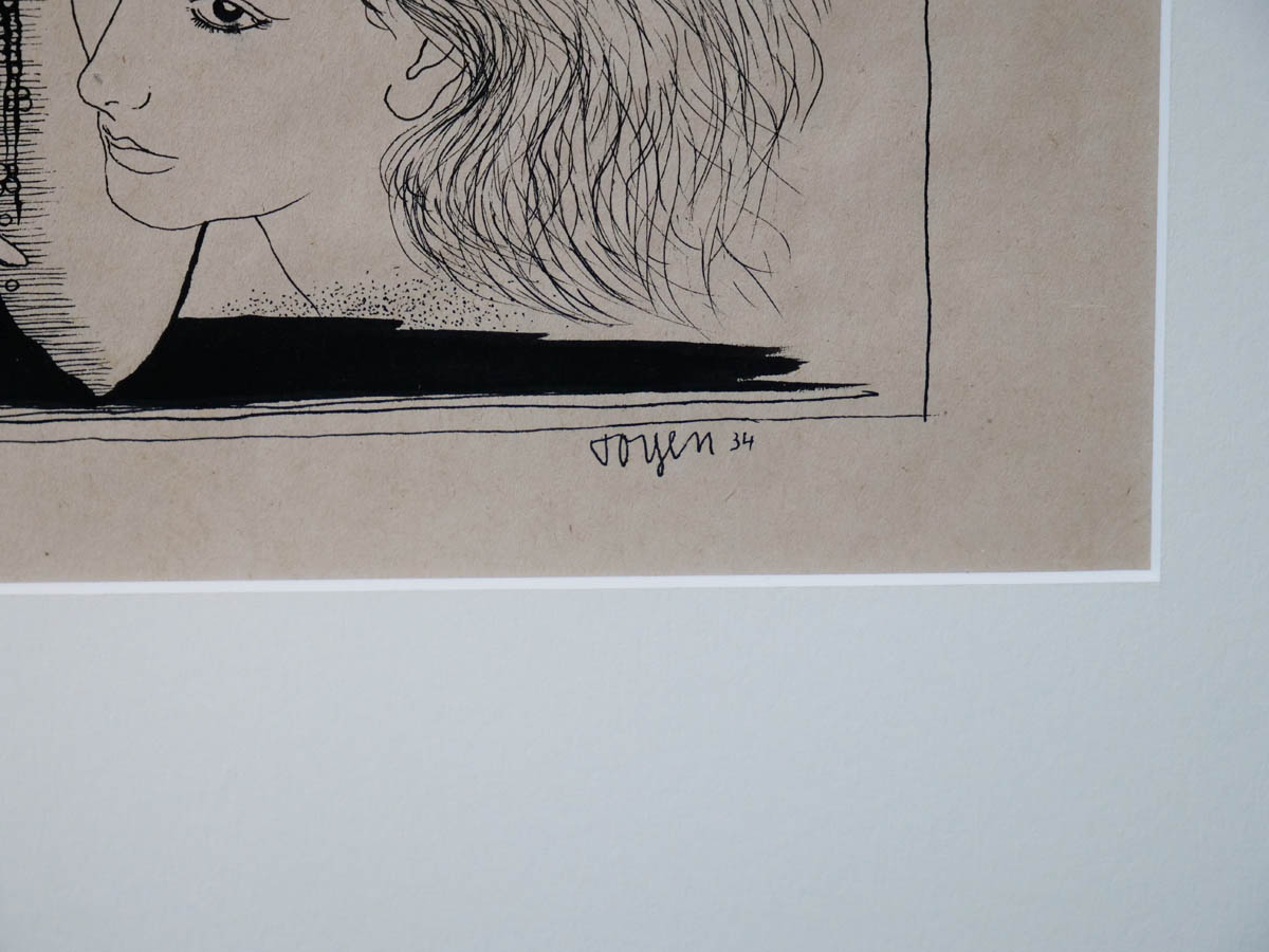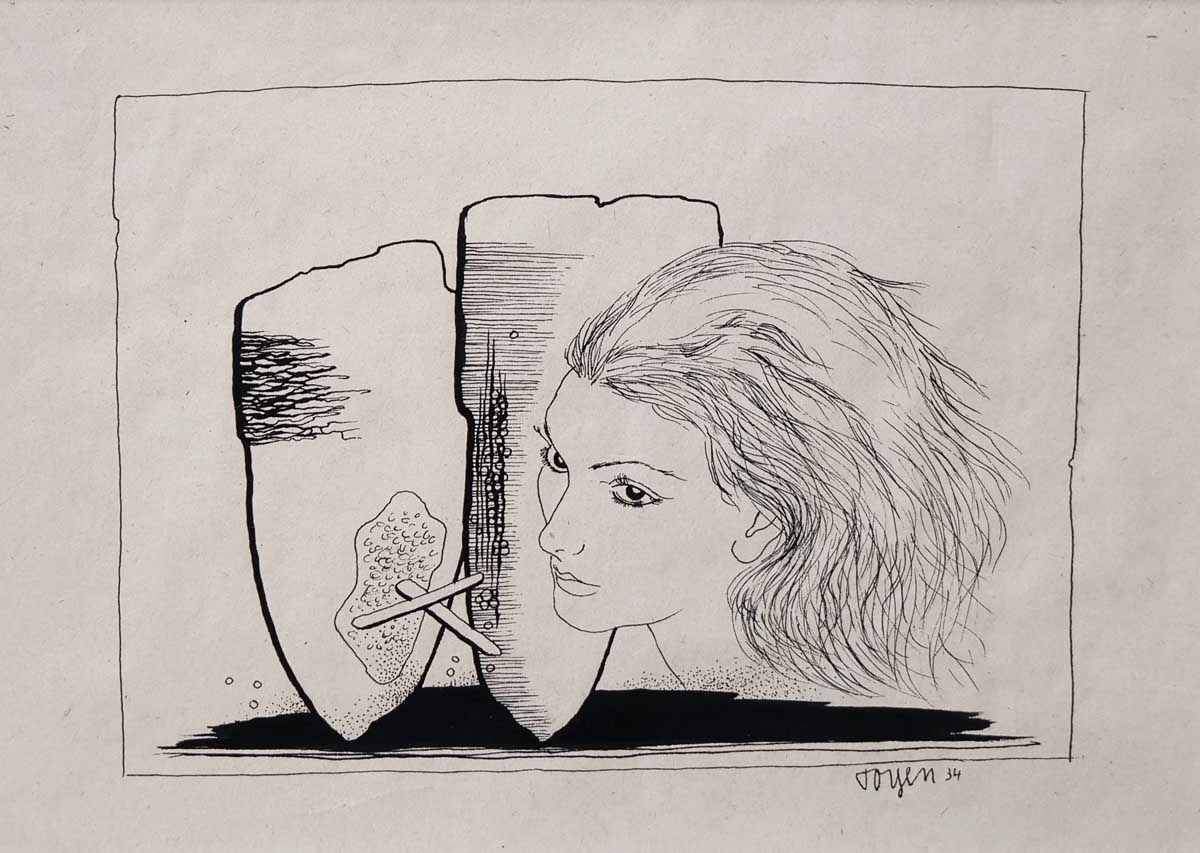 abstraktní kompozice s portrétem dívky, kresba tuší na papíru, rozměry 19,5 x 25,2 cm, signováno a datováno vpravo dole ”Toyen 34”; pozdější rám; pěkná ukázka práce Toyen z 30. let; znalecký posudek; Marie Čermínová-TOYEN (1902 Praha -1980 Paříž), významná česko-francouzská malířka, představitelka evropského surrealismu