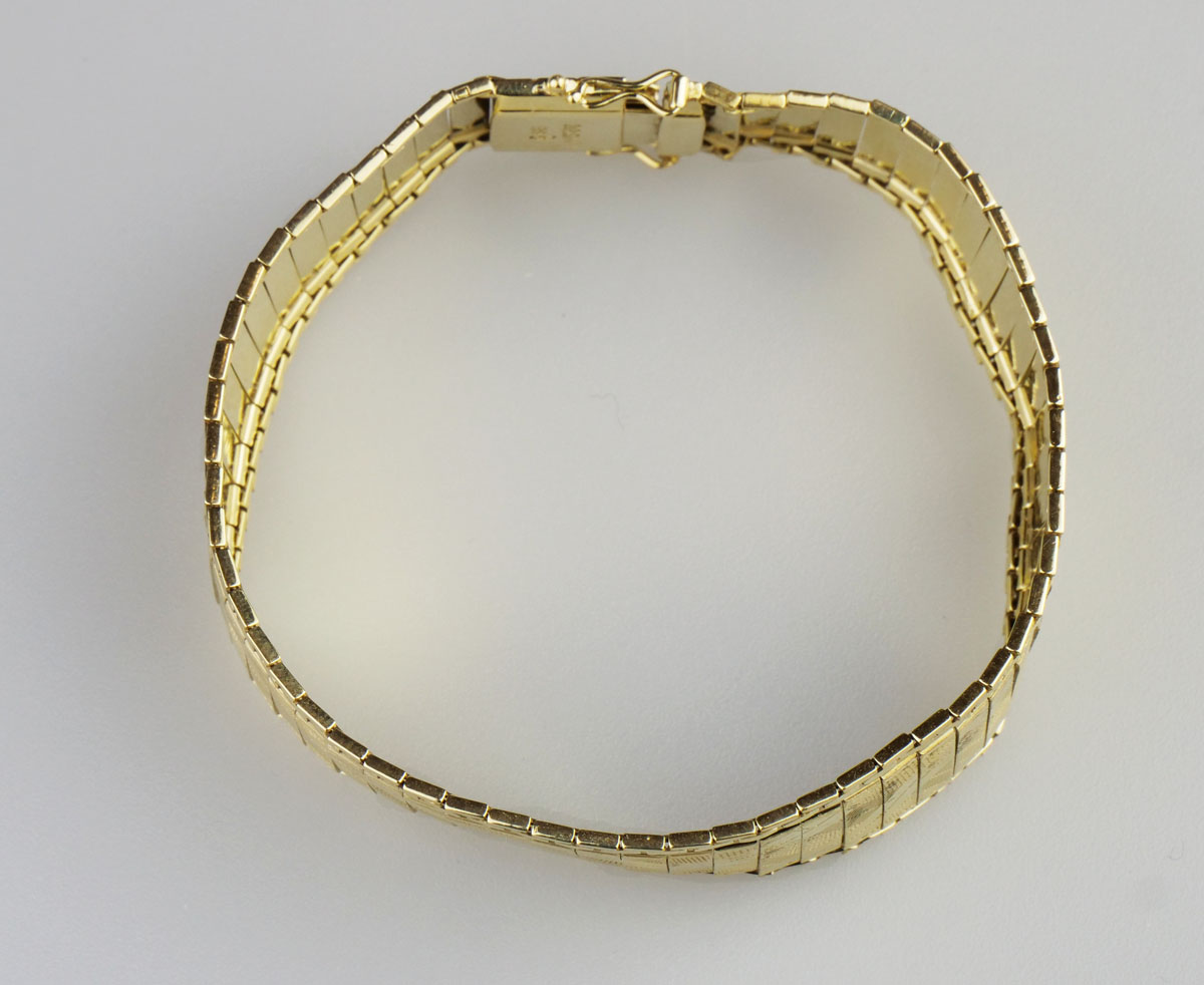 zlatý ”hadí” náramek z drobných obdélníkových článků pospojovaných řetízky, v celé ploše rafinované vlnkovité gilošování s optickým efektem, Au 20,07 g/585/1000, Německo, kolem r. 1935, značka chráněného německého designu, dovozový punc do ČSR (lyra); délka 18 cm
