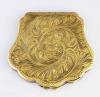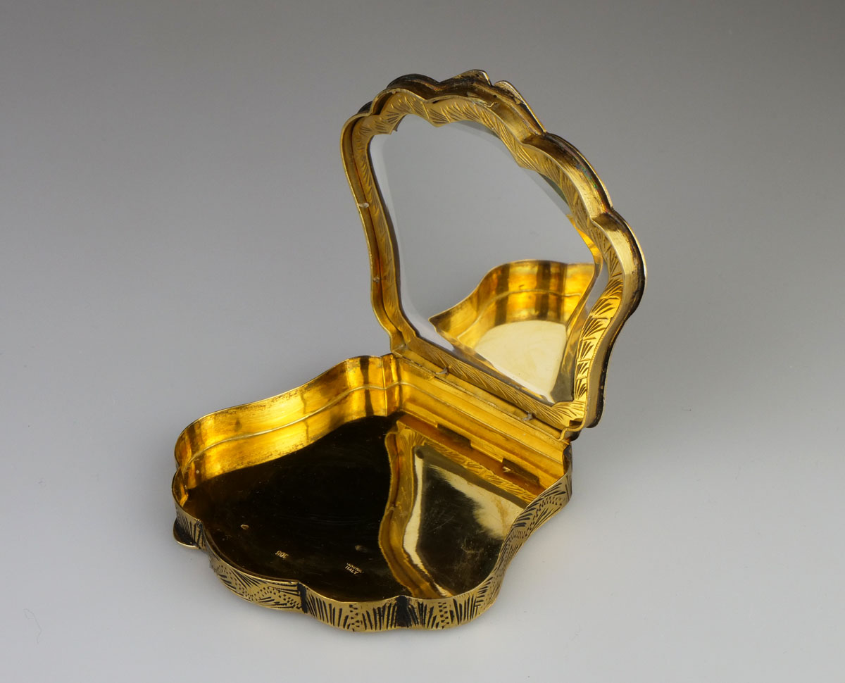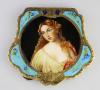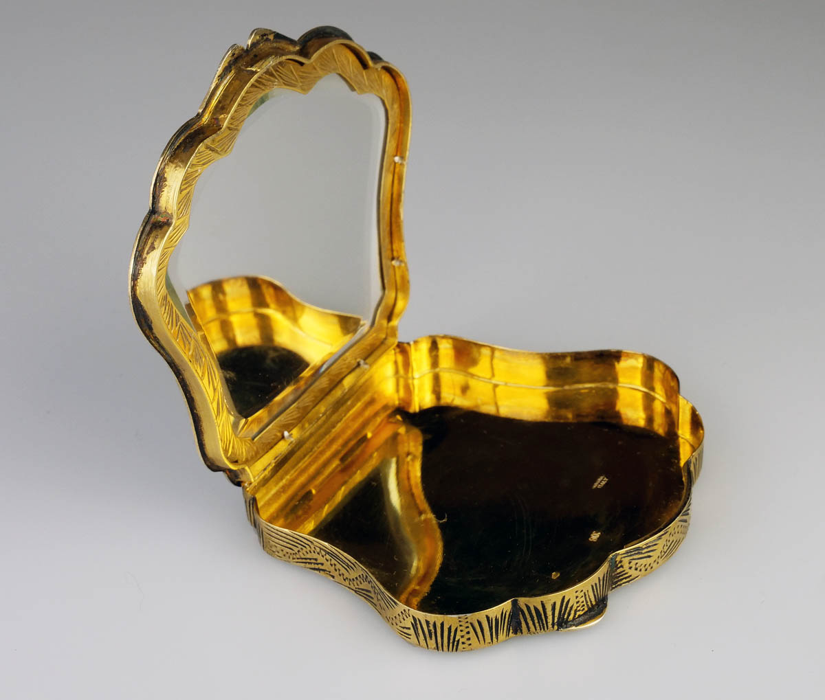 dekorativní pudřenka mušlového tvaru ze zlaceného stříbra, uvnitř zabrušované zrcátko, víčko zdobené emailovou malbou mladé ženy v historizujícím stylu, dno bohatě gravírované stylizovaných rostlinným motivem, Ag 92,67 g/800/1000, Itálie, kolem r. 1920; atest Puncovního úřadu, rozměry 8,5 x 7,5 x 1 cm; sběratelsky zajímavé