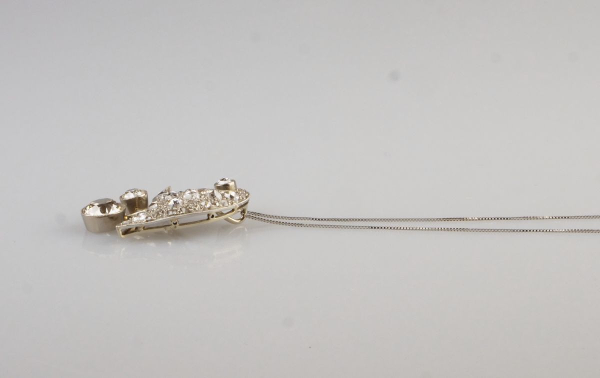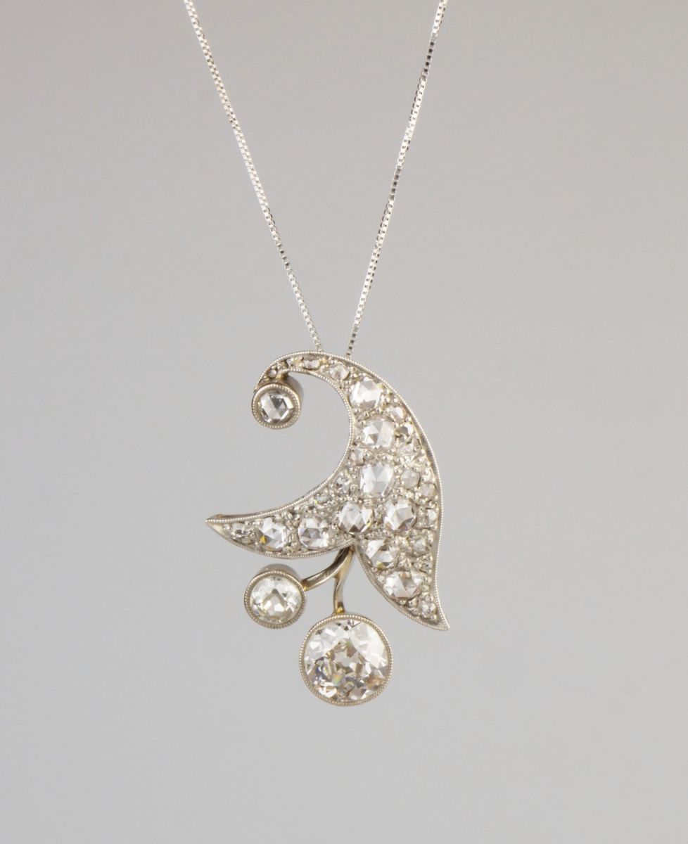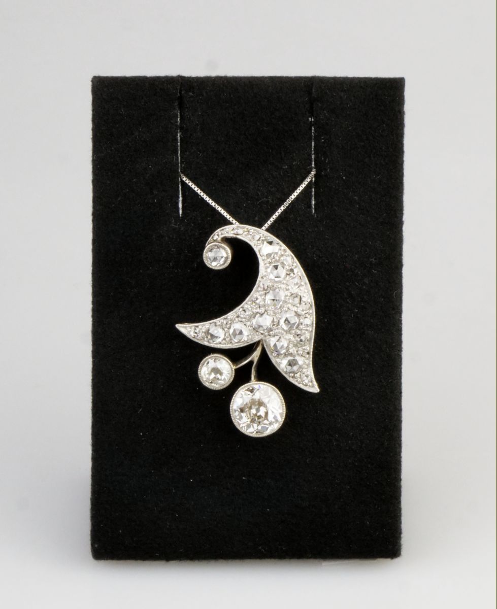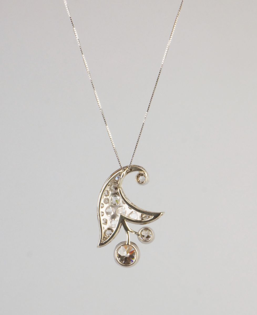 přívěsek z bílého zlata ve tvaru stylizovaného květinového zvonečku, Au btto 5,26g/585/1000, diamanty briliantového brusu o celkové hmotnosti 4,39 ct, největší diamant starého briliantového brusu o hmotnosti 1,86 ct, barva K-L, čistota VS2, mezi ostatními kameny jsou routy vzácně velmi dobré kvality; Československo, kolem r. 1935, punc ”lvíček”; rozměry přívěsku jsou 3,25 x 2,39 cm; pěkná zlatnická práce, znalecký posudek