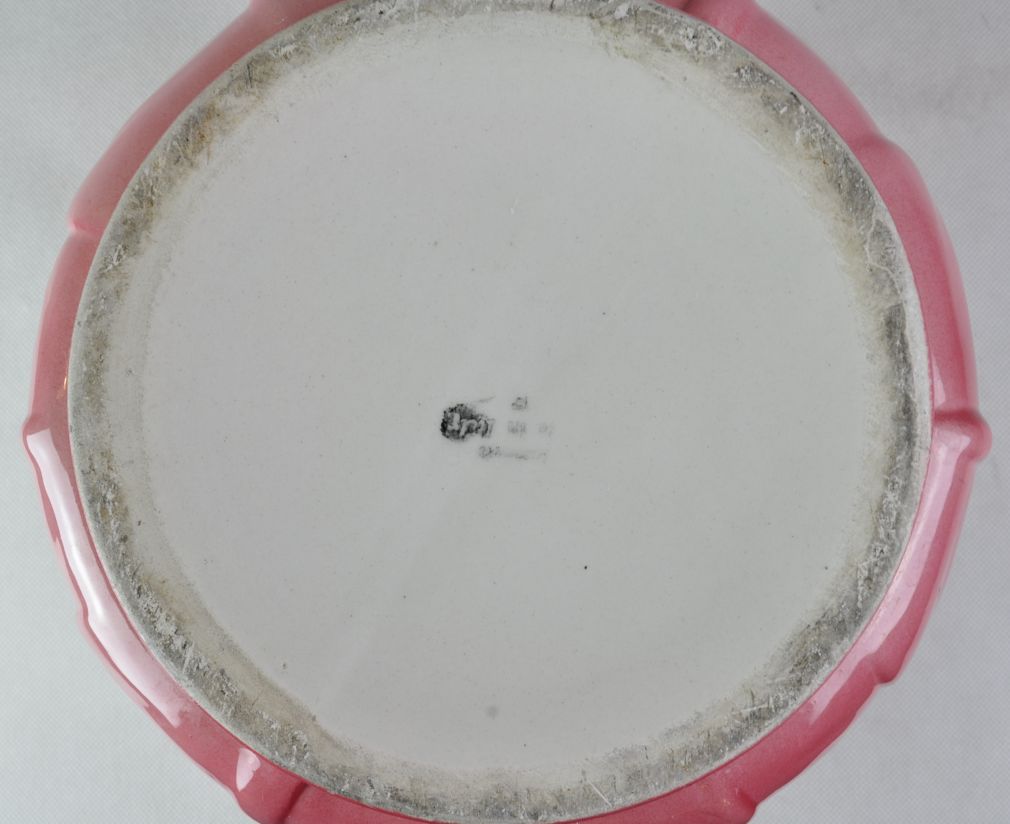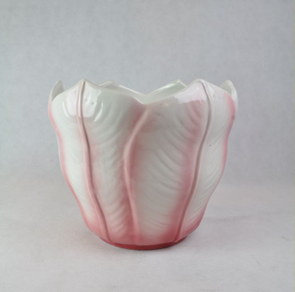 secesní nádoba na květináč, tvrdá kamenina, růžovobílý rostlinný dekor, pravděpodobně Německo, kolem roku 1915, neznačeno; výška 21 cm, průměr 25 cm