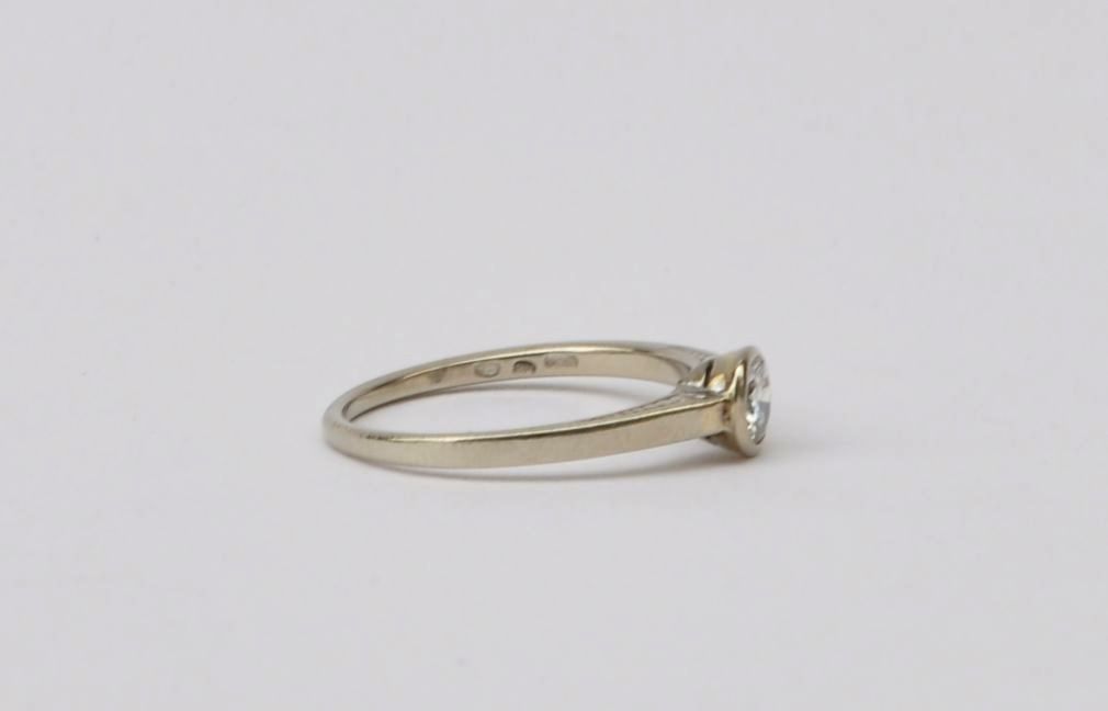 prsten z bílého zlata s kvalitním solitérním diamantem briliantového brusu o váze cca 0,25 ct, Au btto 1,91g/585/000, Československo, kolem roku 1925; velikost prstenu 54