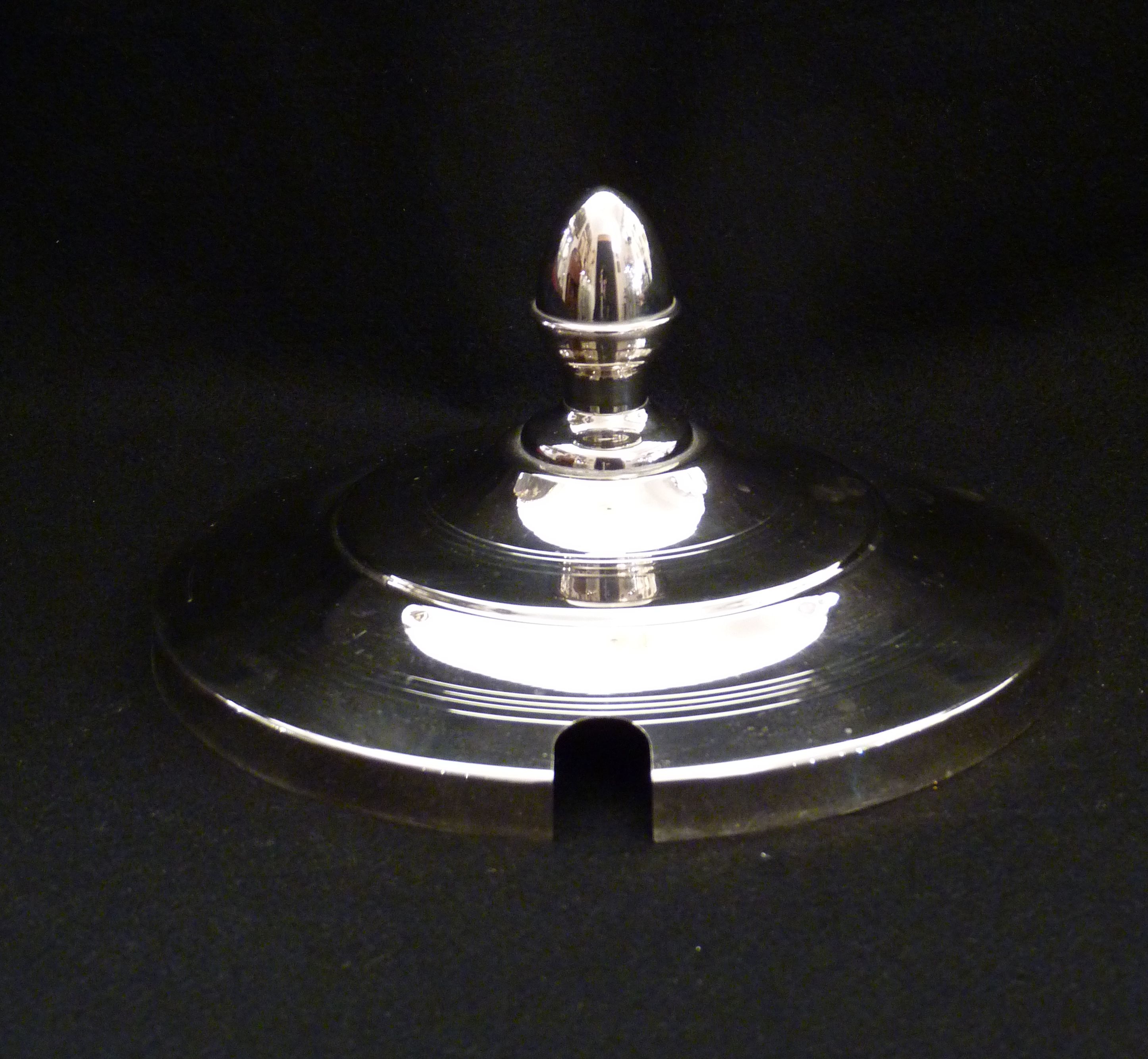 pozdně secesní nádoba z pochromovaného kovu a s probrušovaným sklem, použitelná bez víka také jako váza, Německo, neznačeno, výška 380 mm, šířka 250 mm