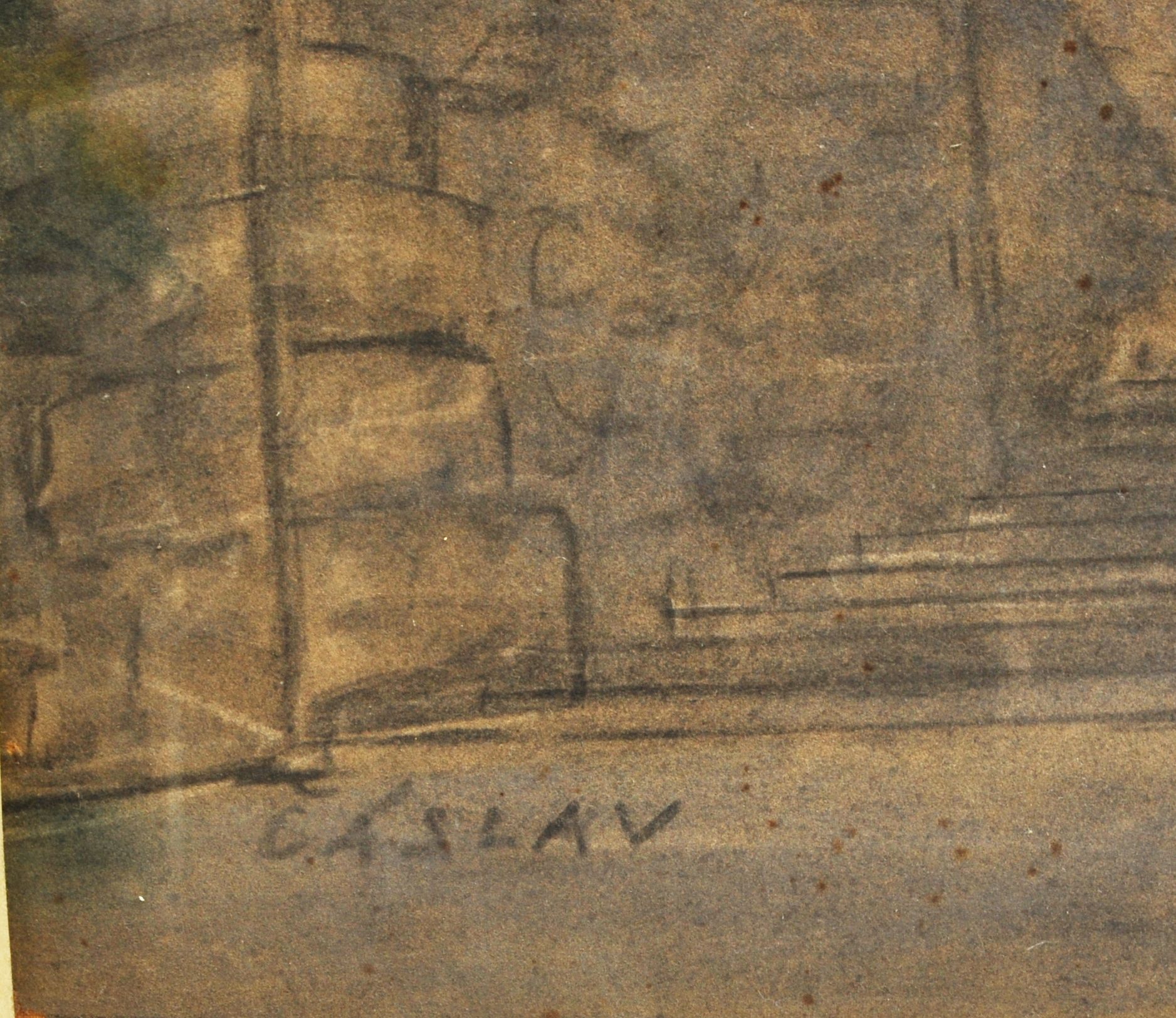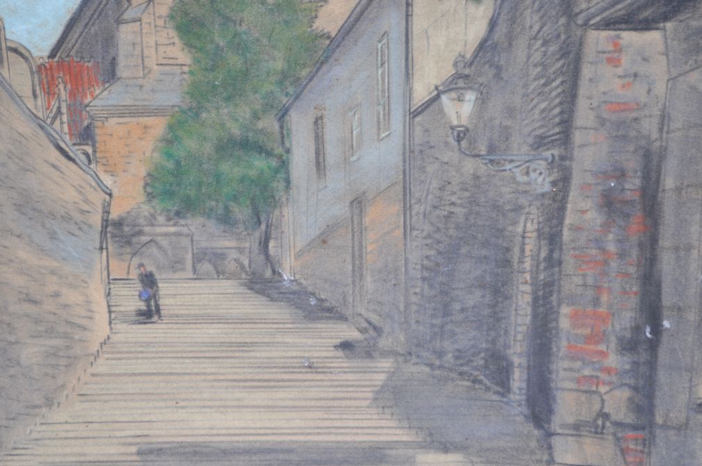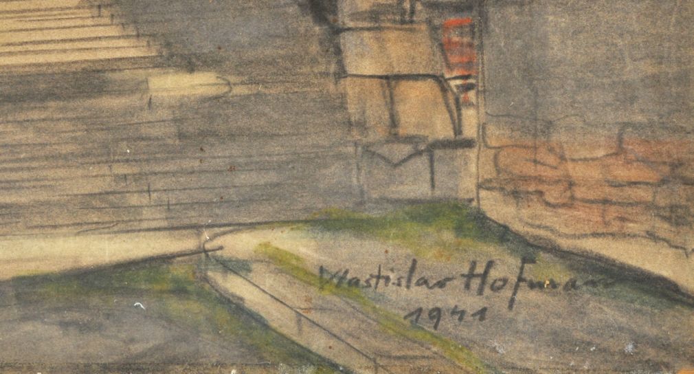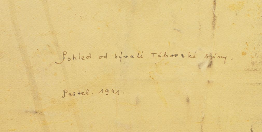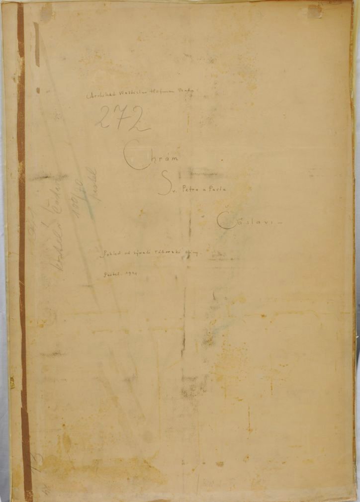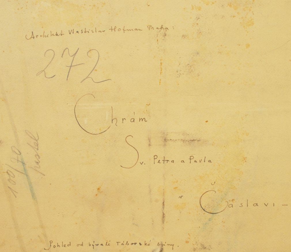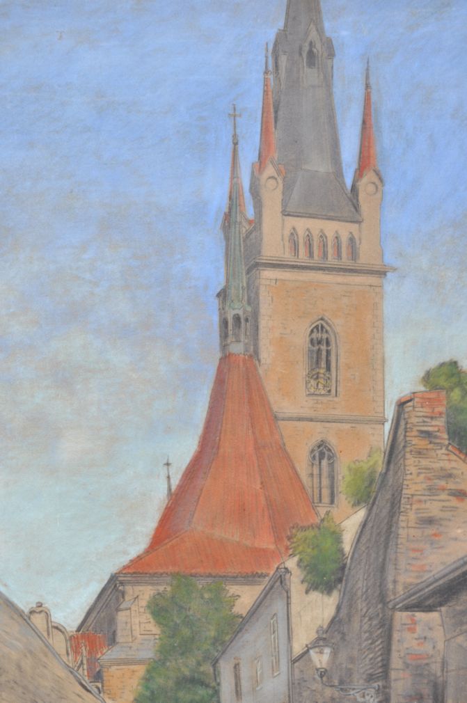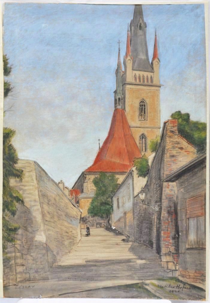 velkoformátový pastel na lepence, pohled na chrám sv. Petra a Pavla od bývalé Táborské brány v Čáslavi, přípisy na zadní straně, nerámováno, signováno Vlastislav Hofman, datováno 1941; rozměry: 98x68 cm; z rodiny autora