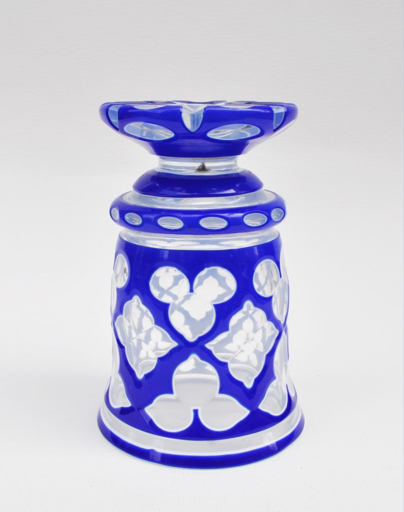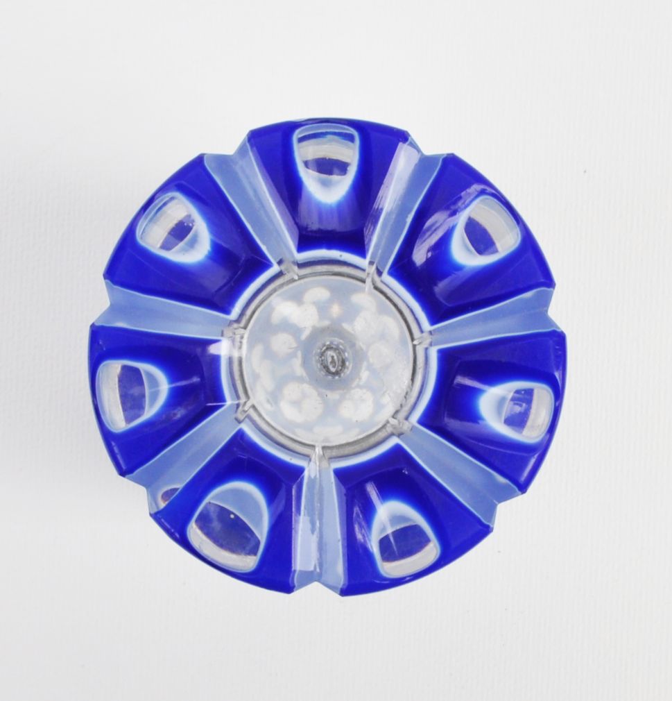 sklenice zvonovitého tvaru na patce, dvojité vrstvení mléčným a opakním kobaltovým sklem, kvalitní brus s optickým efektem, severní Čechy (Haida), kolem roku 1880, výška 13,2 cm, průměr 9 cm