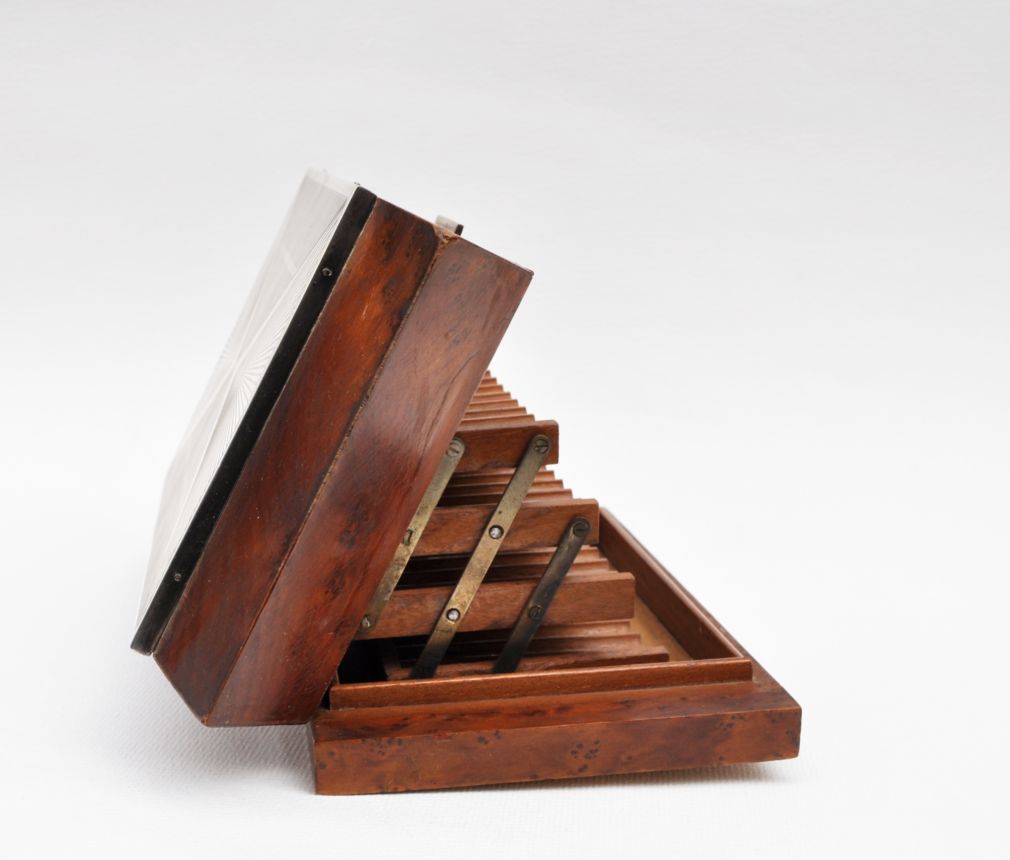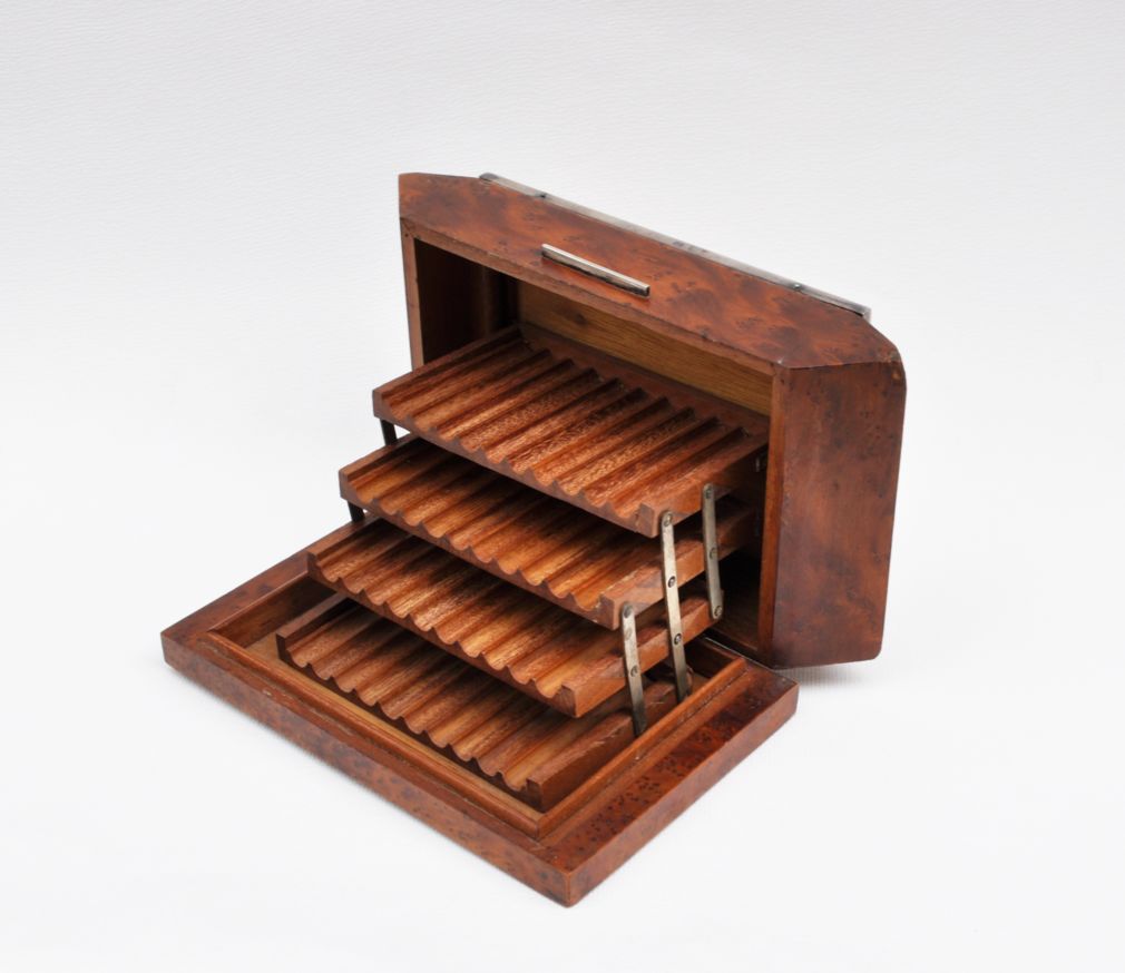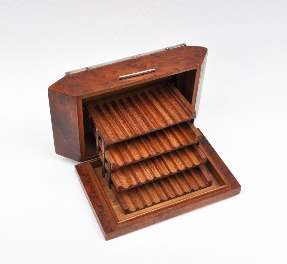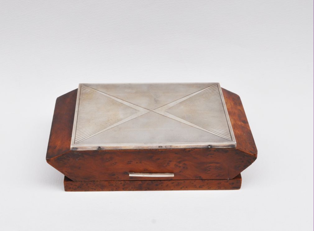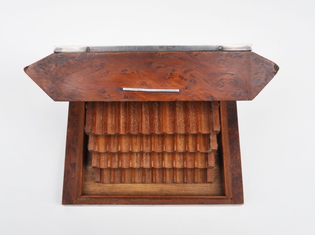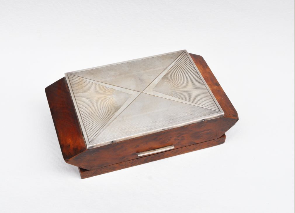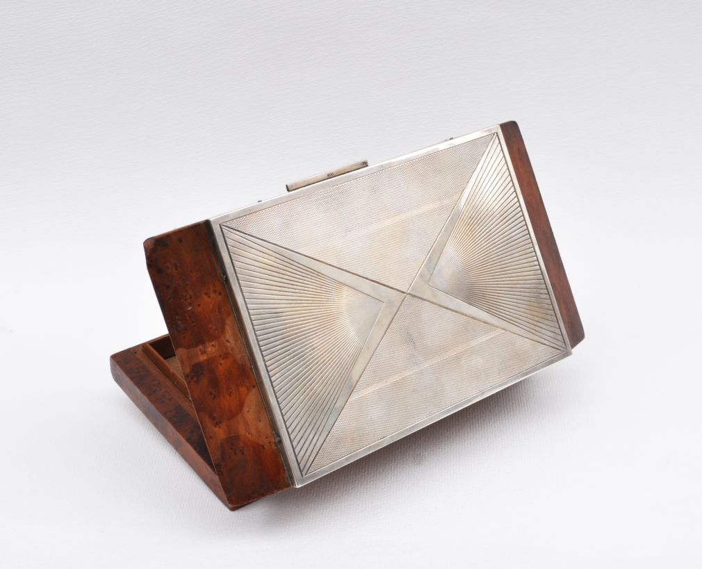 kubistická dřevěná kazeta na čtyřicet cigaret, ořechová dýha, víko ozdobené gilošovaným a gravírovaným stříbrným krytem, Ag btto 741,75 g/800/000, kolem roku 1920, střední Evropa; výška 5,7 cm, výška otevřené kazety 12,5 cm, délka 19,7 cm, šířka 11 cm; atest Puncovního úřadu; dobrý původní nerestaurovaný stav