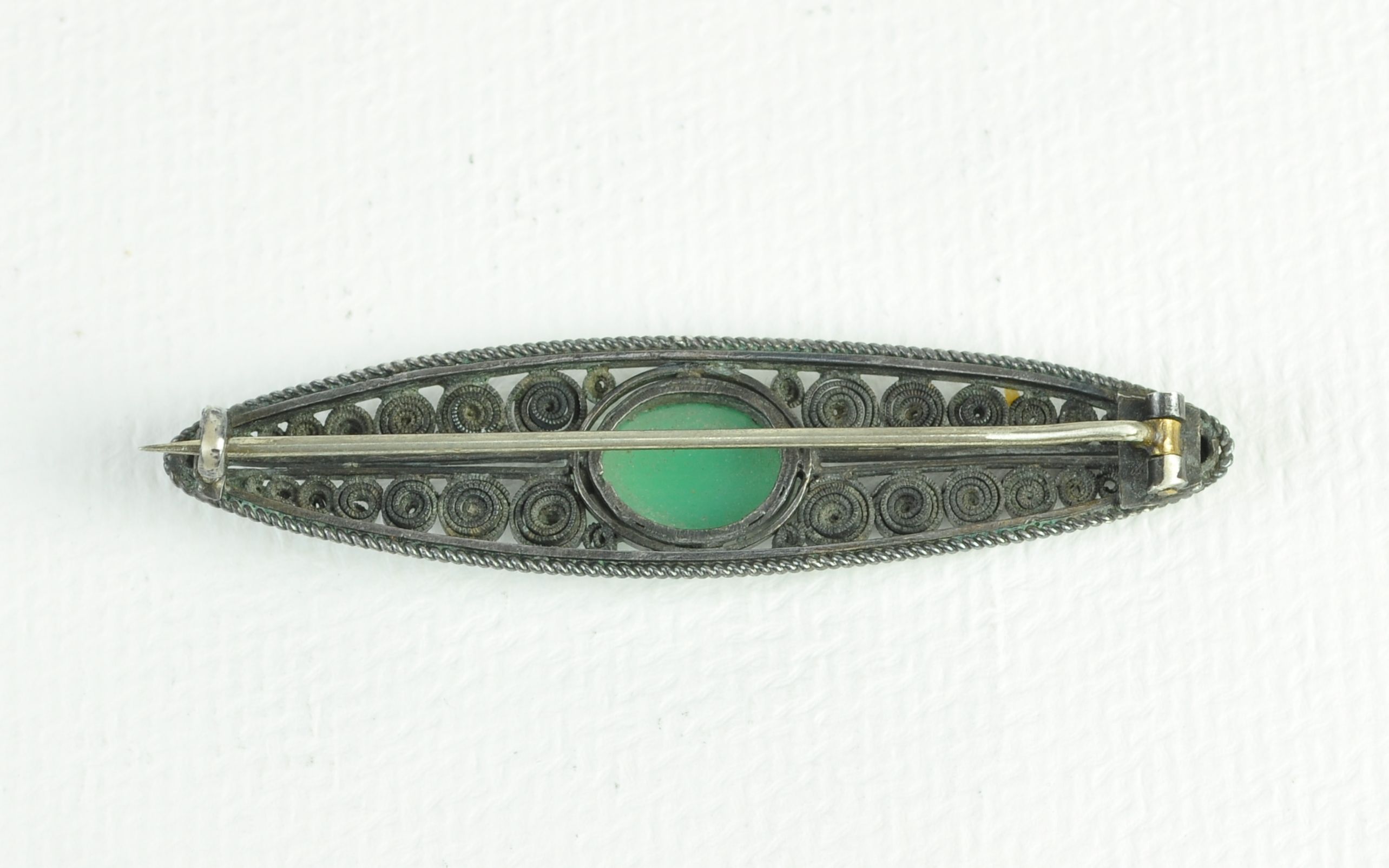 stříbrná podlouhlá brož elipsového tvaru s chrysoprasem, Ag btto 7,20g/835/000, podle návrhu Marie Křivánkové zhotovil pražský zlatník Antonín Pešula, značeno; kolem r. 1915, atest Puncovního úřadu, sběratelsky zajímavá