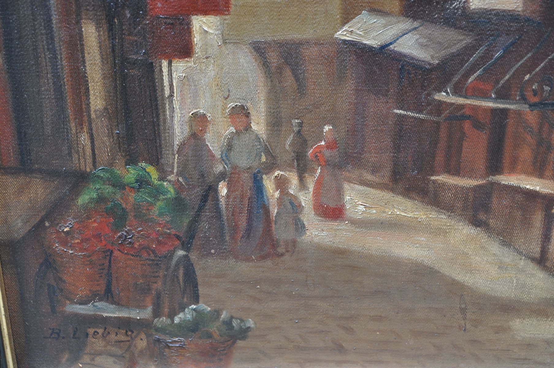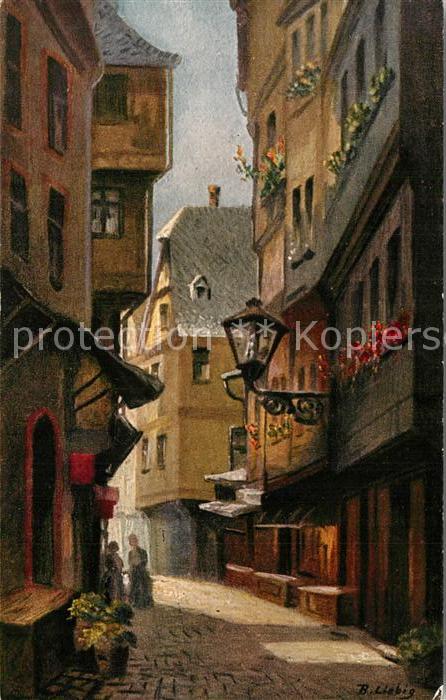 romantická stará ulička z Frankfurtu nad Mohanem, olej na plátně, 64x42 cm, v původním nerestaurovaném stavu, kolem roku 1910, signováno; Georg Bernhard Liebig (1873-1937), německý malíř a grafik; jeho práce byly reprodukované v edici dobových pohlednic; náš obraz je velmi příbuznou verzí malby stejného místa na přiloženém snímku staré pohlednice