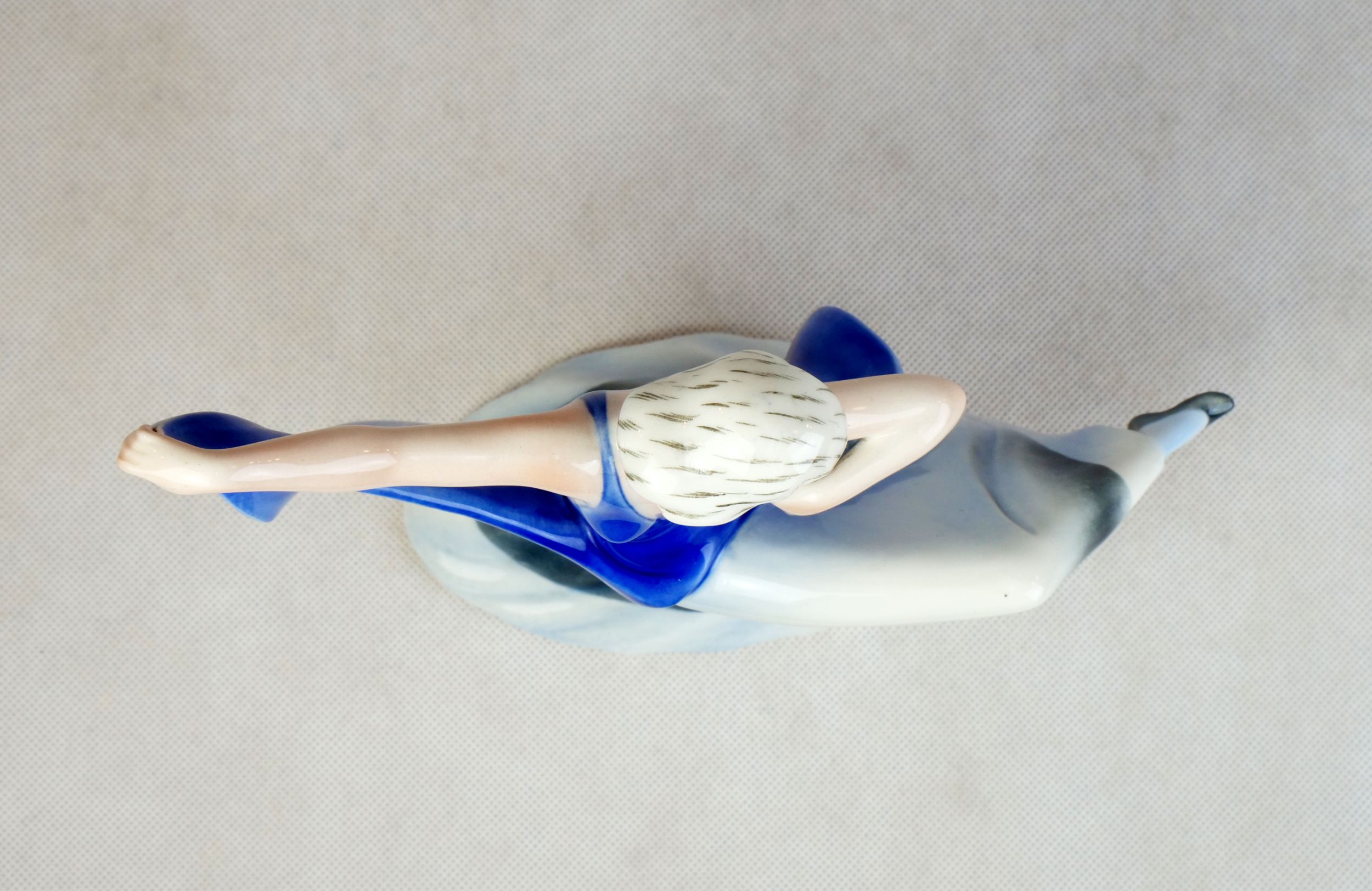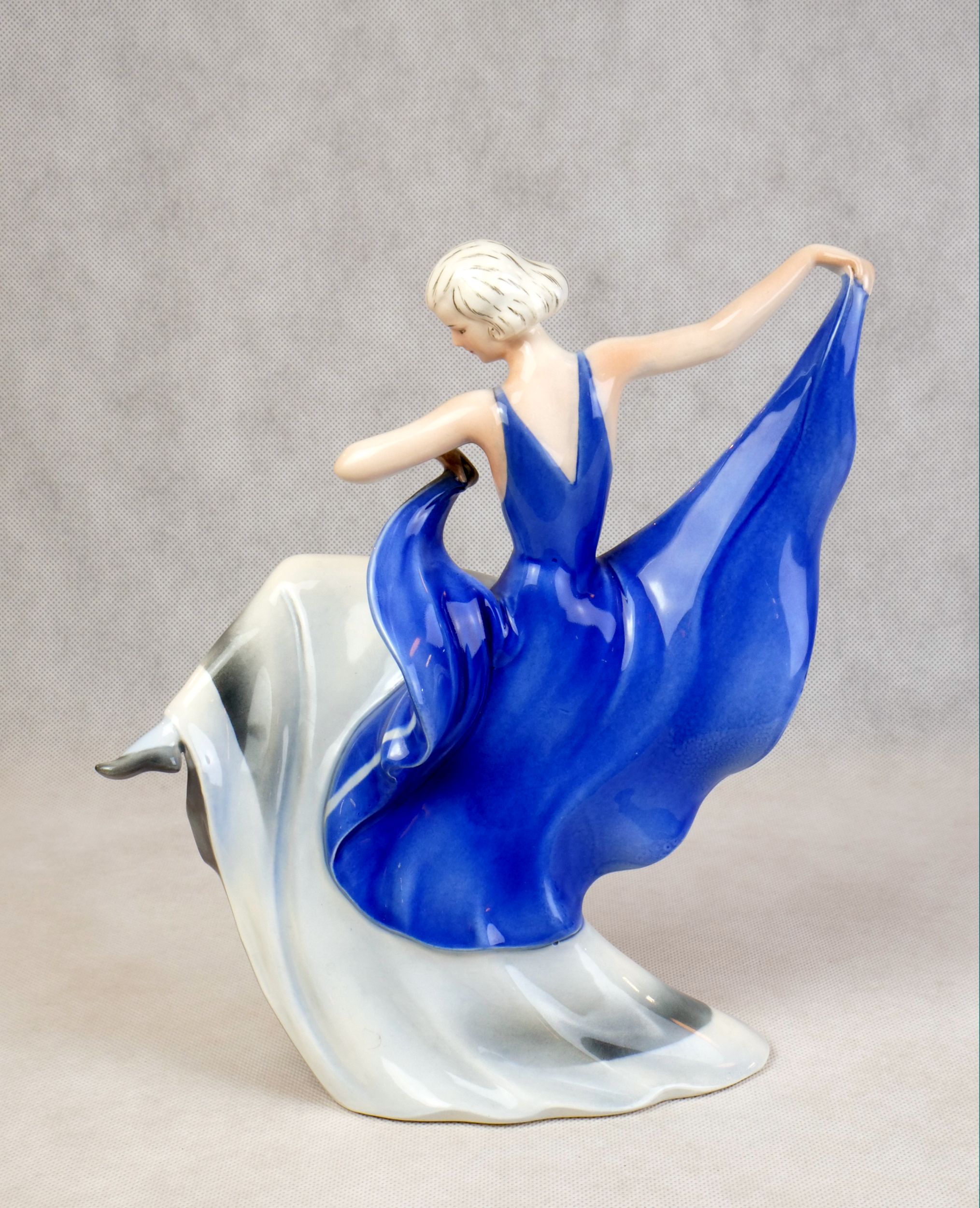 soška tančící dívky, barevná tvrdá kamenina, kolem roku 1930 vyrobila továrna Porzellanfabrik Hertwig & Co. v durynském Katzhütte, výška 25,5 cm