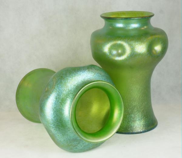 dvojice mohutných secesních váz šumavské sklárny Loetz z Klášterského Mlýna, promačkávané irisované sklo, dekor Delphi, kolem roku 1910; výška 32,5 cm, průměr hrdla 15 cm
