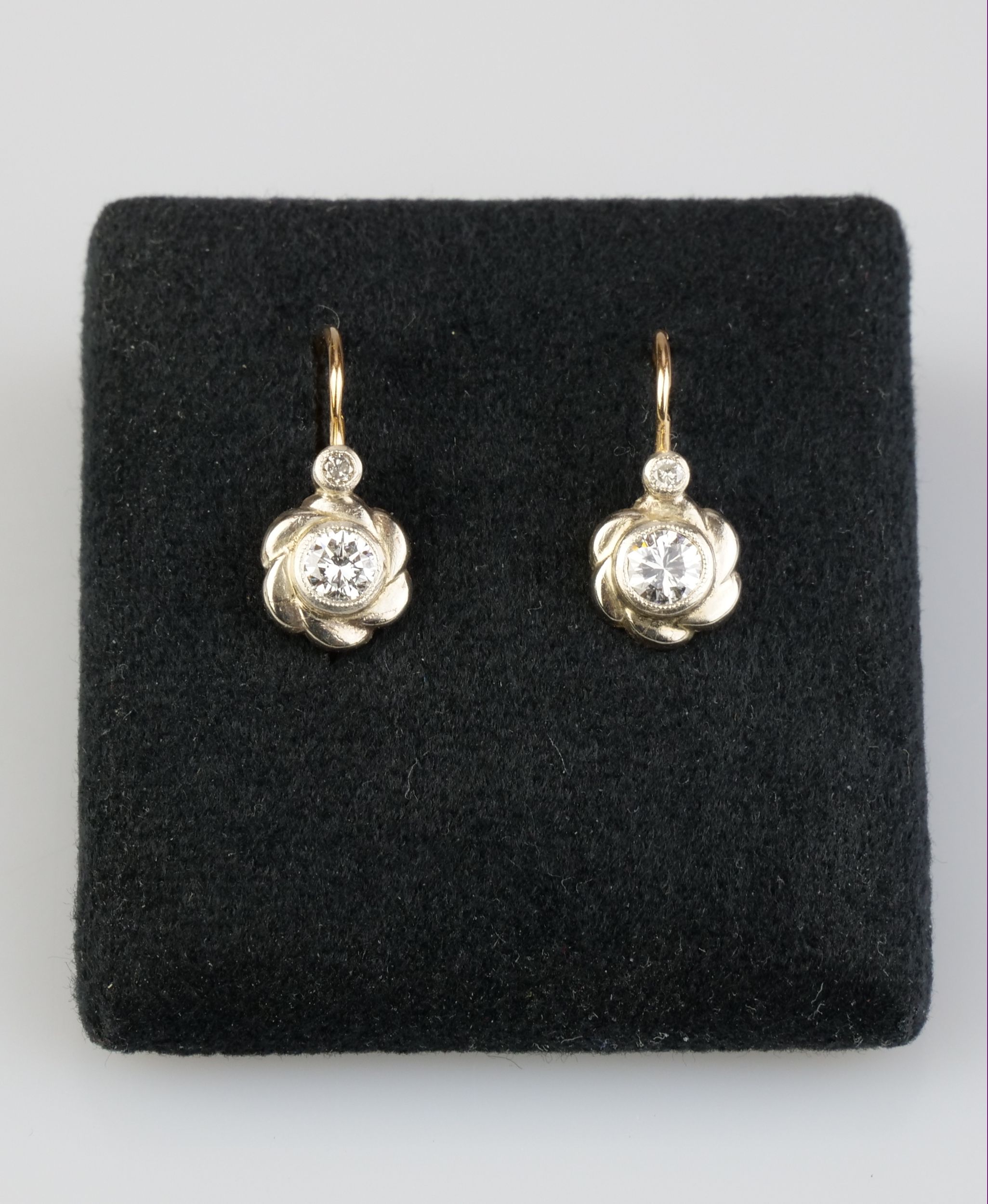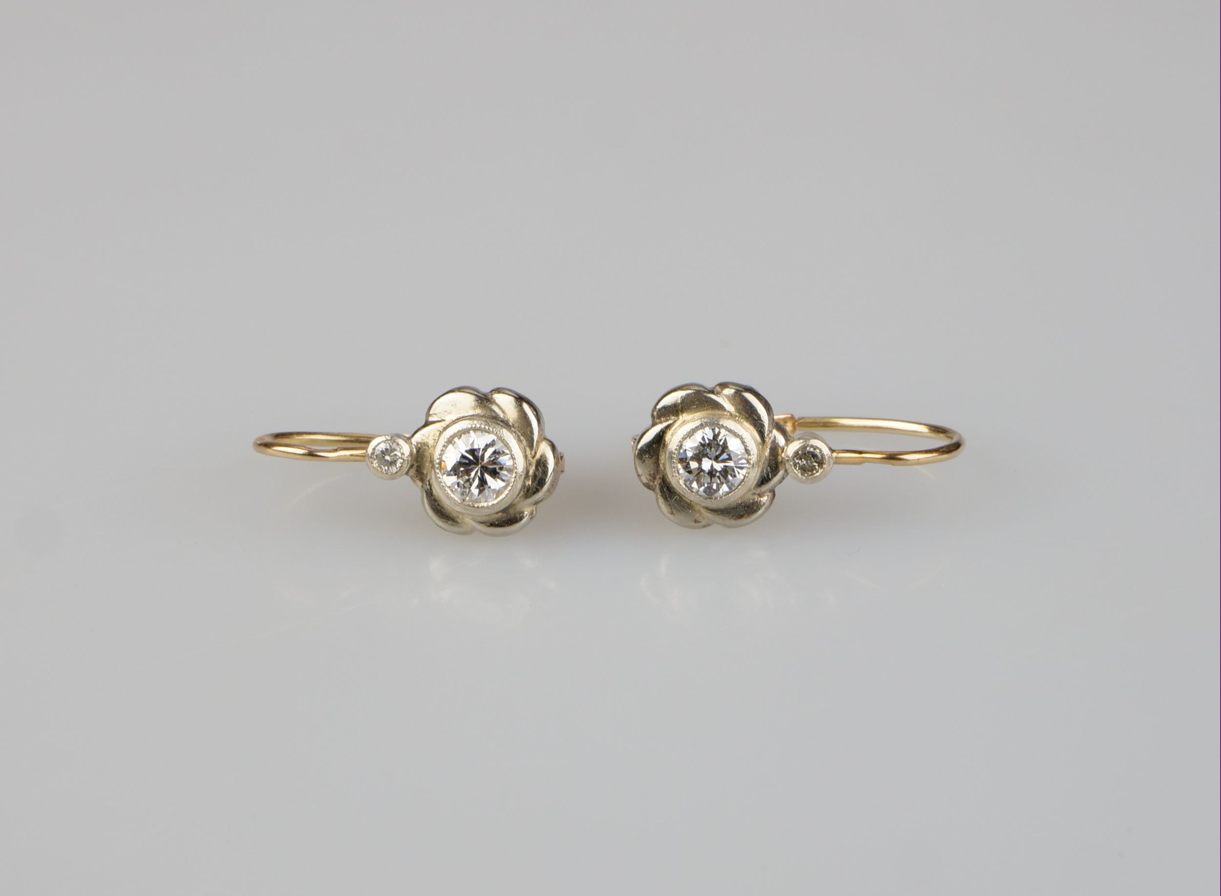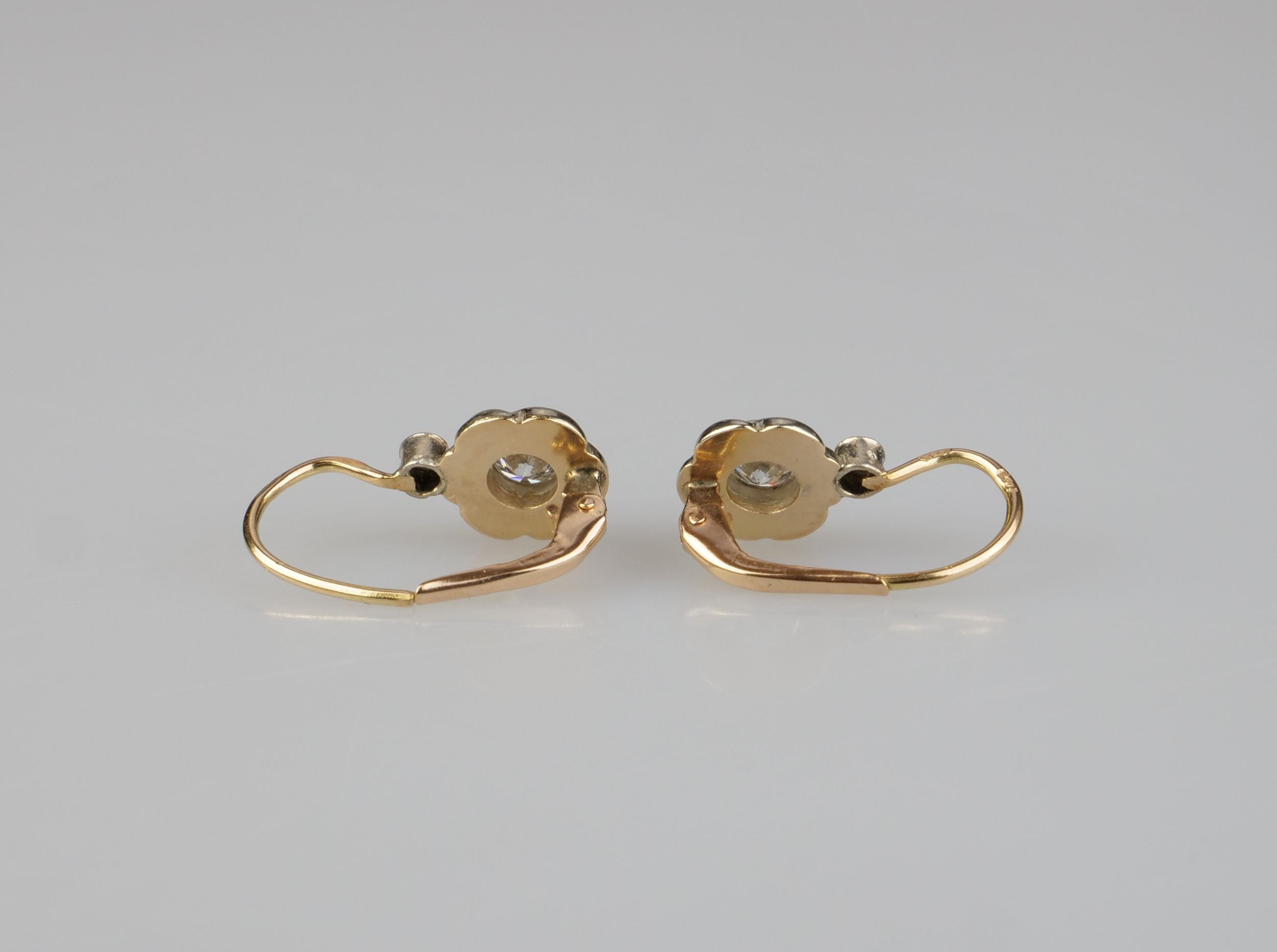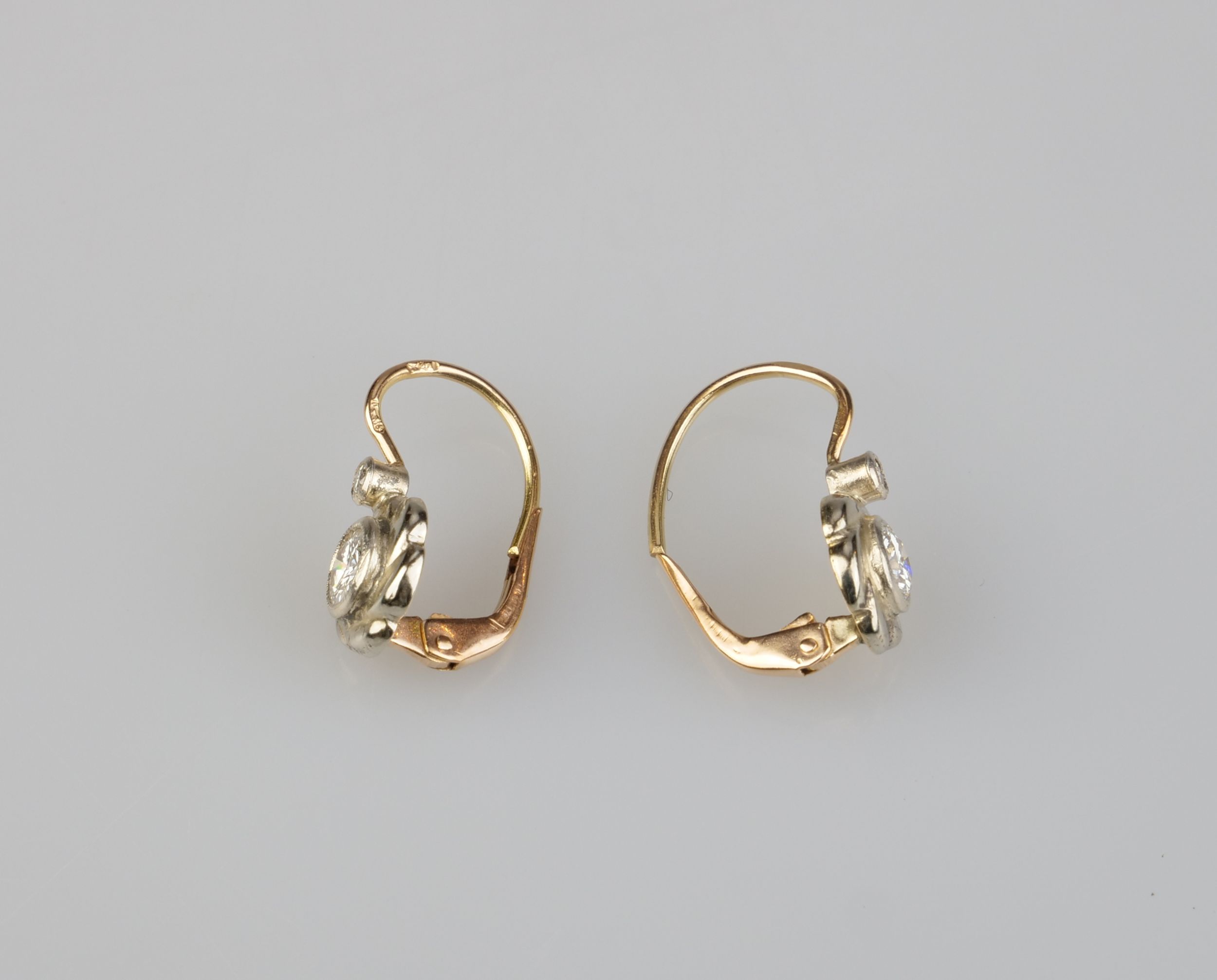 zlaté náušnice s diamanty briliantového brusu o celkové hmotnosti cca 0,4 ct, Au btto 1,62 g/580/000, Maďarsko, kolem r. 1935; puncováno rakousko-uherským puncem platným v Maďarsku do r.1936; délka 1,8 cm