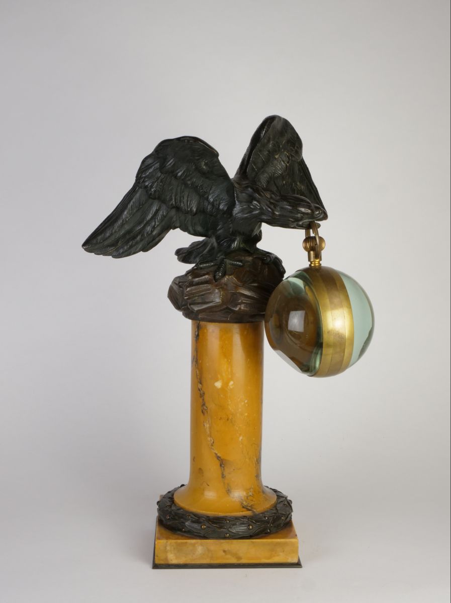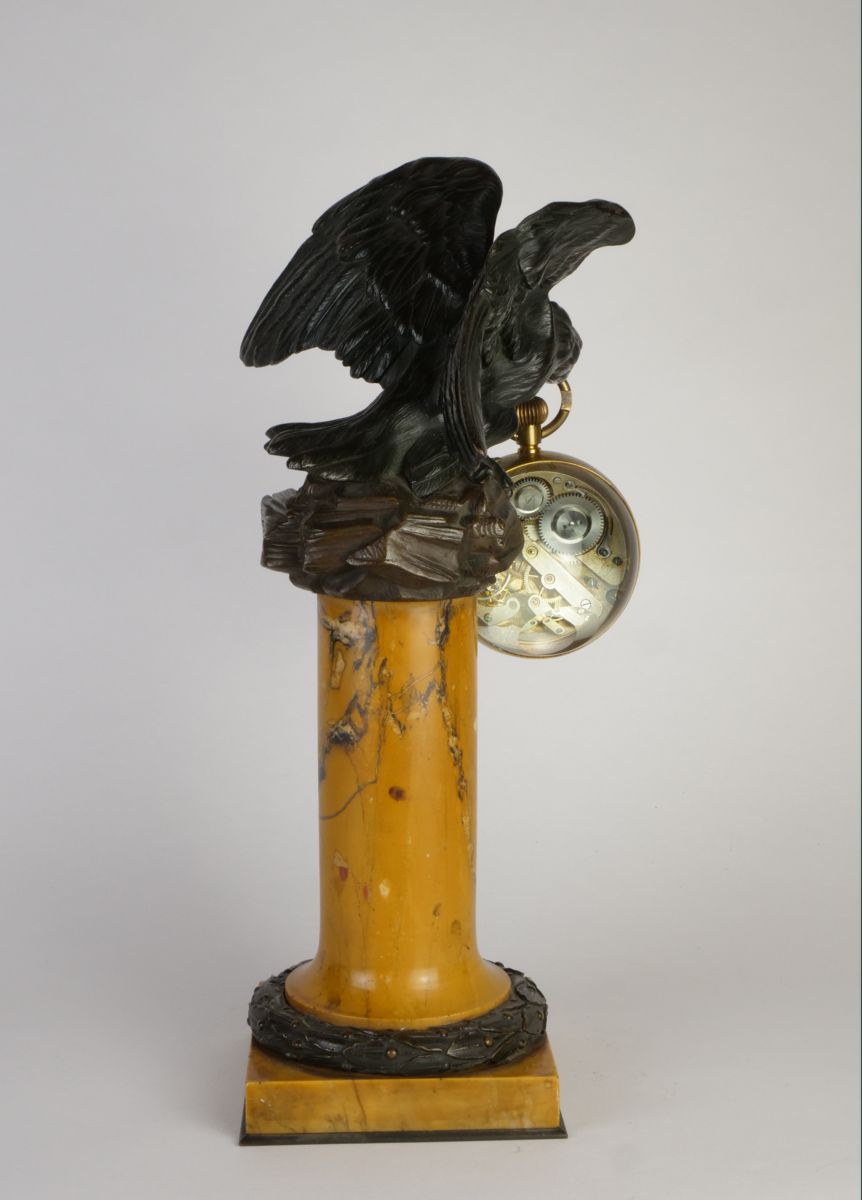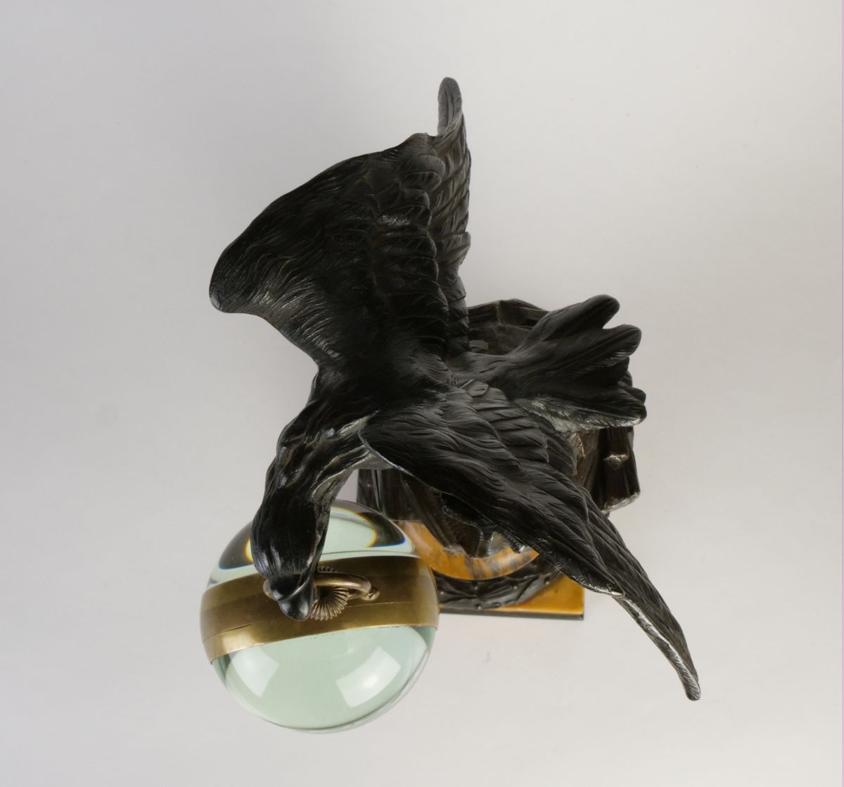 bronzová figura orla na mramorovém podstavci, v zobáku nese kulovité oboustranně prosklené hodiny, Francie, kolem roku 1890, výška 37 cm, průměr hodin 9 cm