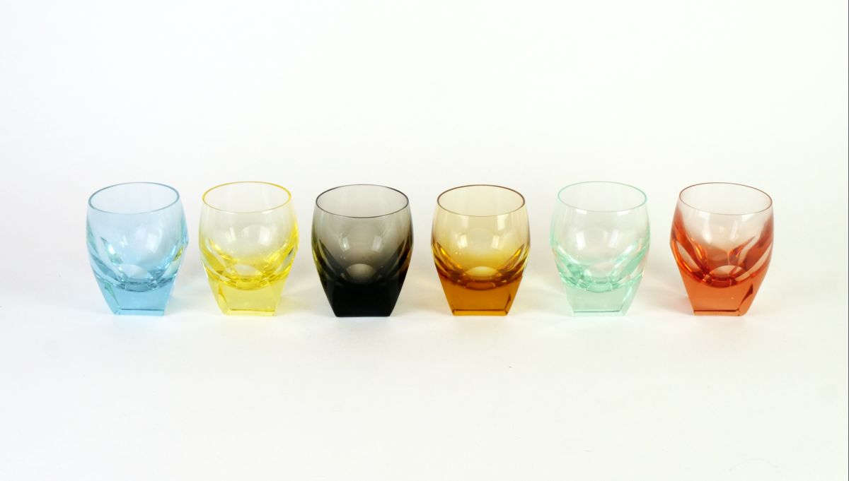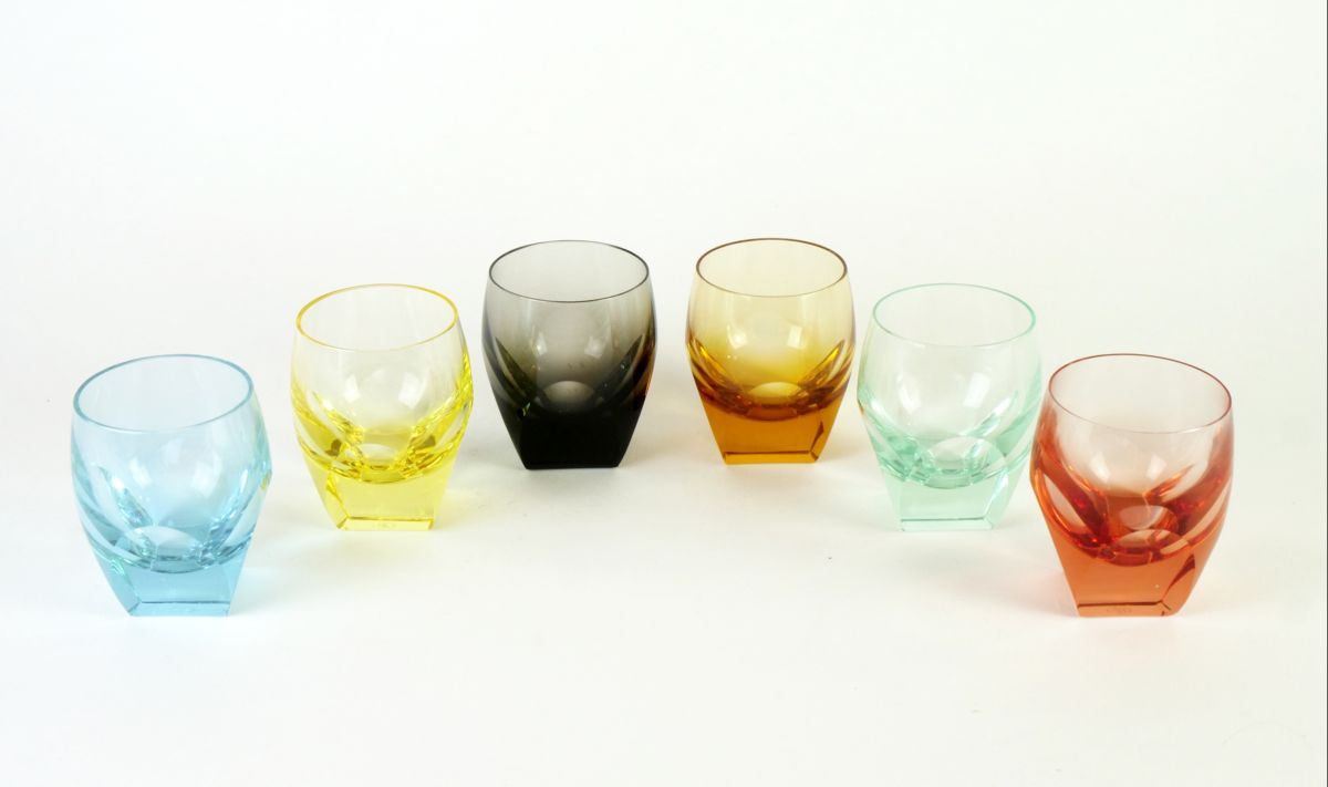 šest art deco likérových kalíšků z různě barevného broušeného skla, model z r. 1934, design Rudolf Eschler, značeno Moser, Československo, výška 7,5 cm, průměr 6 cm; z majetku evropsky proslulého umělce