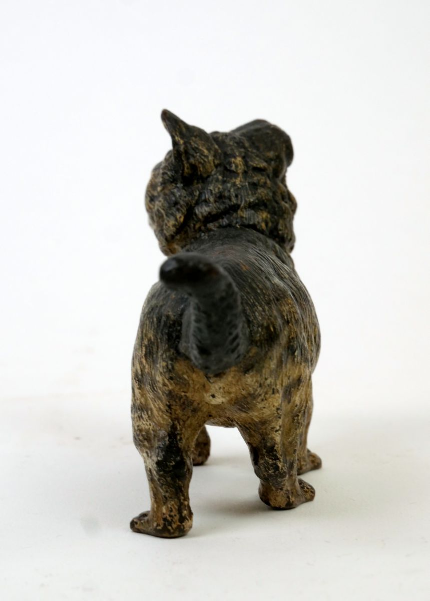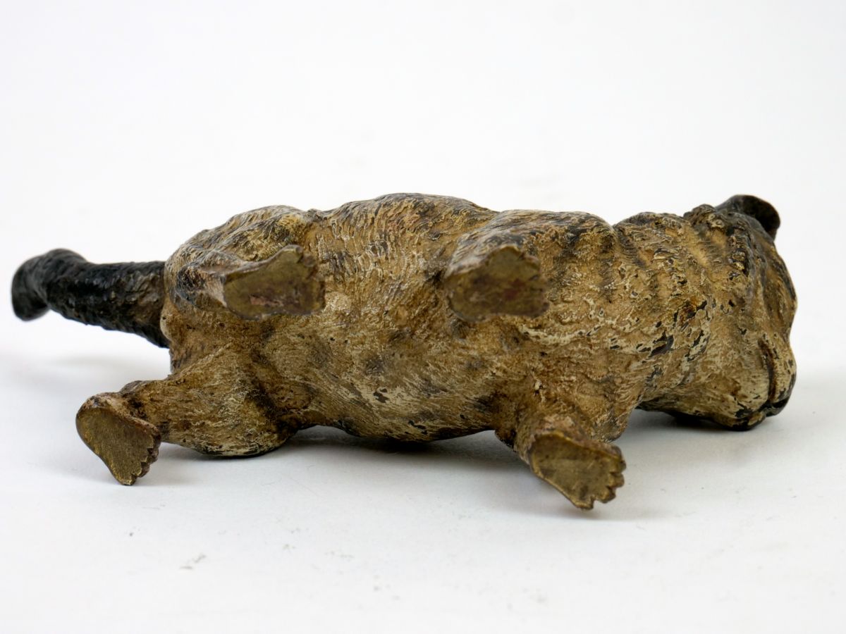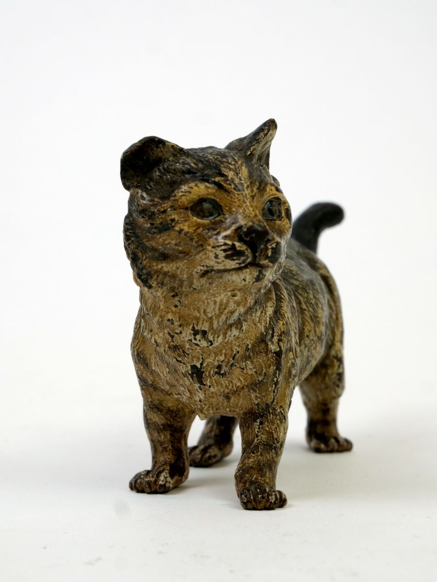 figurka kočky z kolorovaného vídeňského bronzu, Rakousko-Uhersko, kolem roku 1910; délka 13,5 cm; výška 7 cm