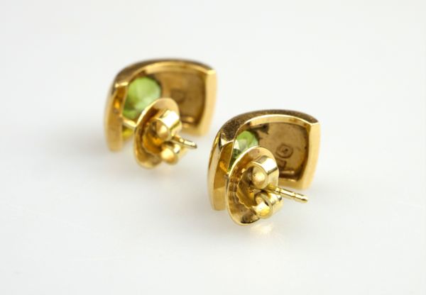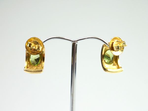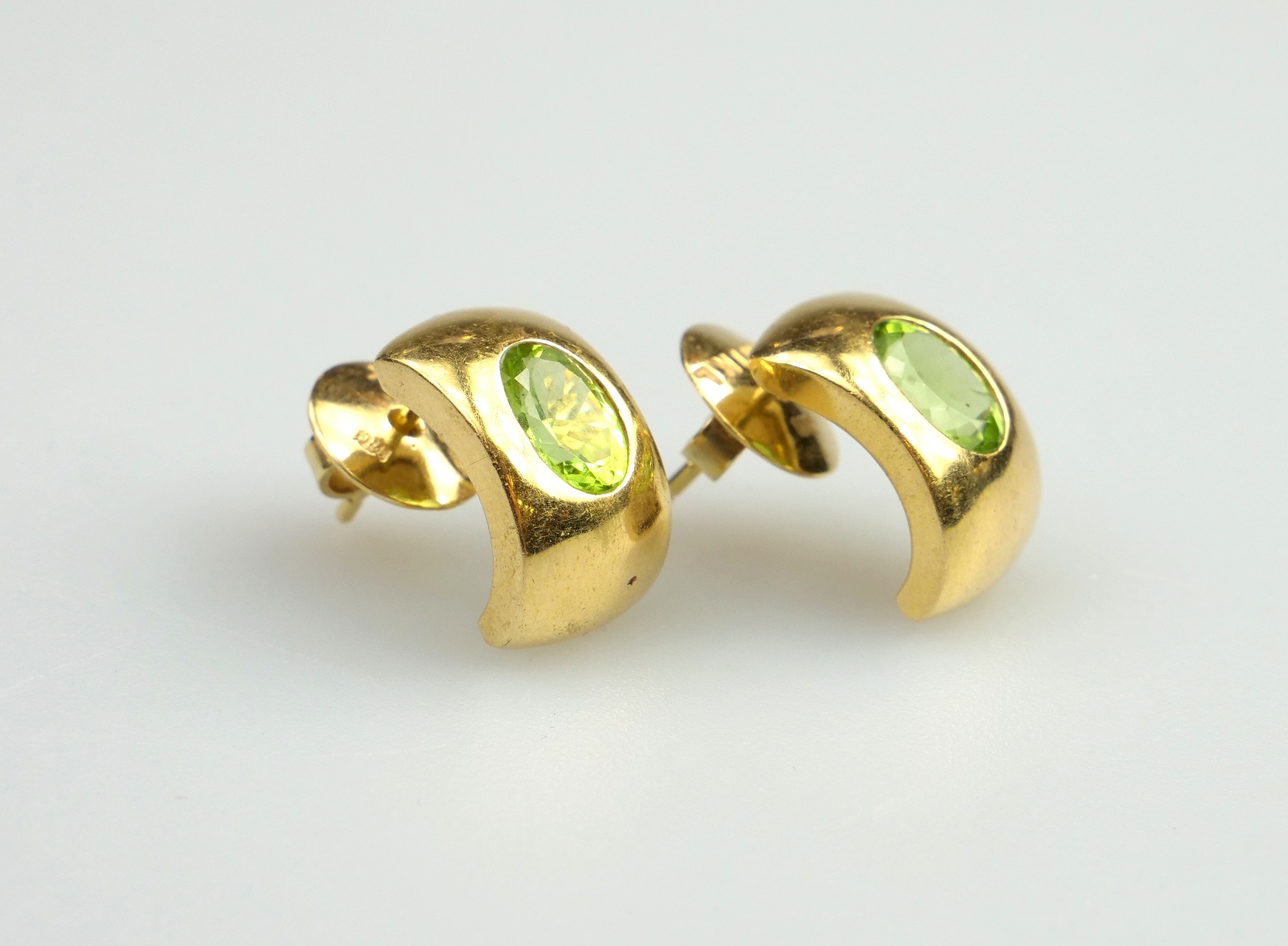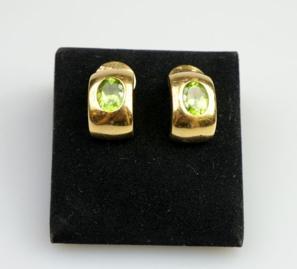 zlaté náušnice s peridoty (olivíny), Au btto 7,55g/585/000, západní Evropa, kolem r. 1995, délka náušnice je 1,5 cm, šířka 1,1 cm; současný český punc